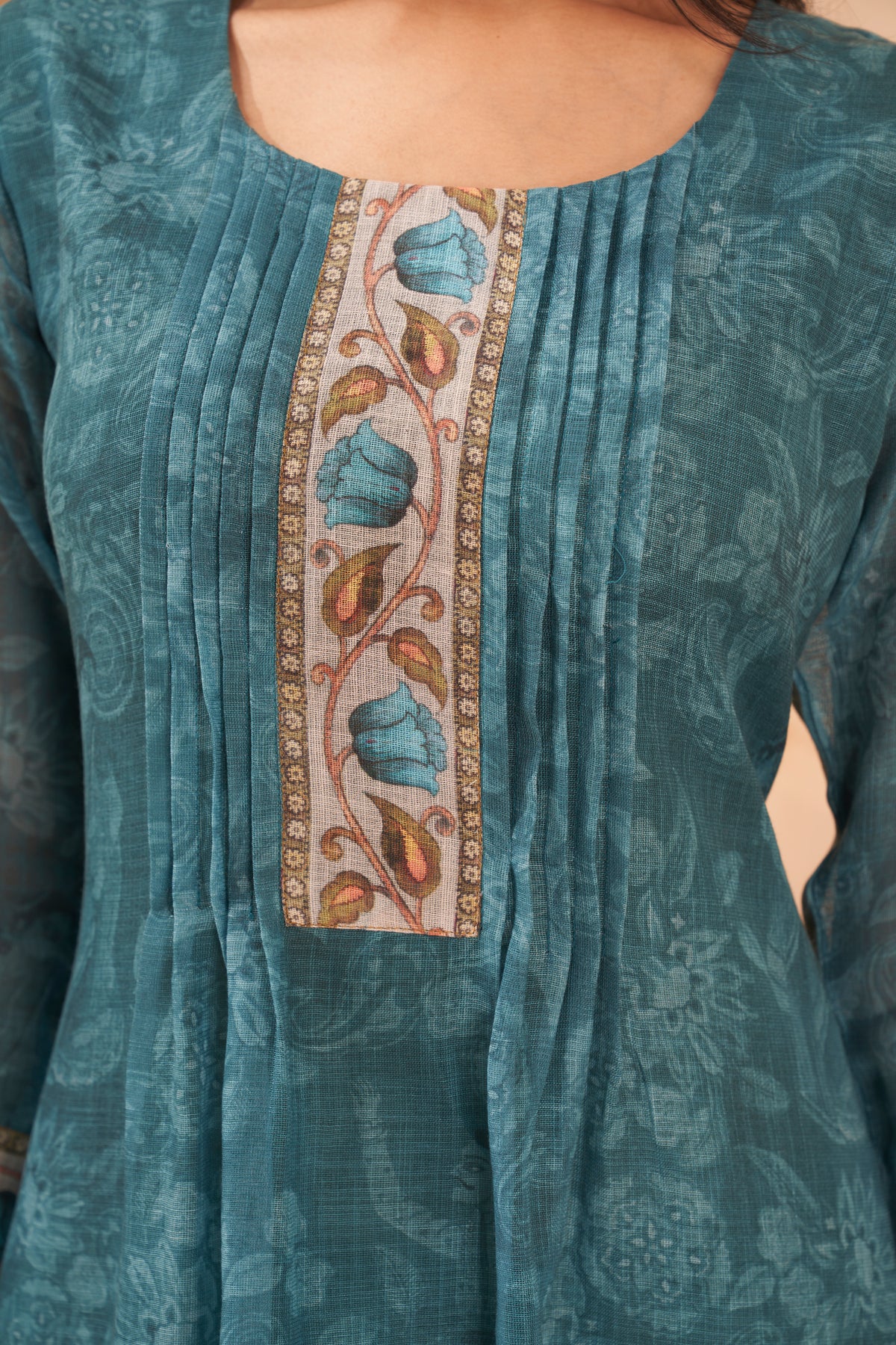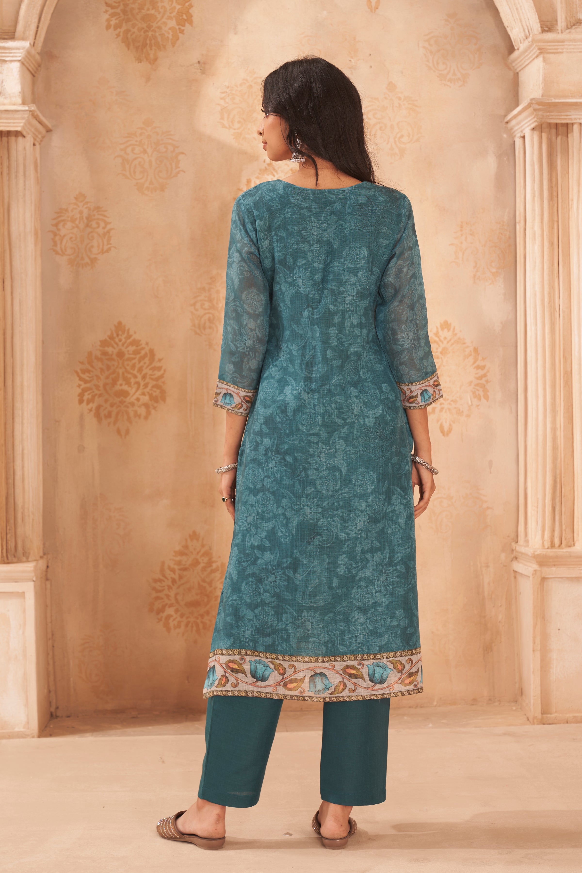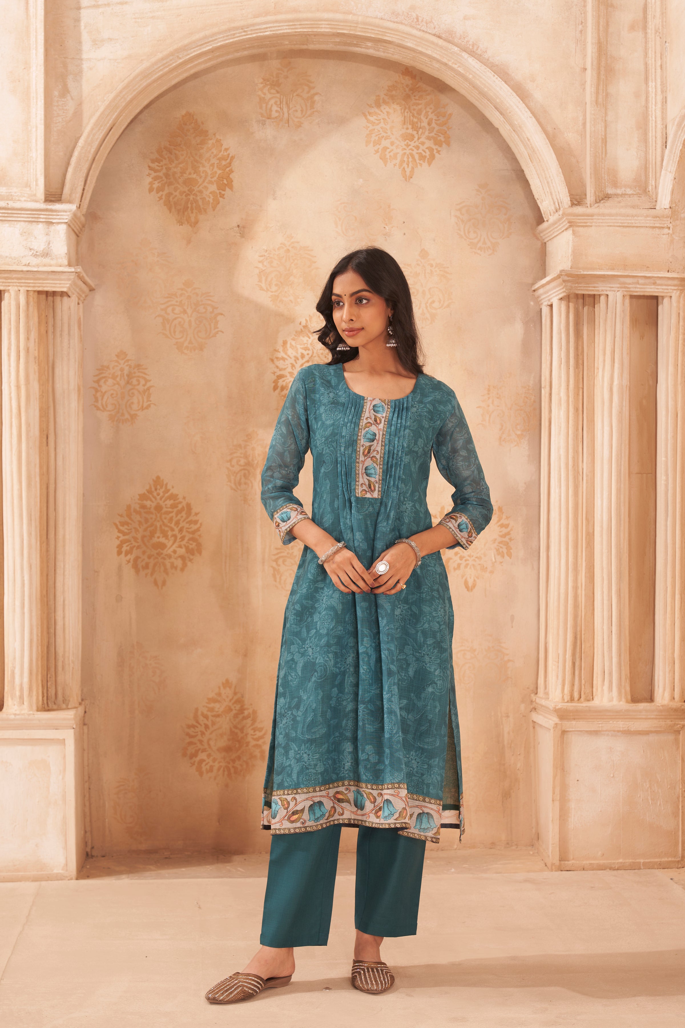 This suit set features detailed scenic prints inspired by classic artwork and storytelling scenes. Delicate floral borders frame the design, adding richness and visual depth. The prints flow beautifully, creating a calm yet expressive look. Every detail feels thoughtful, making the overall style elegant and timeless.