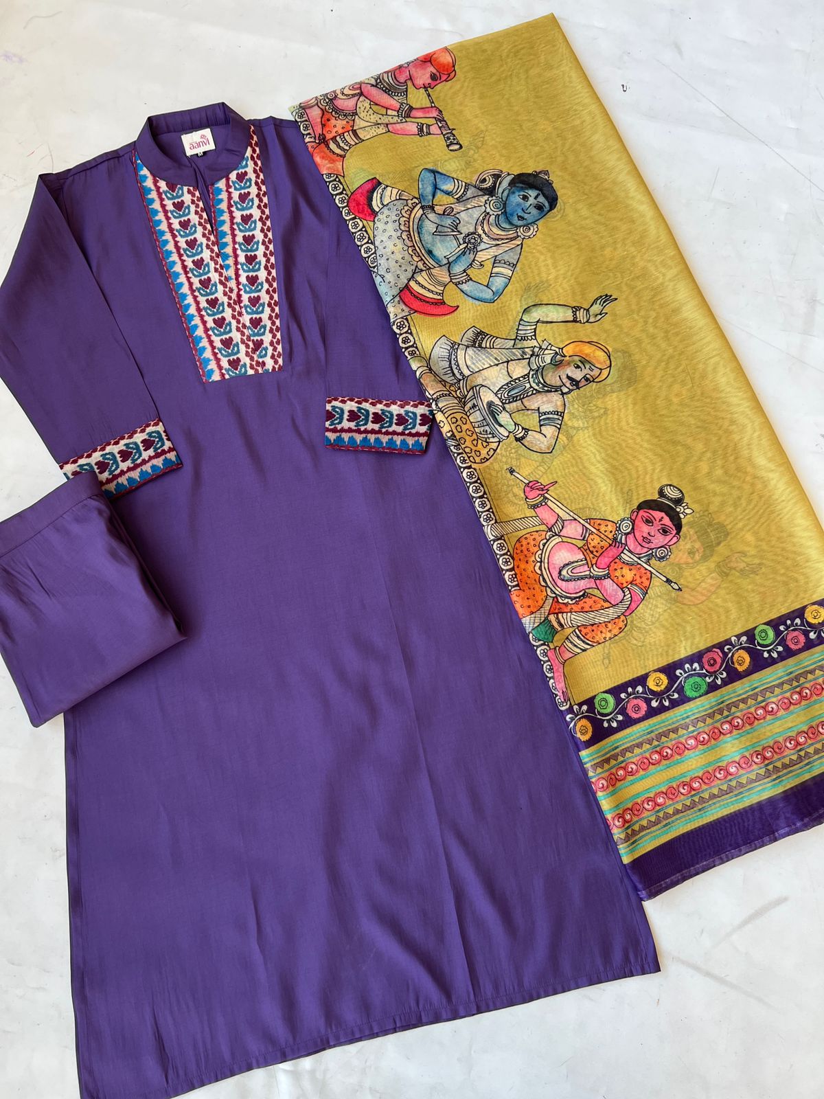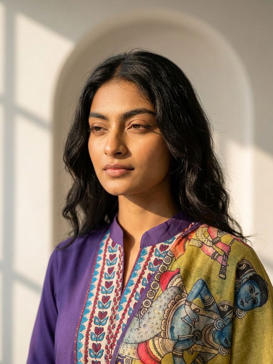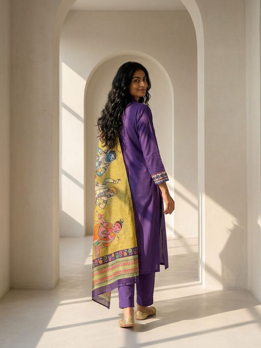 This outfit features beautiful traditional folk art style prints with colourful dancing figures that give it a cultural and festive look. The detailed artwork on the dupatta adds a vibrant storytelling feel to the design. The kurta has neat geometric and floral inspired prints on the neckline and sleeves, adding a stylish contrast. Overall, the prints create a unique blend of traditional art and modern elegance.