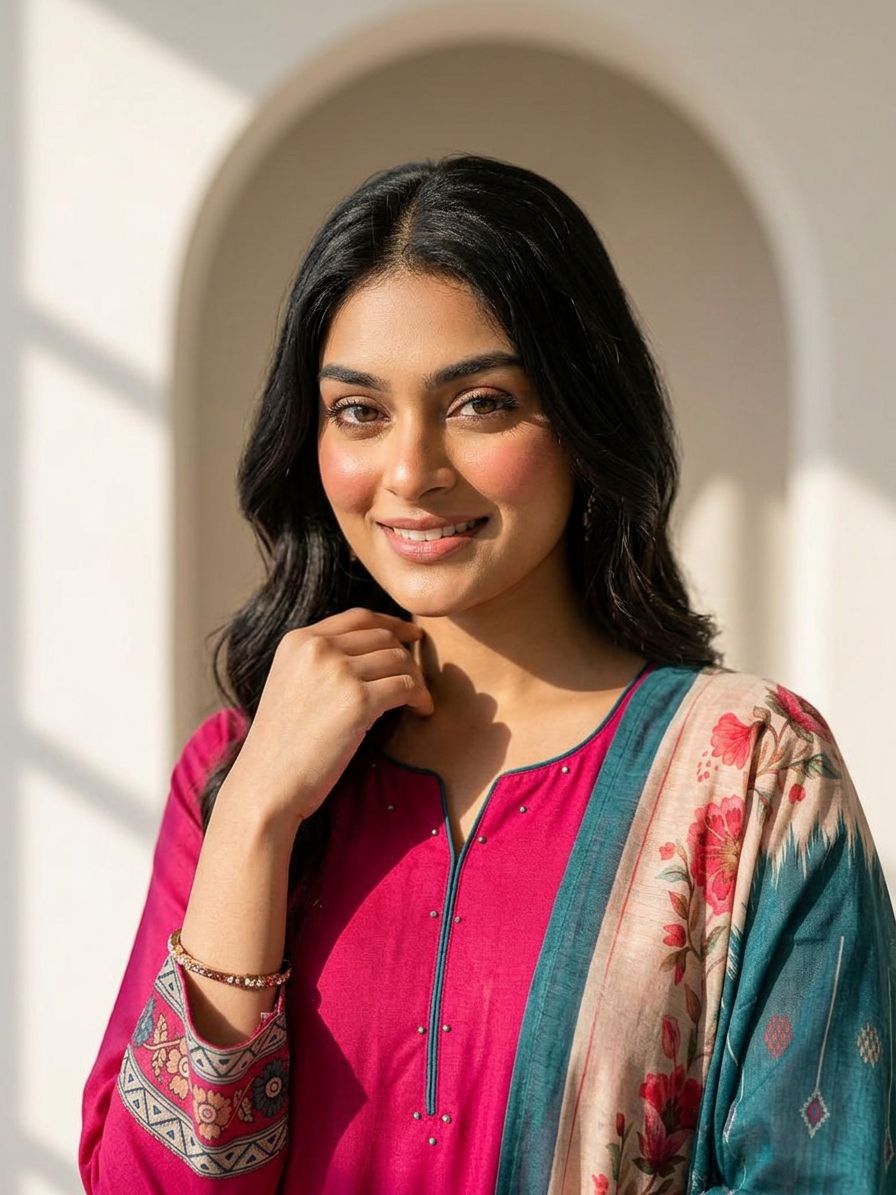 Bright and beautiful prints come together in this eye-catching set. The kurta features delicate floral border details that add a graceful touch. The dupatta stands out with bold floral motifs and unique patterned accents. A perfect mix of vibrant colors and elegant prints for a fresh, festive look.