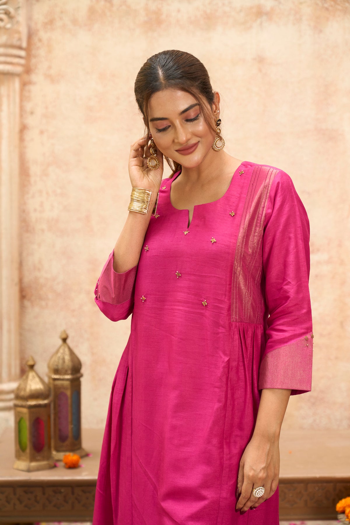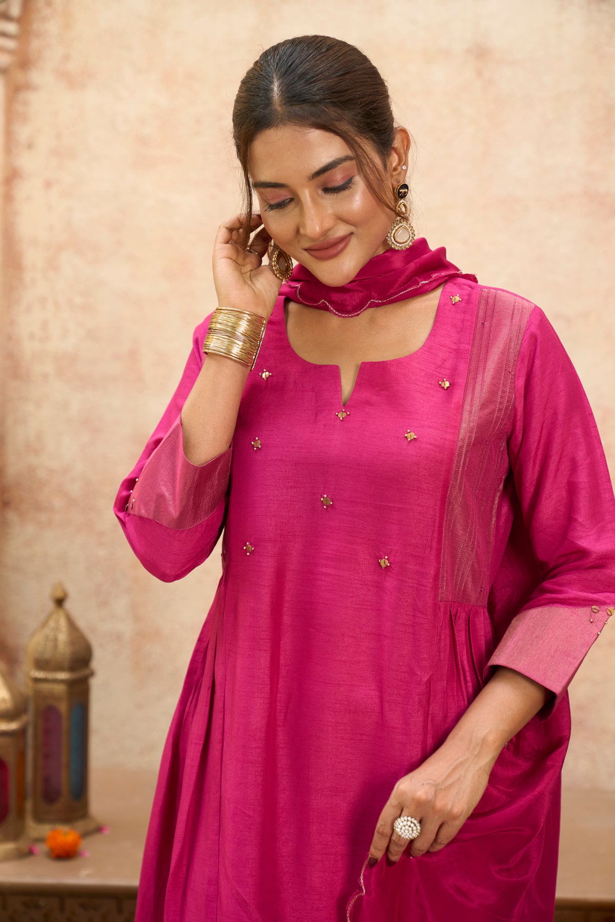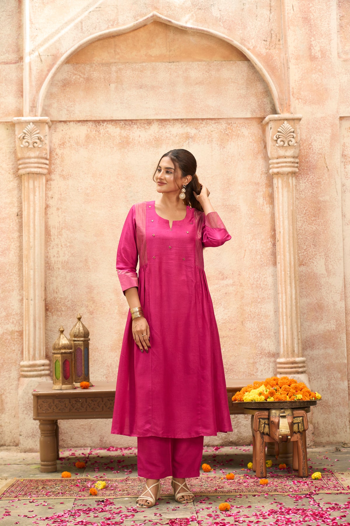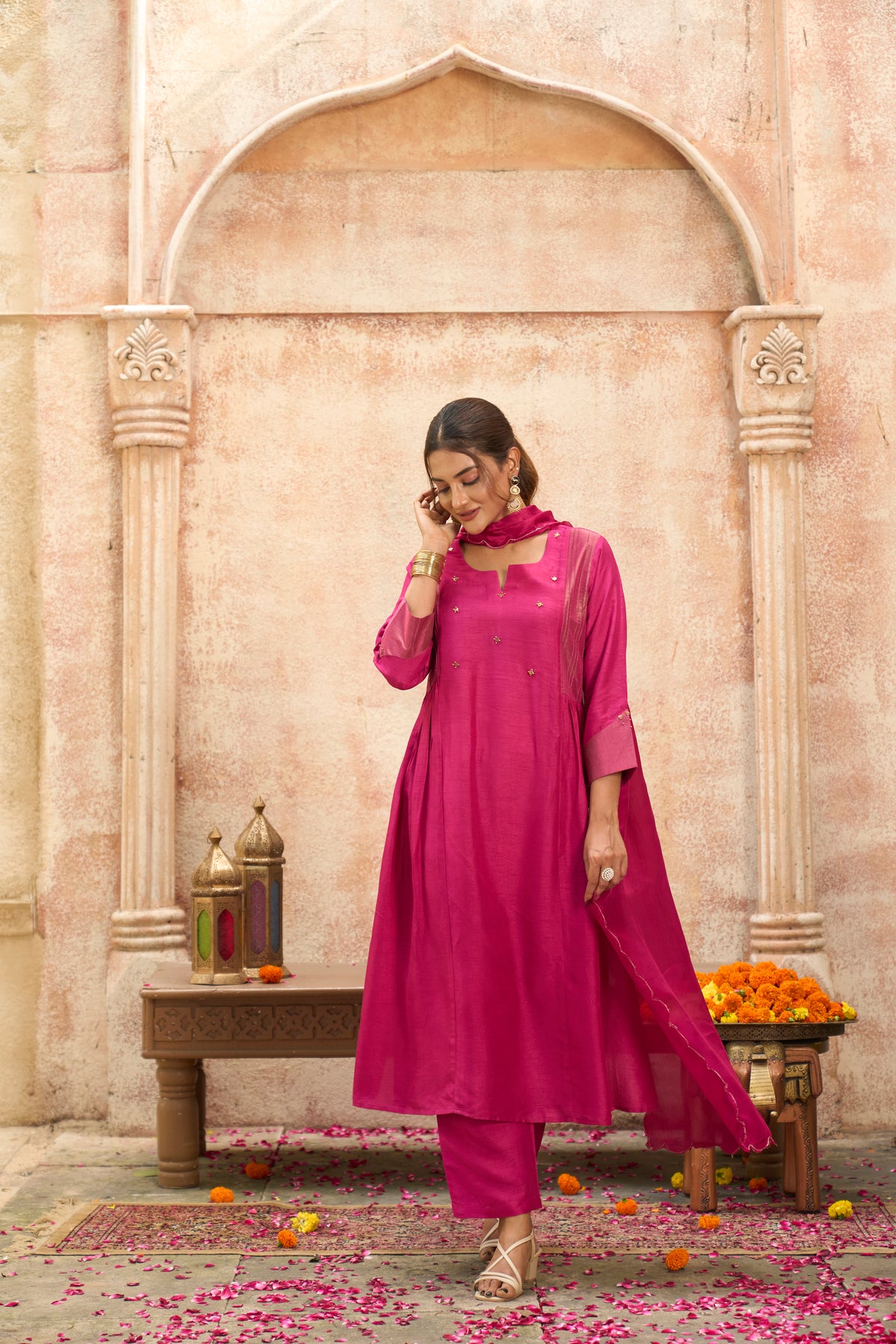 This elegant suit set is crafted in pure dola silk with subtle tissue detailing on the kurta that adds a soft shine. The look is completed with a beautifully finished scallop-edged dupatta, giving it a graceful and festive charm. Perfect for celebrations where you want to keep it simple yet striking.