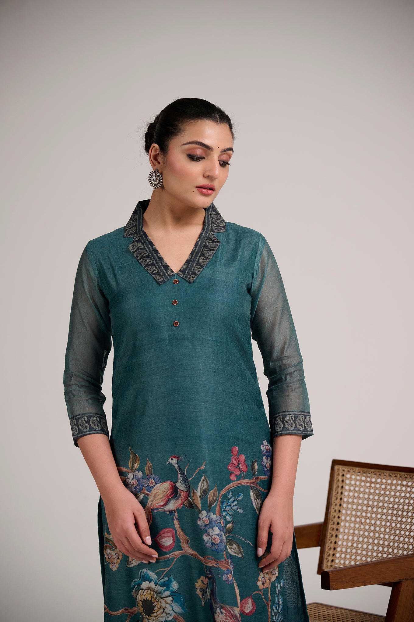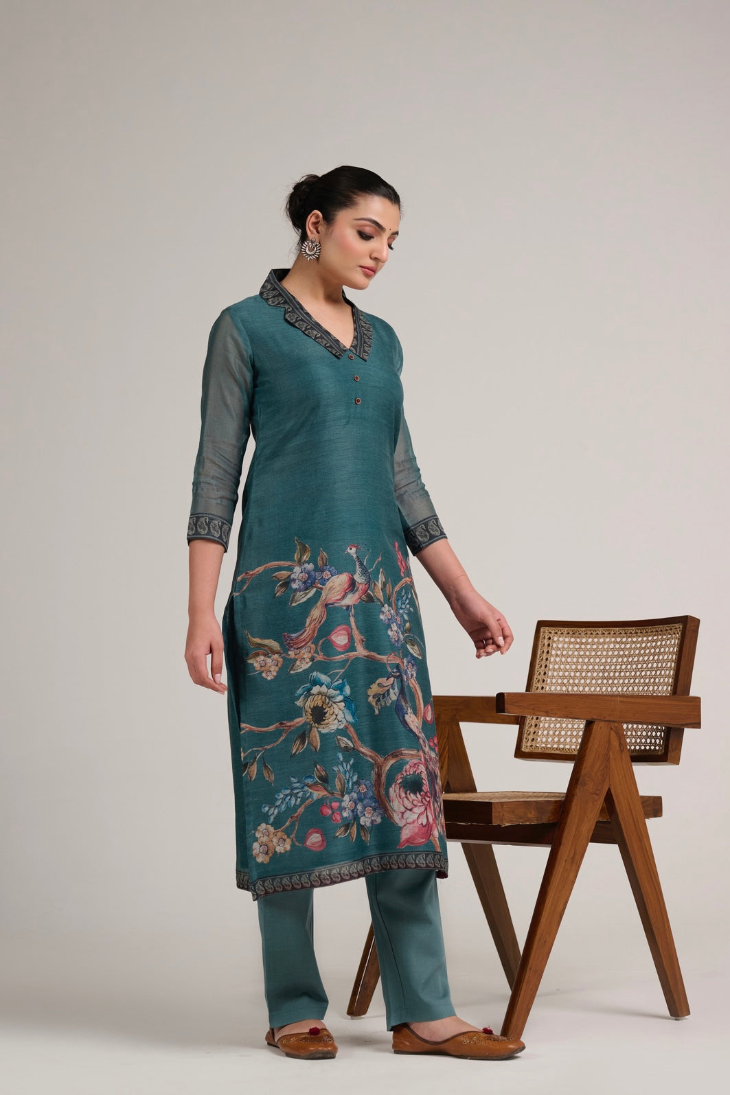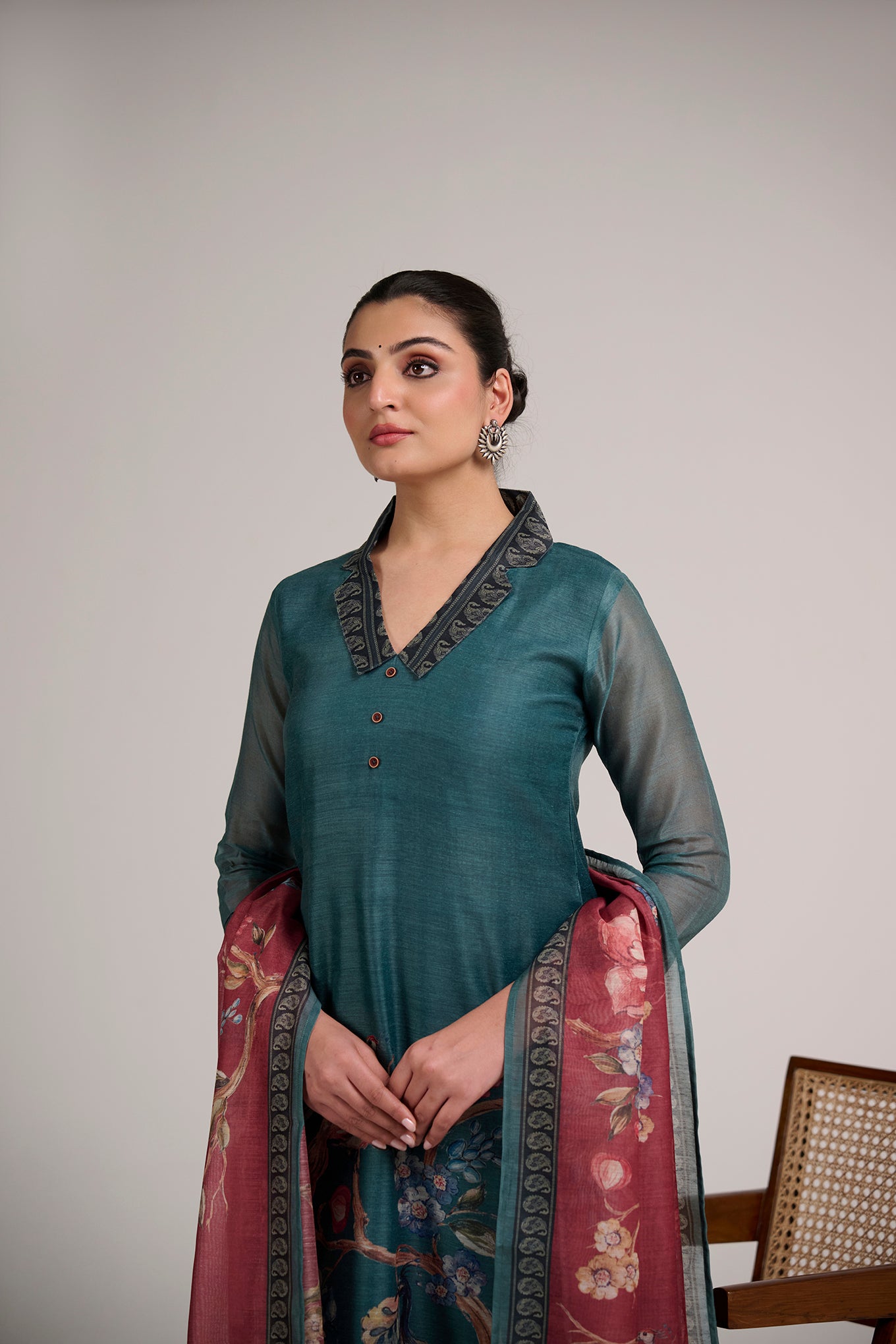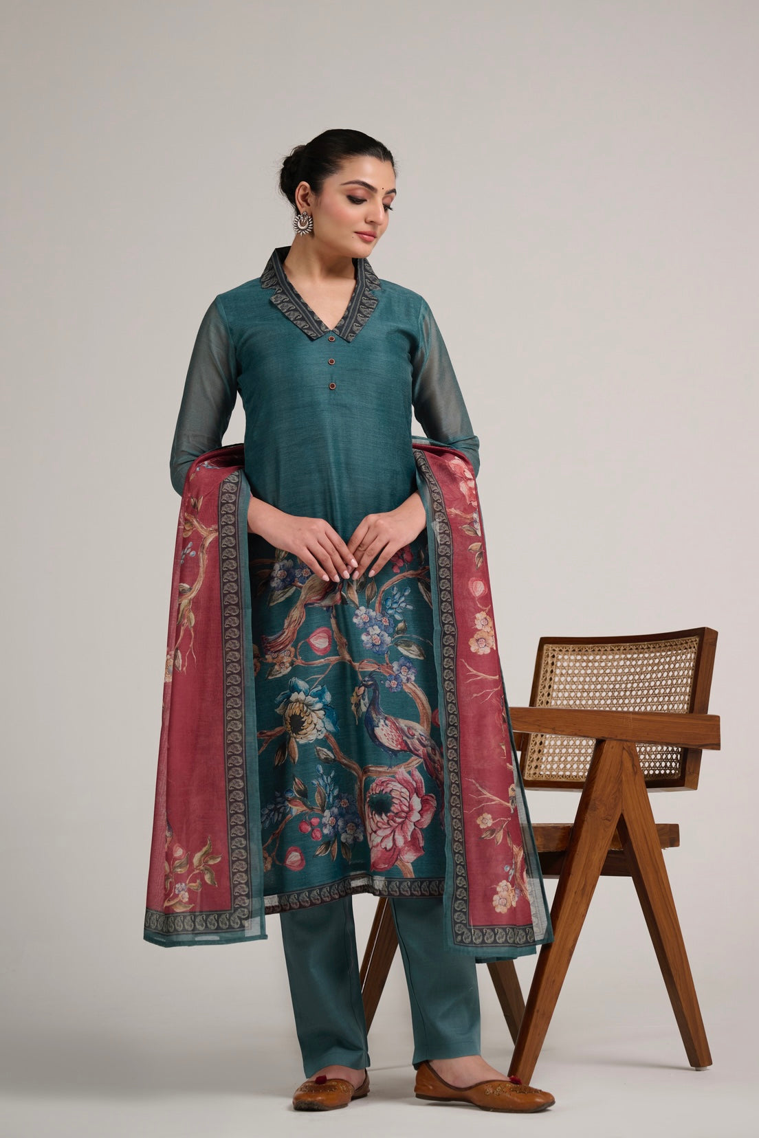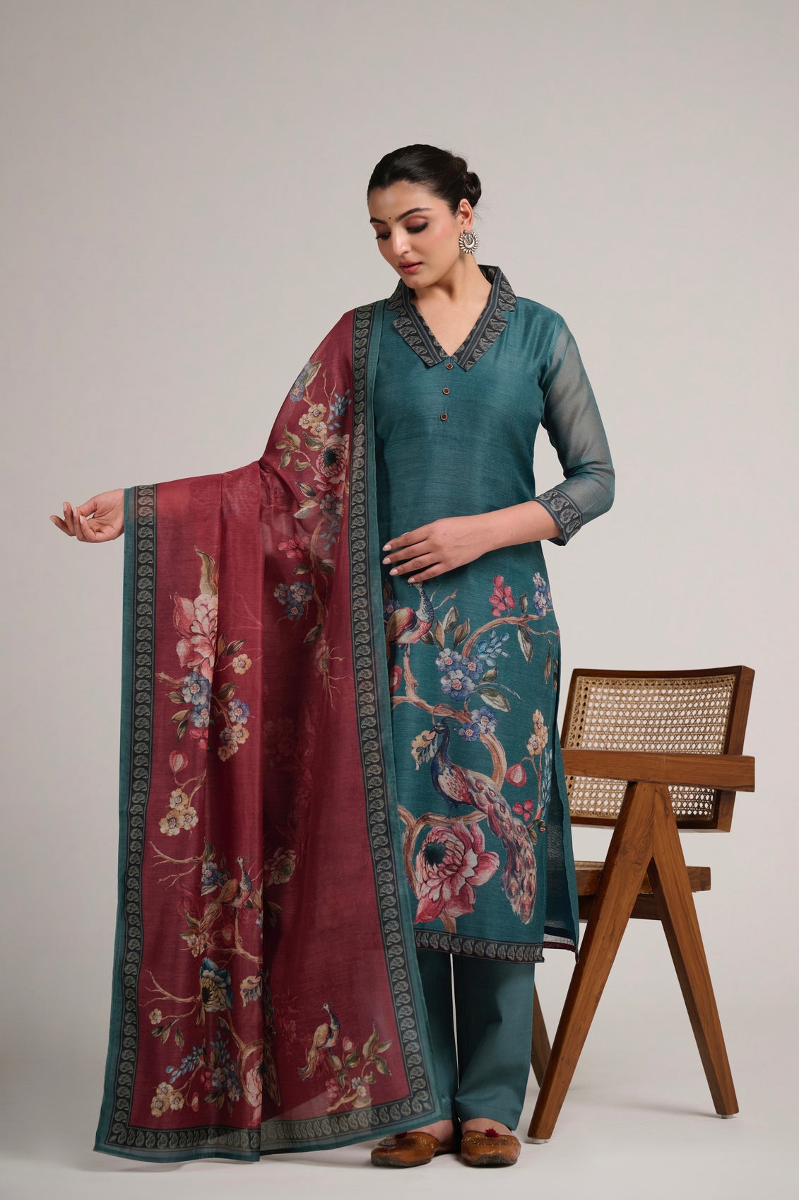 This elegant teal green suit set features graceful floral and bird prints blooming across the lower kurta in soft shades of pink, blue, and ivory, paired beautifully with a rich wine red dupatta adorned with detailed floral vines and framed with complementing borders, creating a striking yet balanced contrast that feels refined, artistic, and timeless.