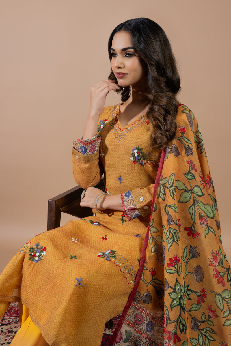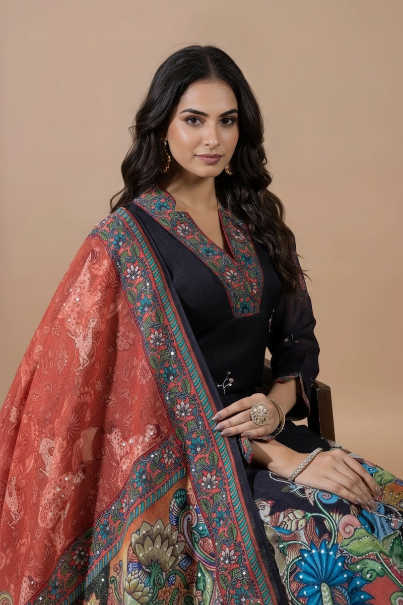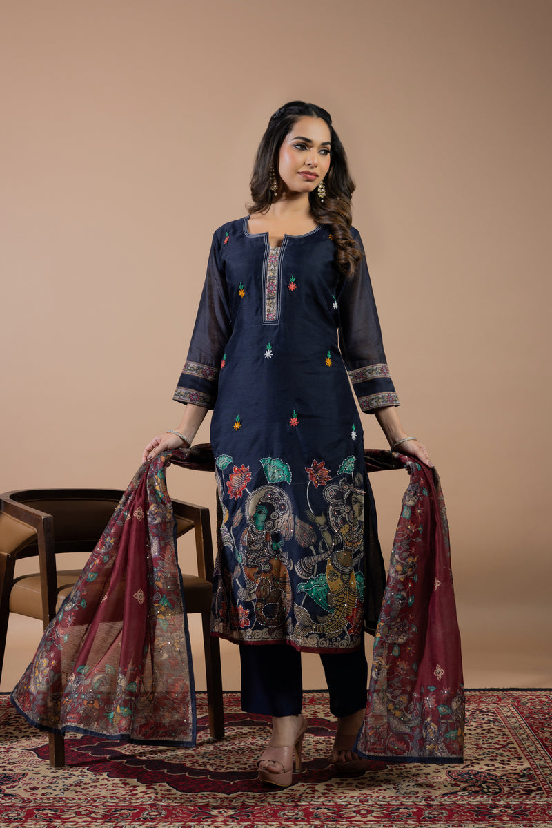 Kalamkari Suit Set: The classic artwork adorned with hand-painted designs and mythological narratives, showcases India's rich artistic legacy.