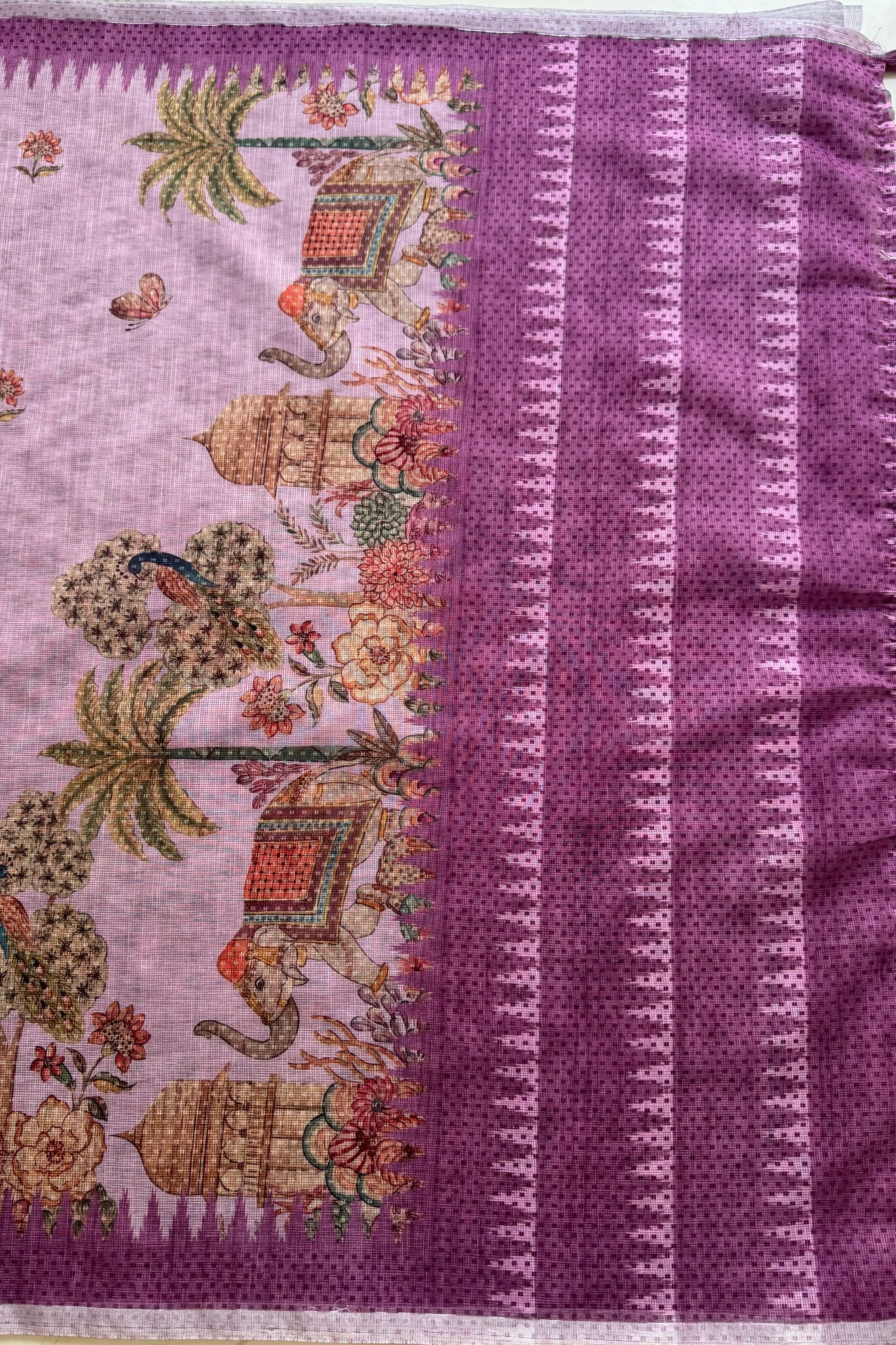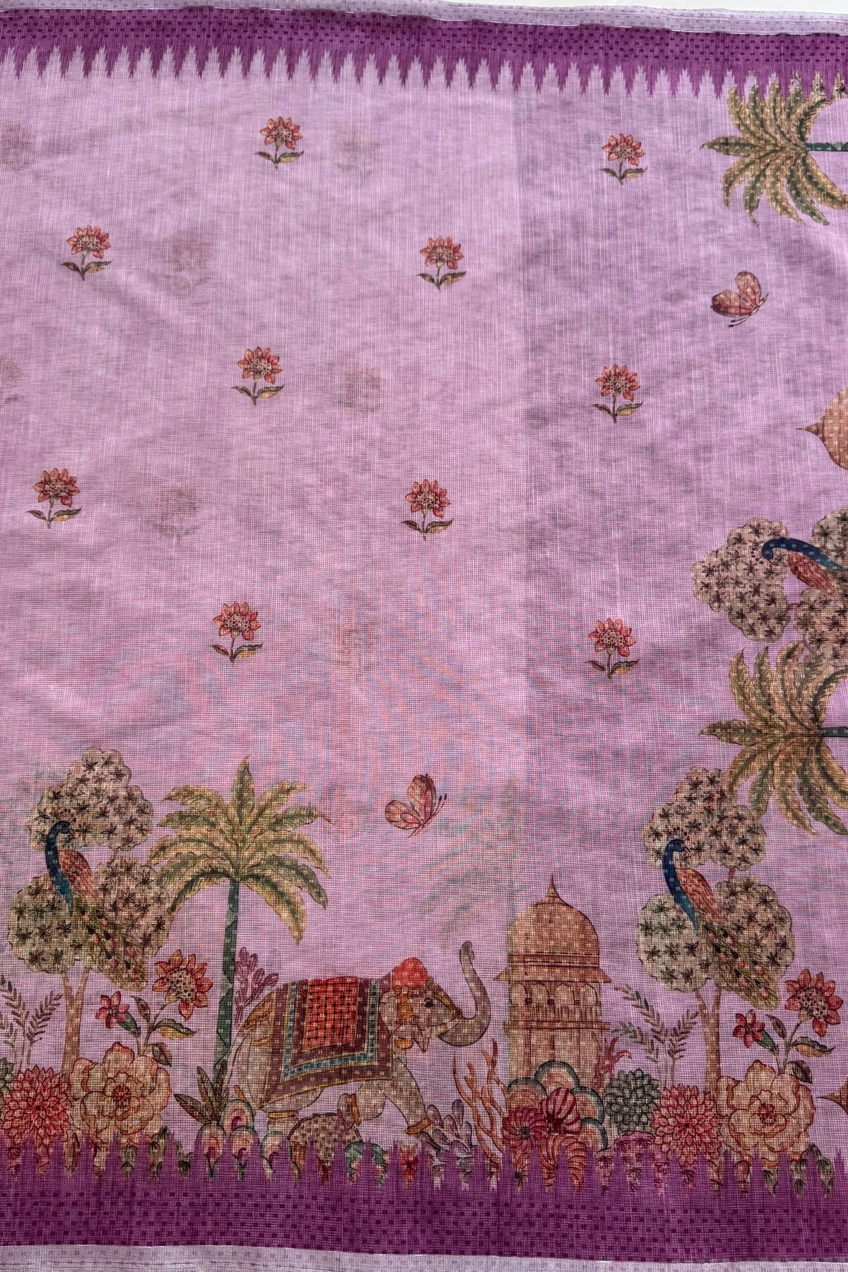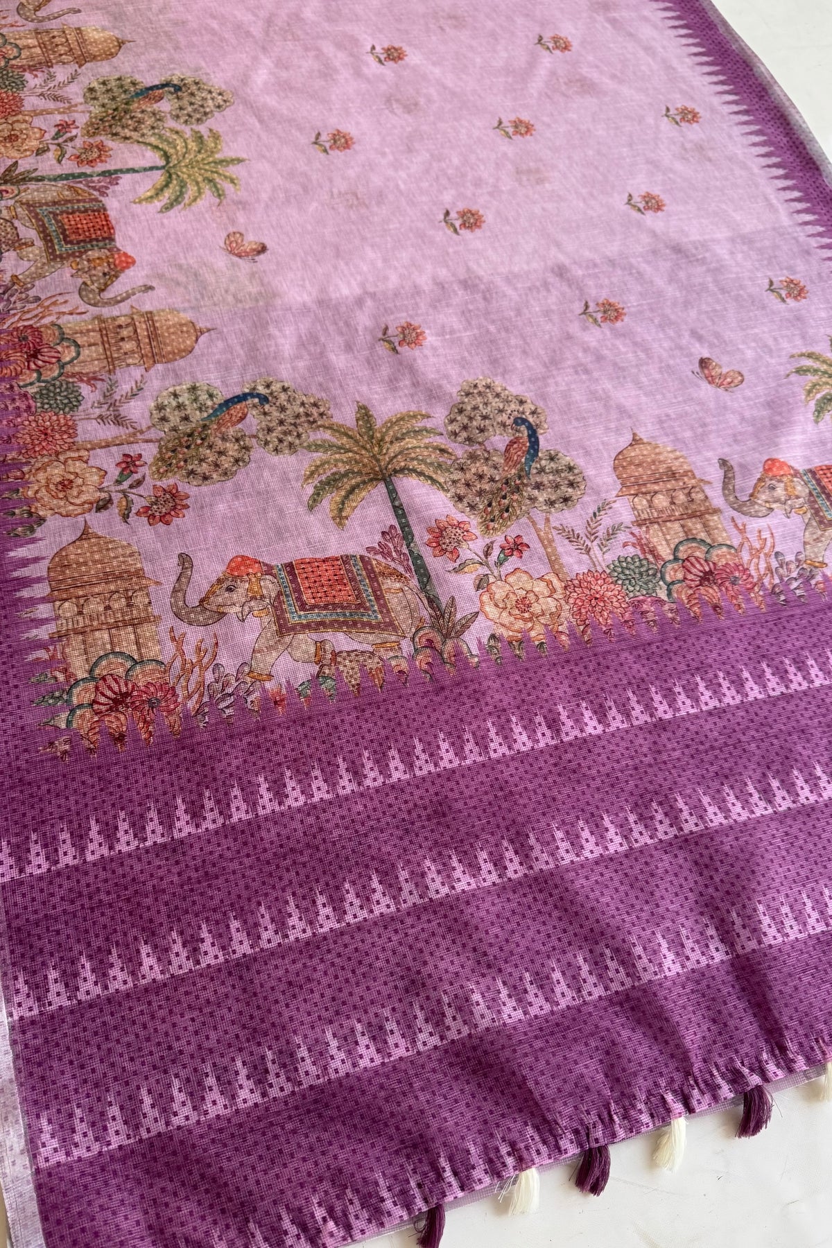 This saree features a royal border print with elephants, peacocks, palm trees, and palace motifs.