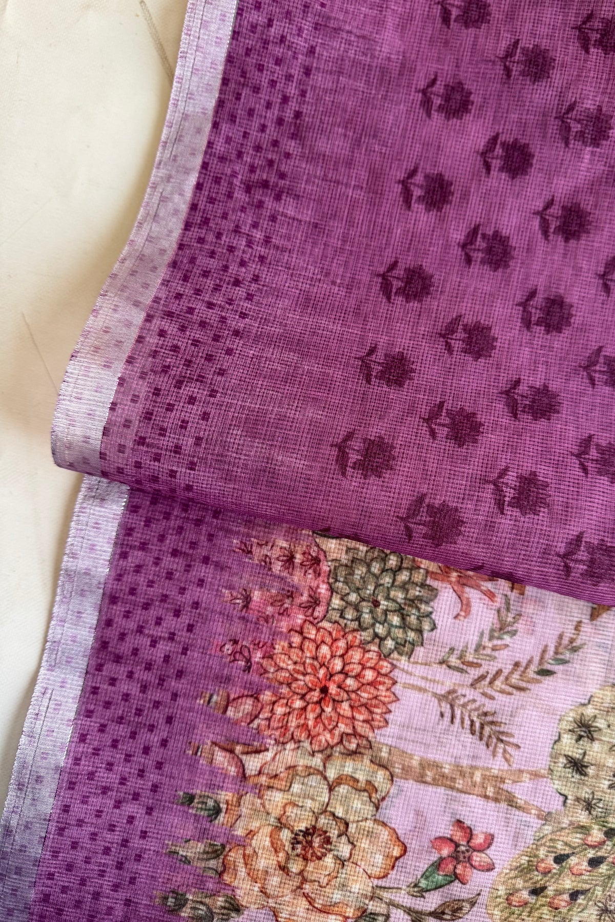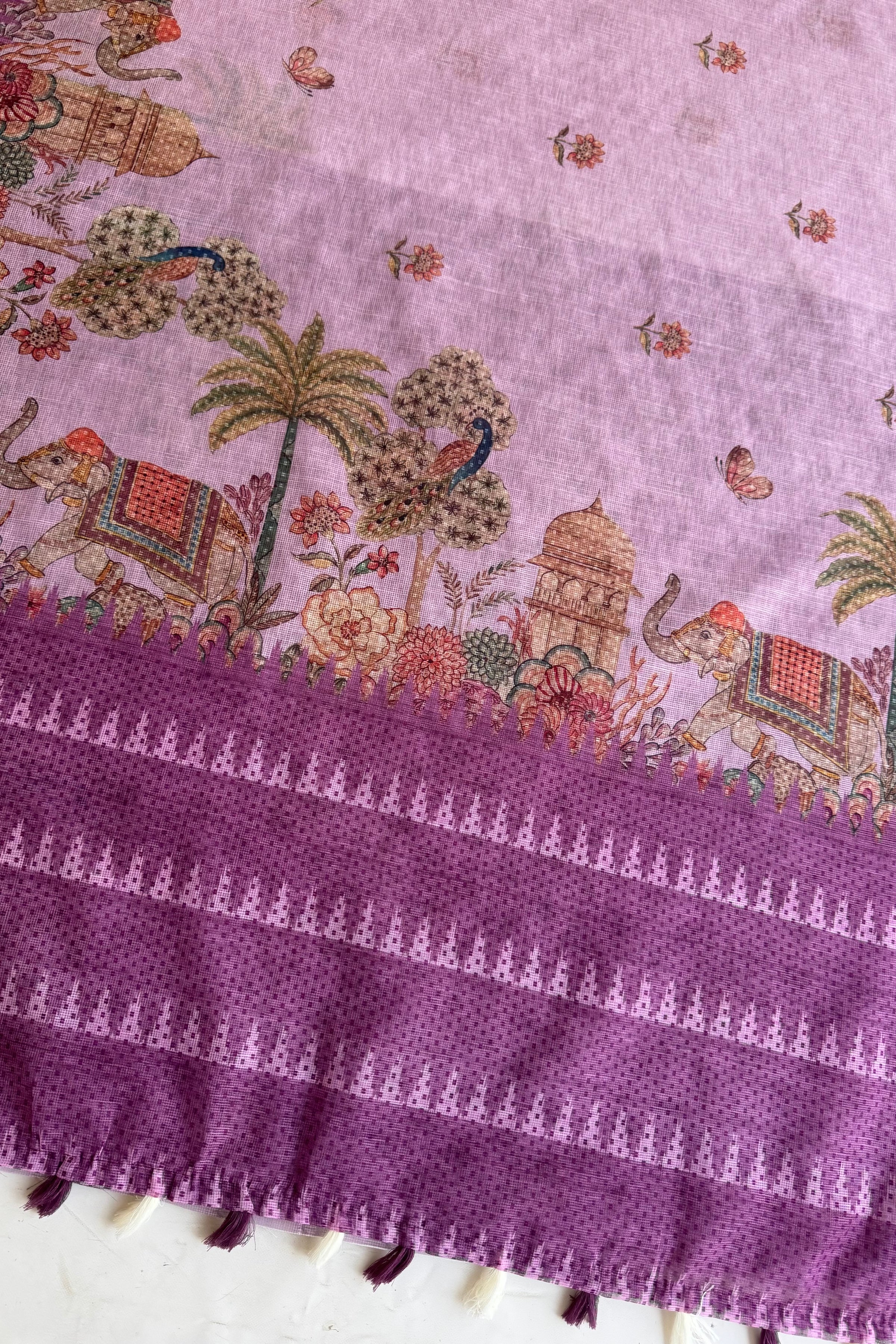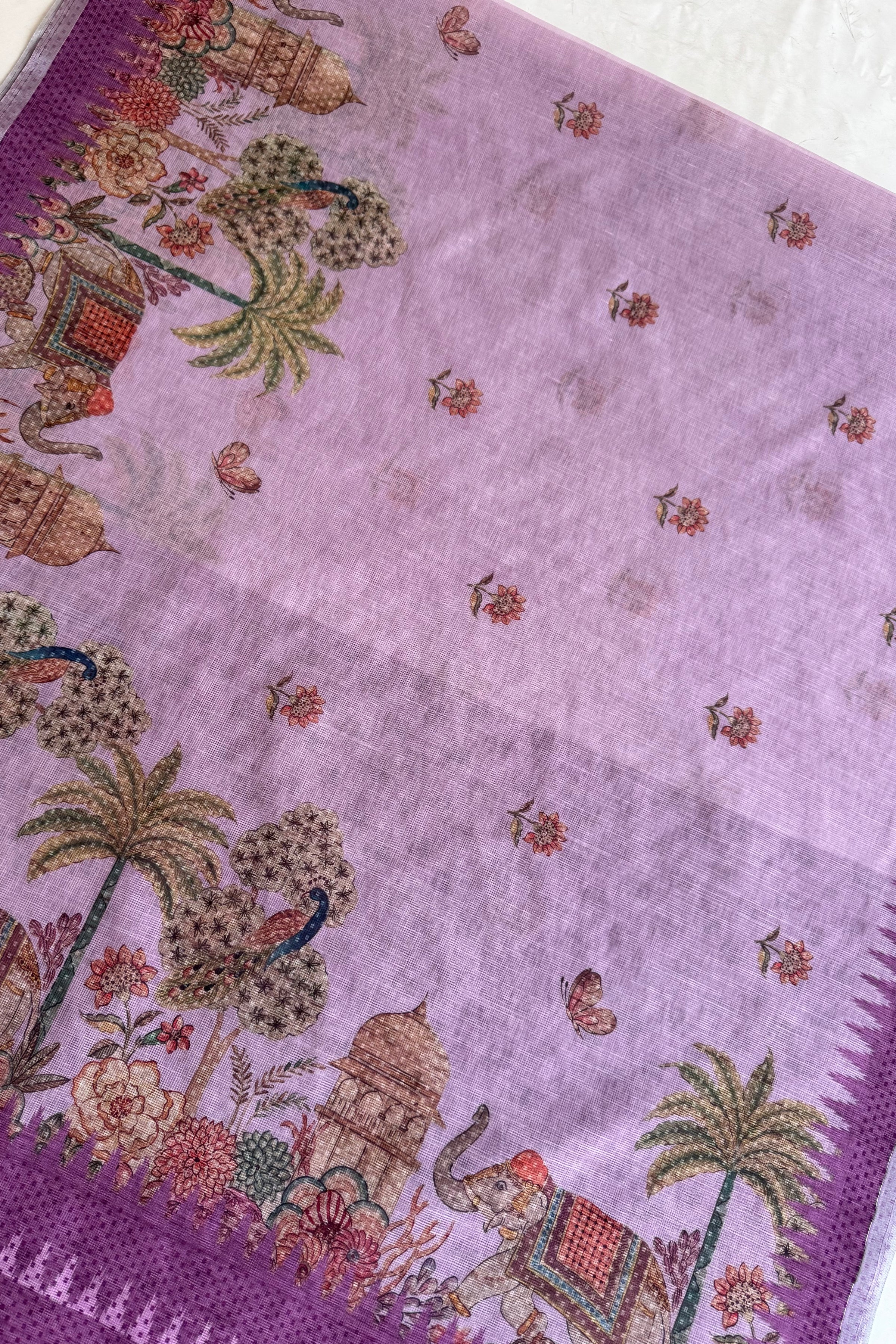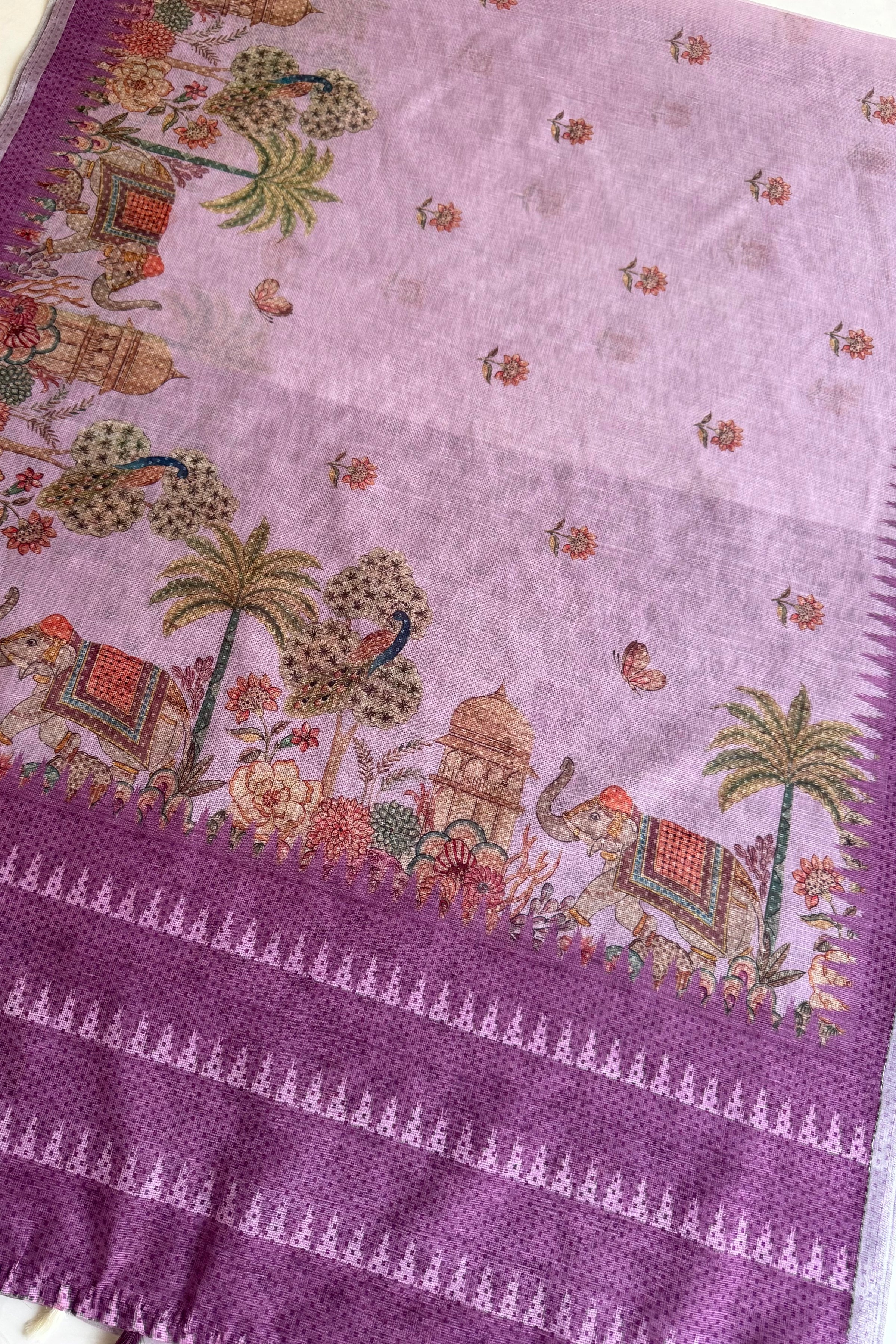 This saree features a royal border print with elephants, peacocks, palm trees, and palace motifs.