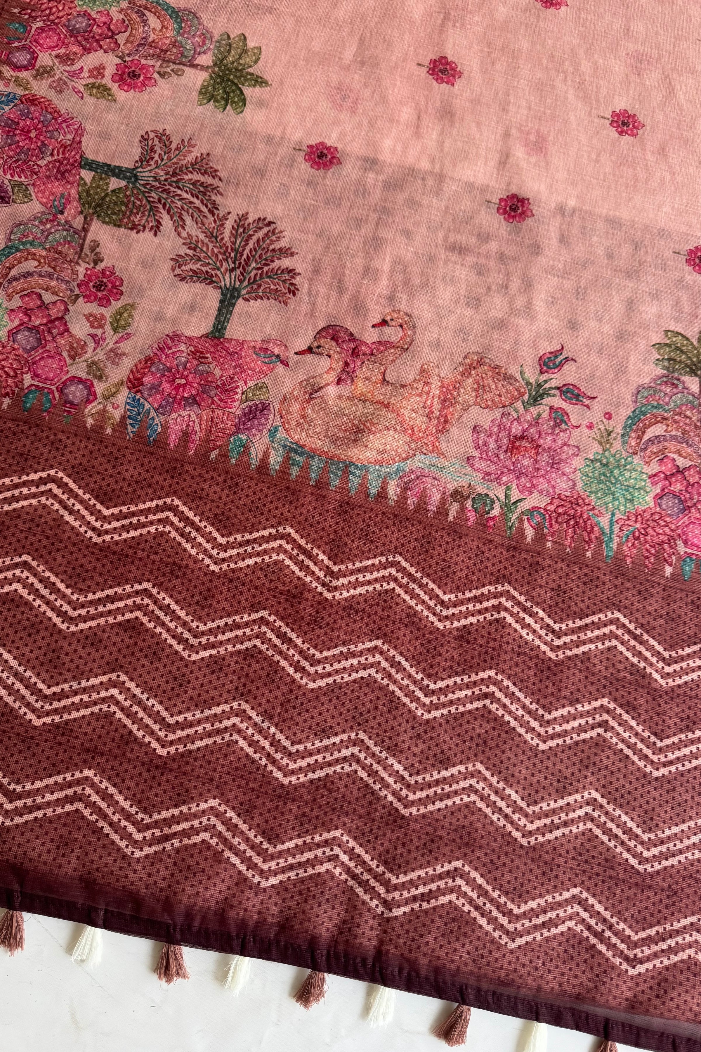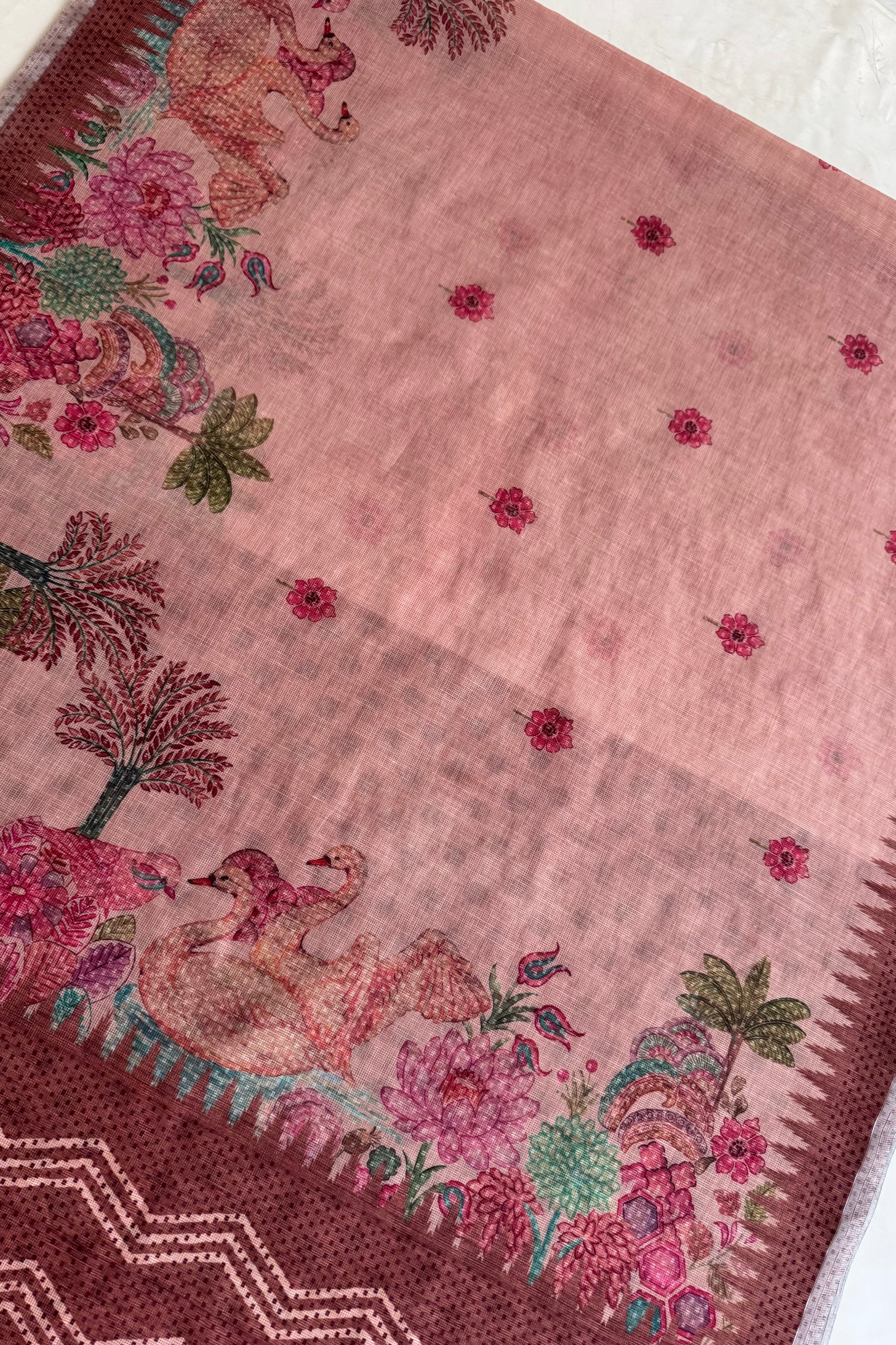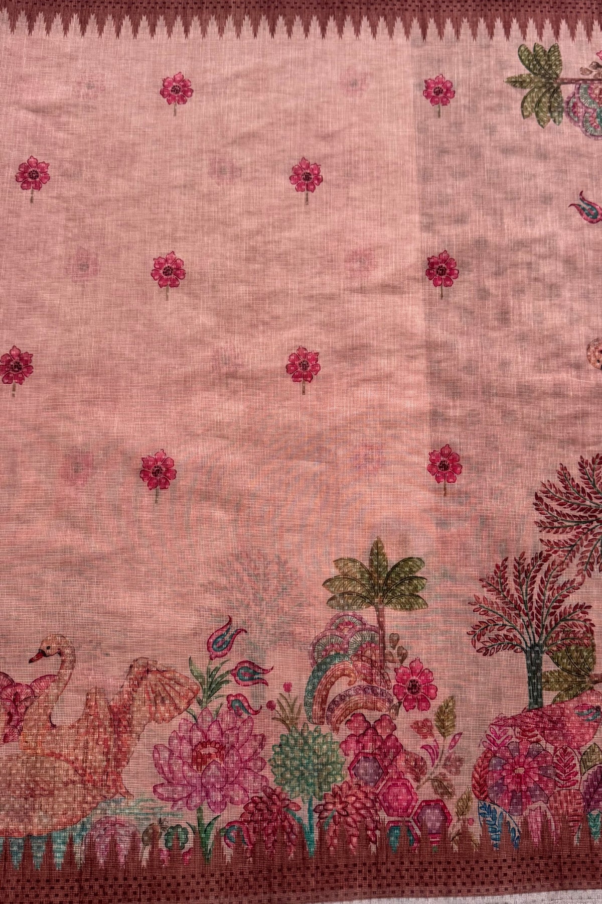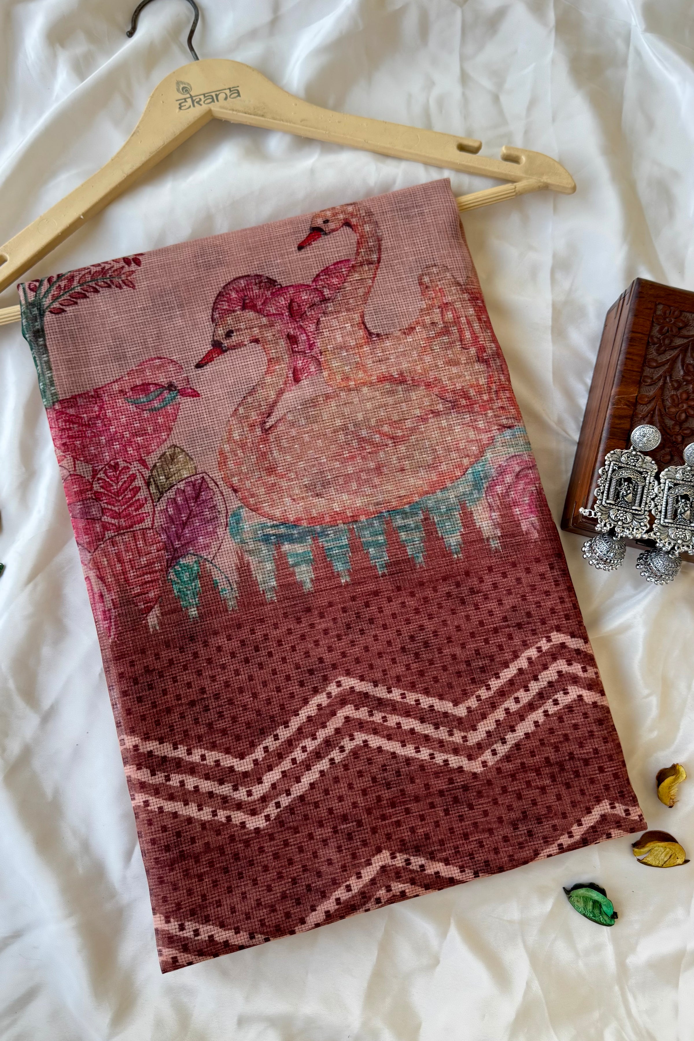 This saree features a charming floral and swan-inspired border print with soft pastel shades.