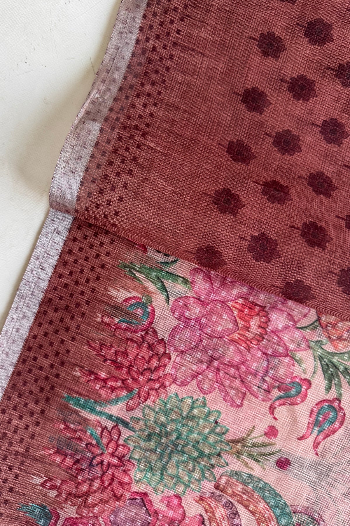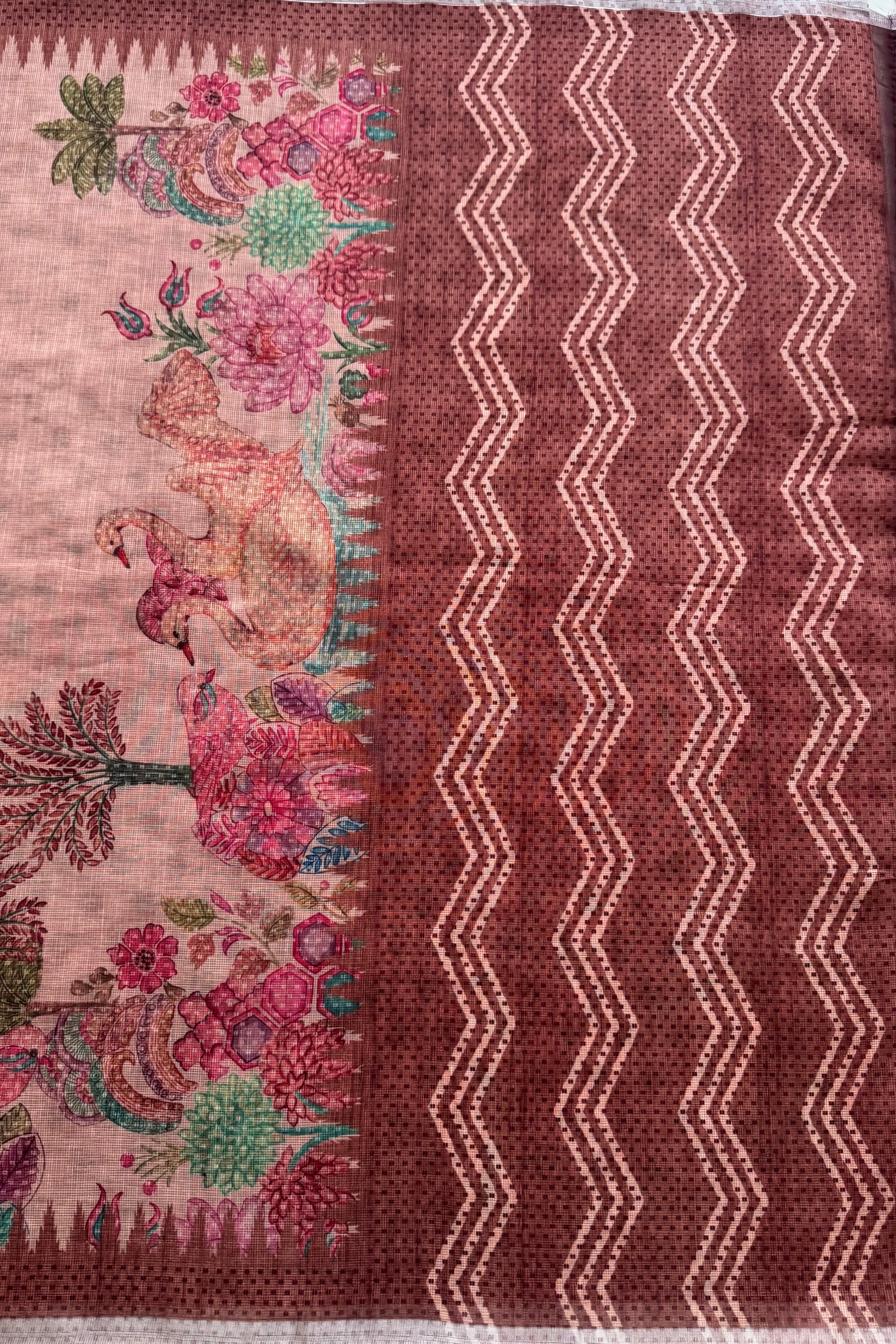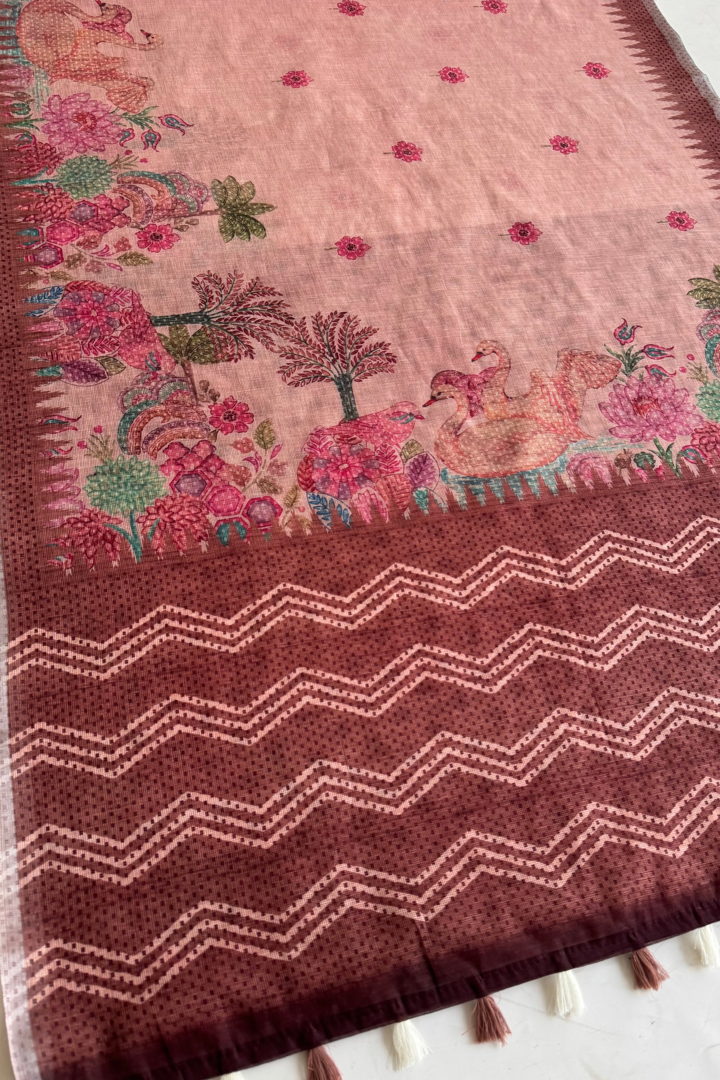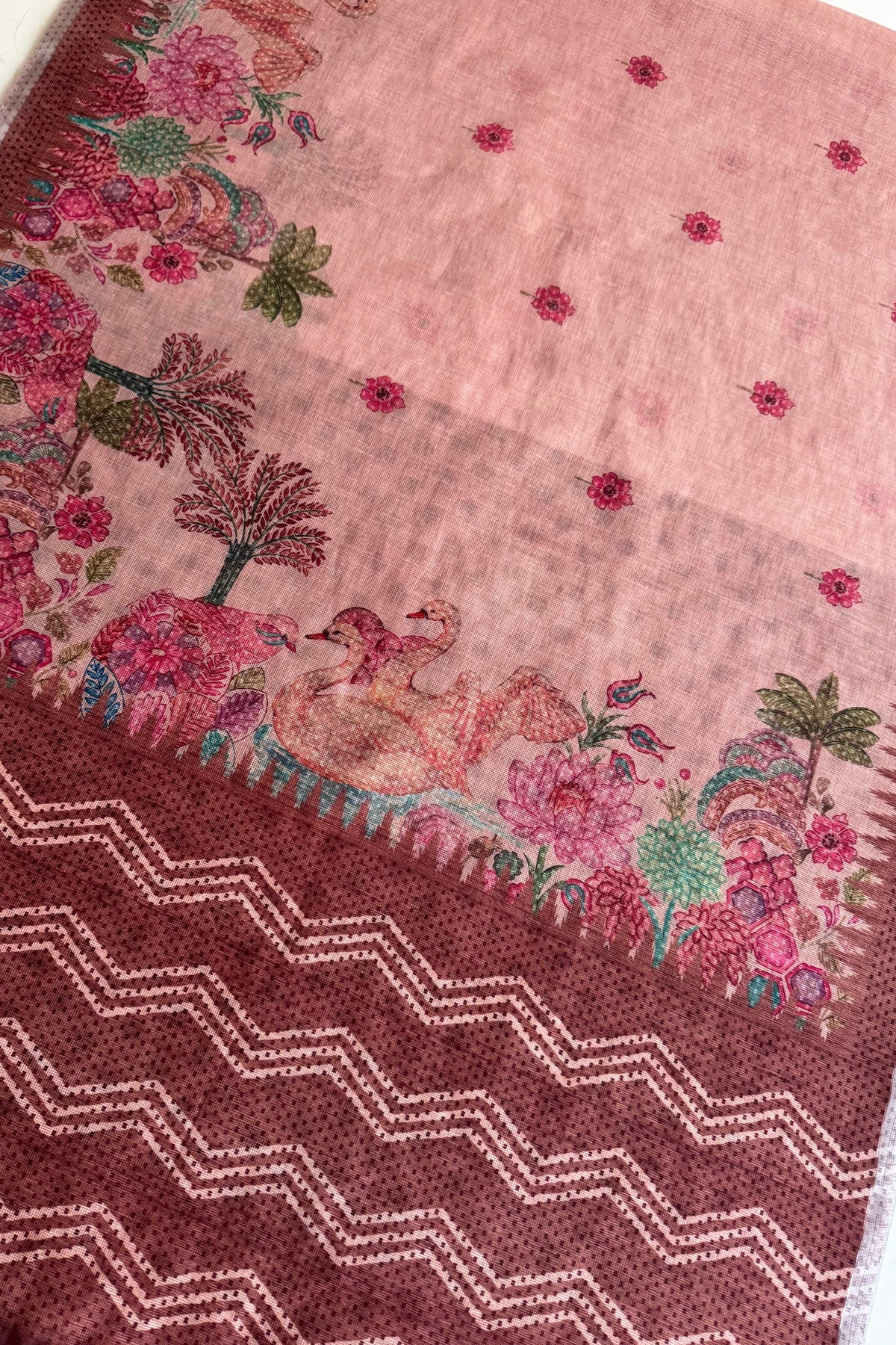 This saree features a charming floral and swan-inspired border print with soft pastel shades.