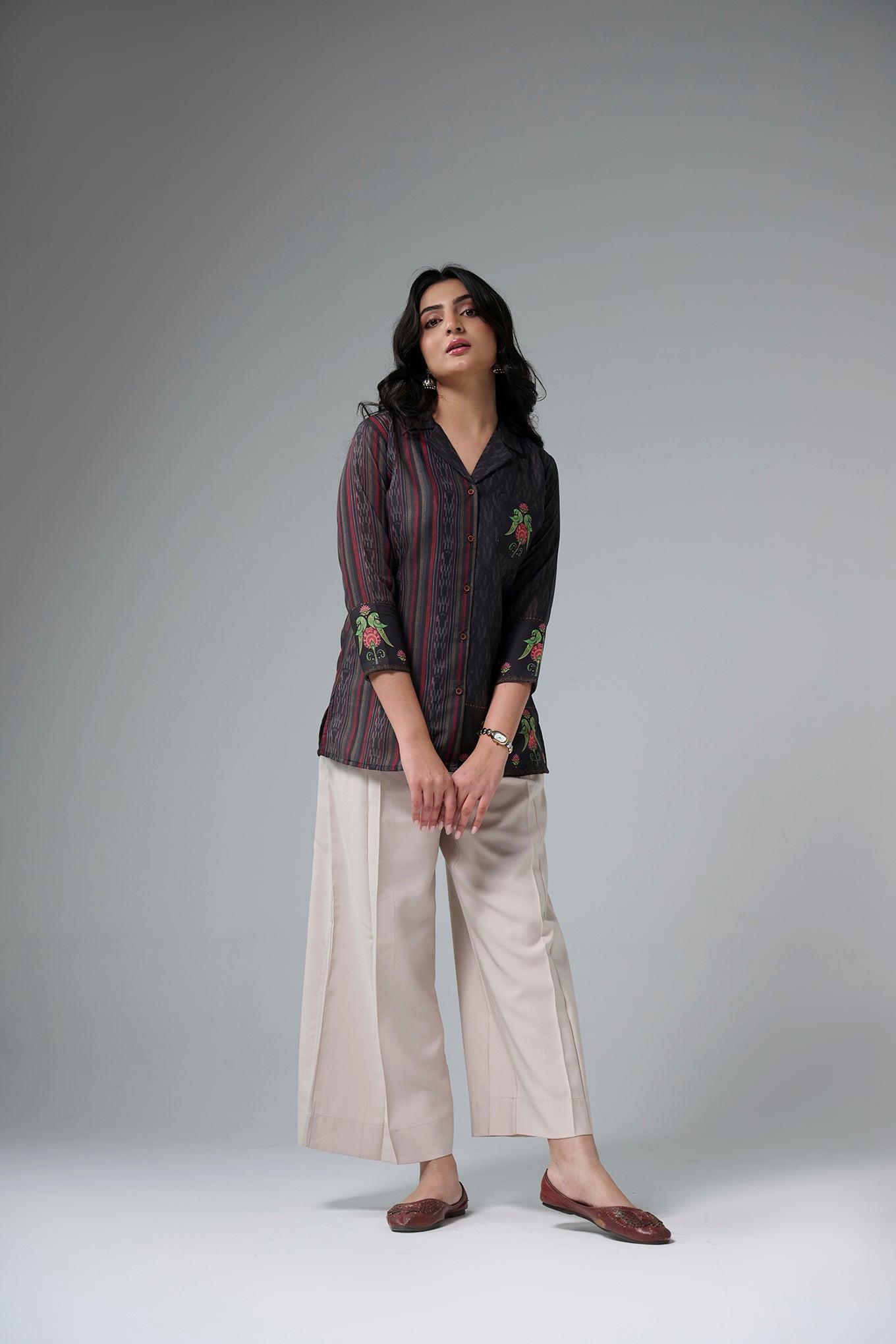 This cambric cotton shirt comes with a lovely mix of striped pattern and traditional prints. The cute folk motifs add a fresh and stylish touch. Soft and breathable fabric makes it comfortable for all-day wear. Perfect for a smart casual look with a hint of desi charm.