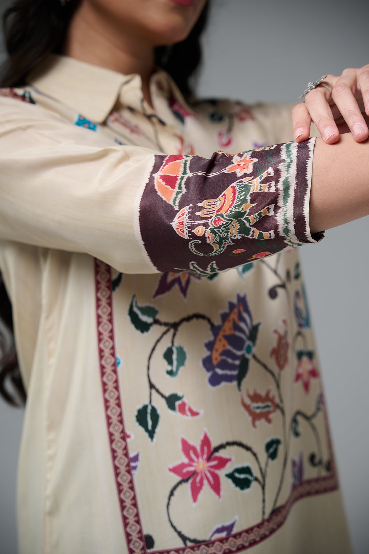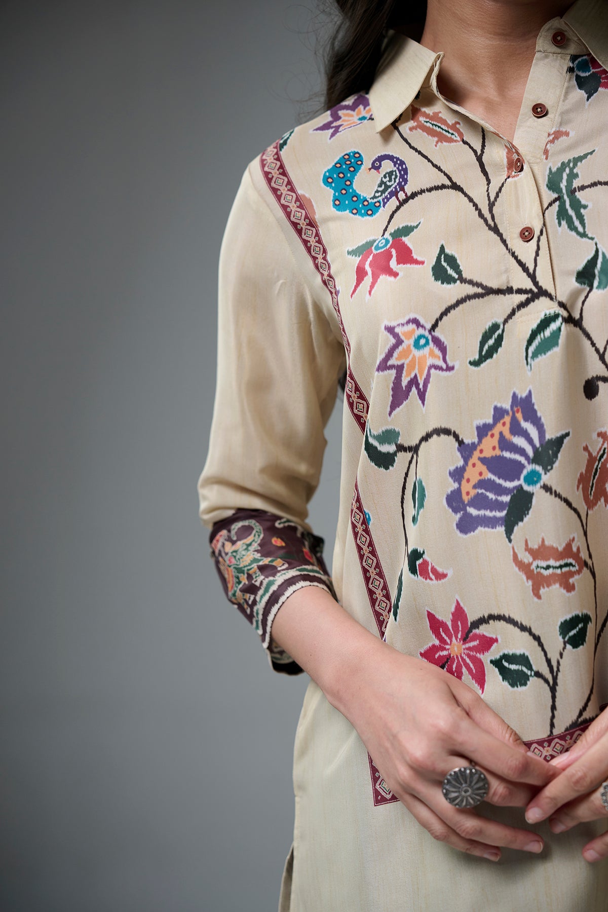 This short kurta features beautiful floral and bird prints inspired by nature.