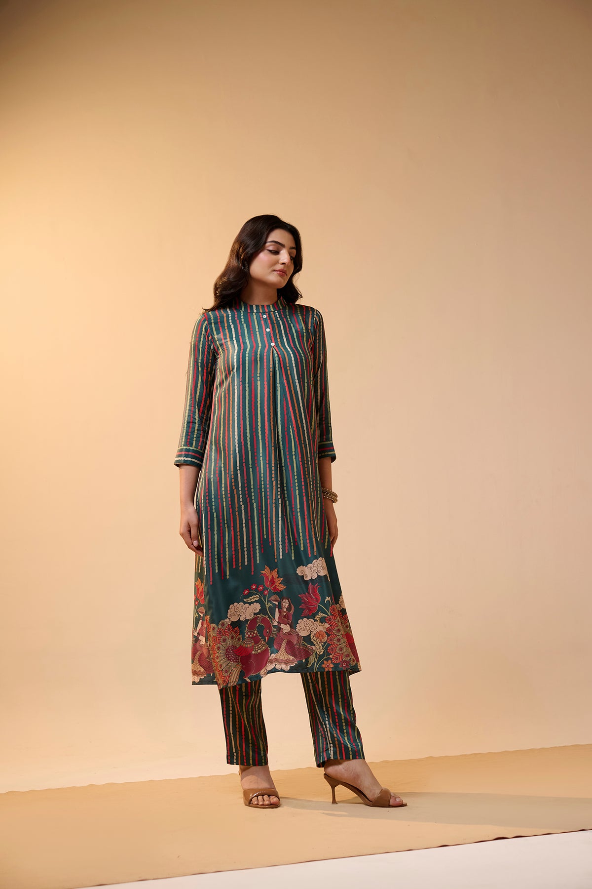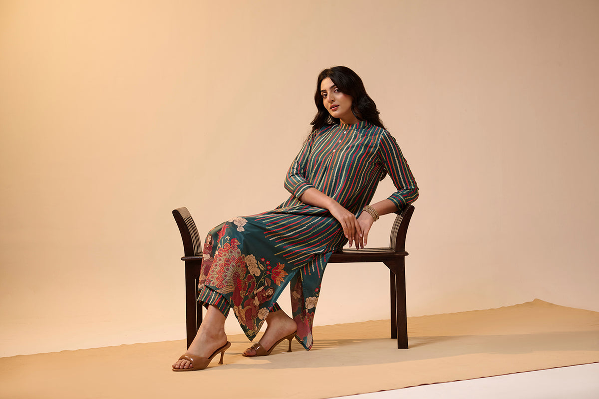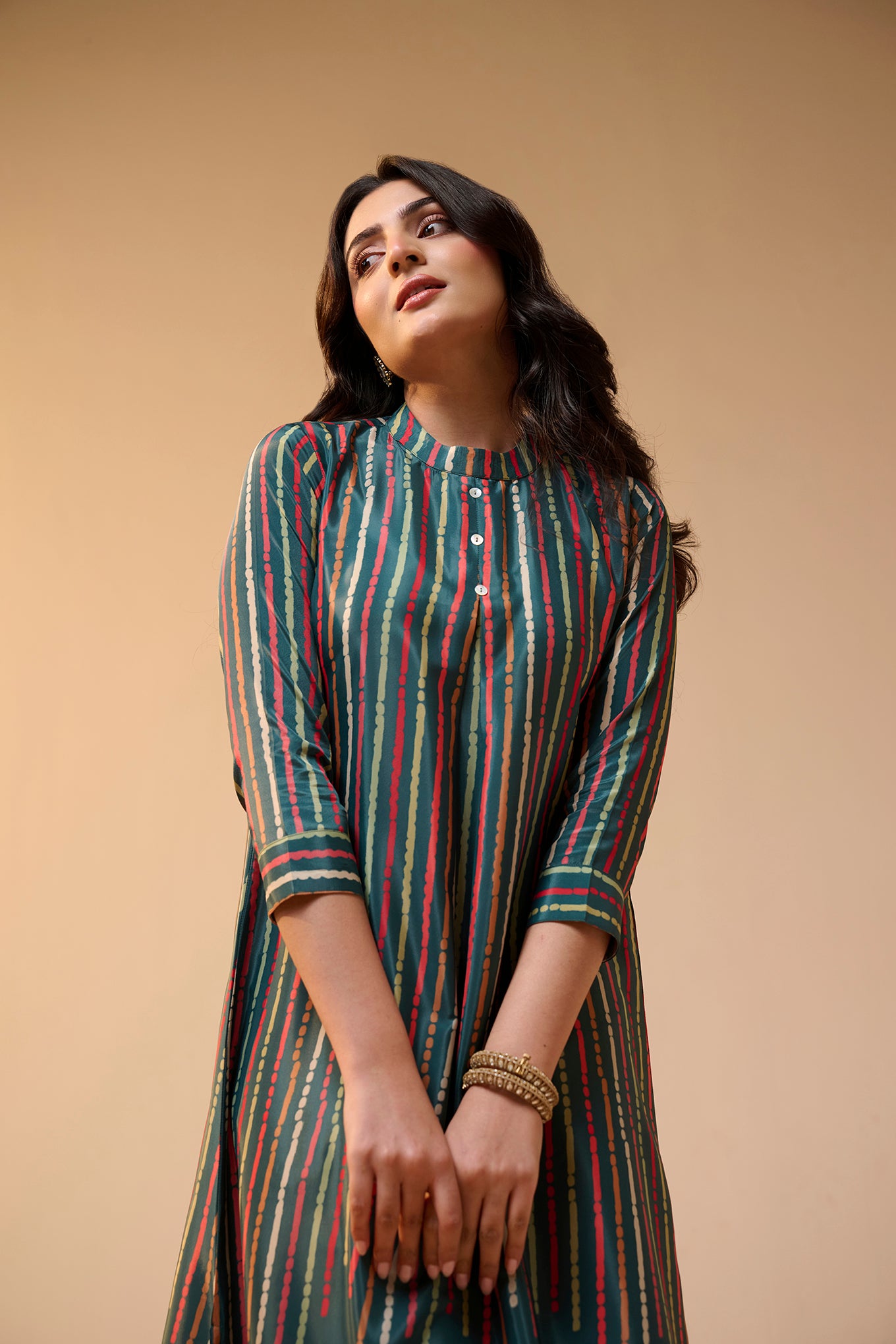 This kurta set comes in soft modal crepe fabric with stylish vertical stripe prints.