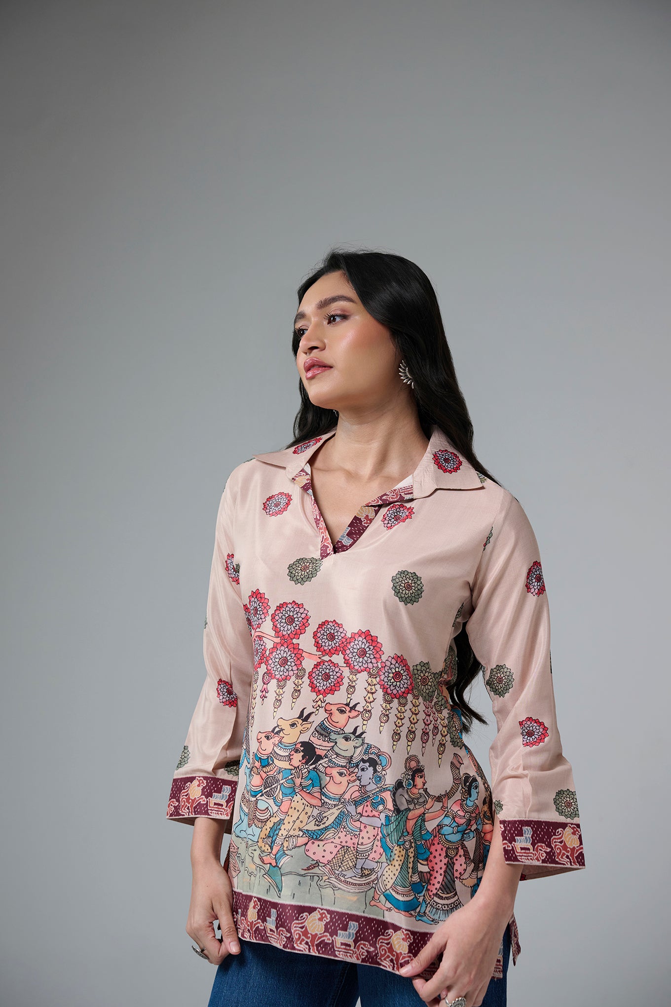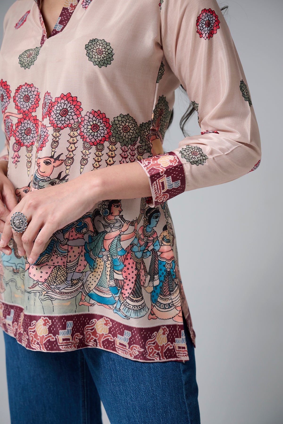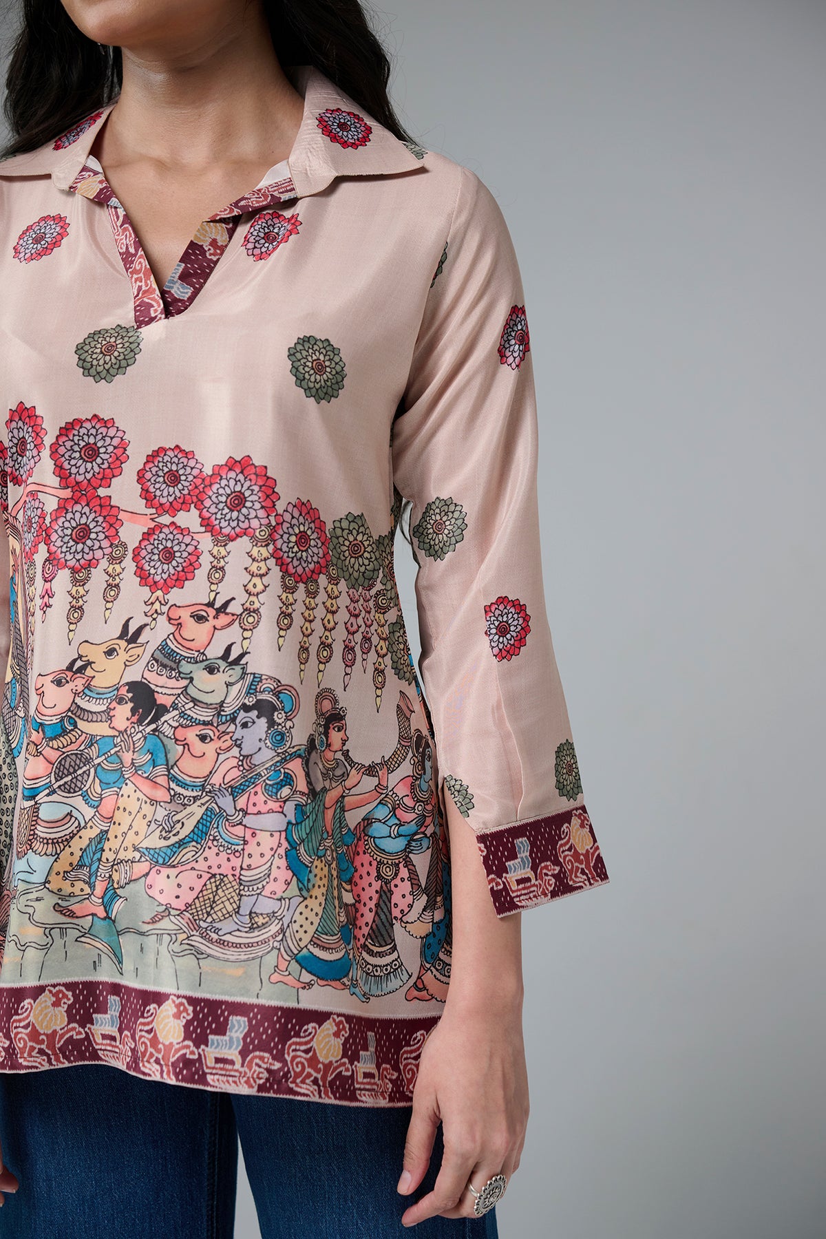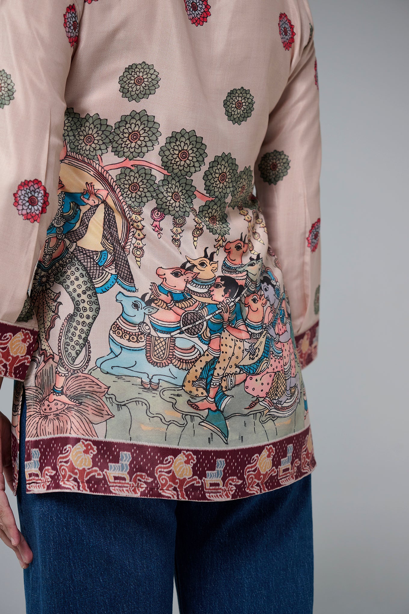 This short kurta features beautiful traditional folk dance prints on the front.