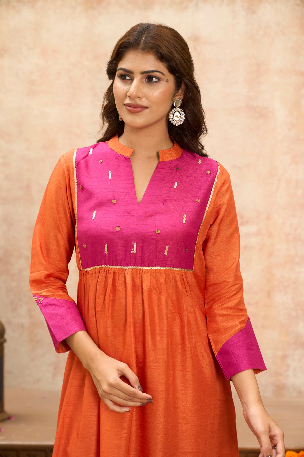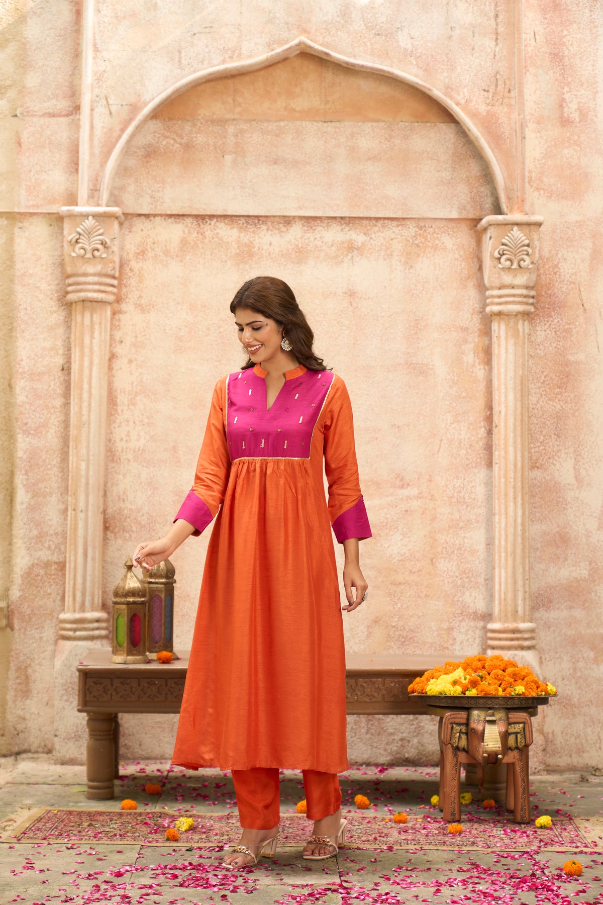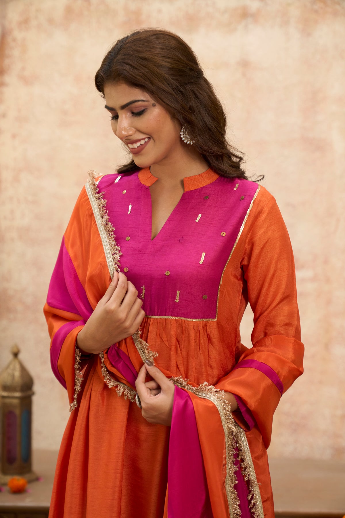 Crafted in lustrous dola silk, this vibrant orange kurta set is paired with a striking pink and orange dupatta finished with delicate lace detailing. A perfect blend of elegance and bold hues, making it an effortless pick for festive occasions.