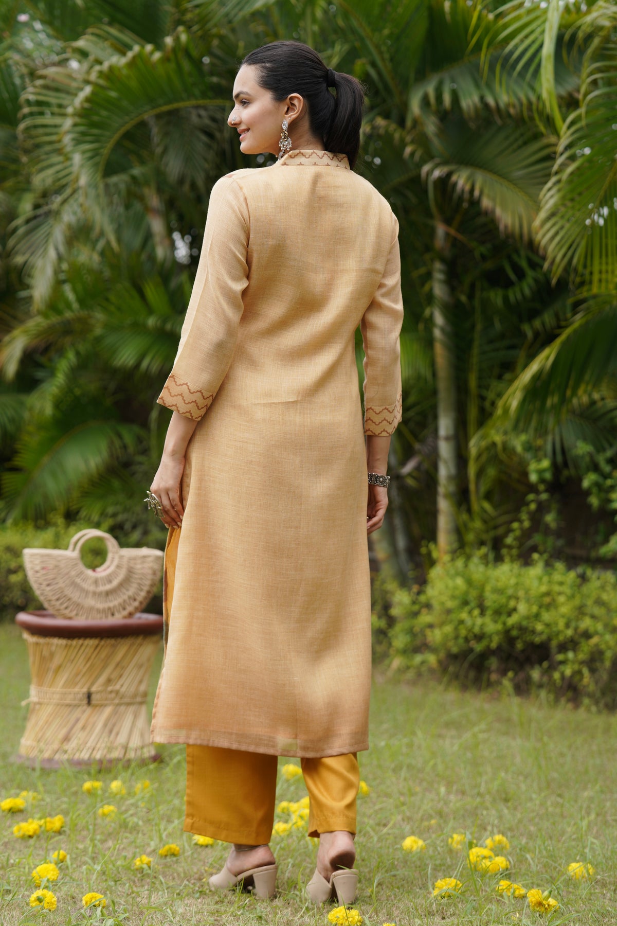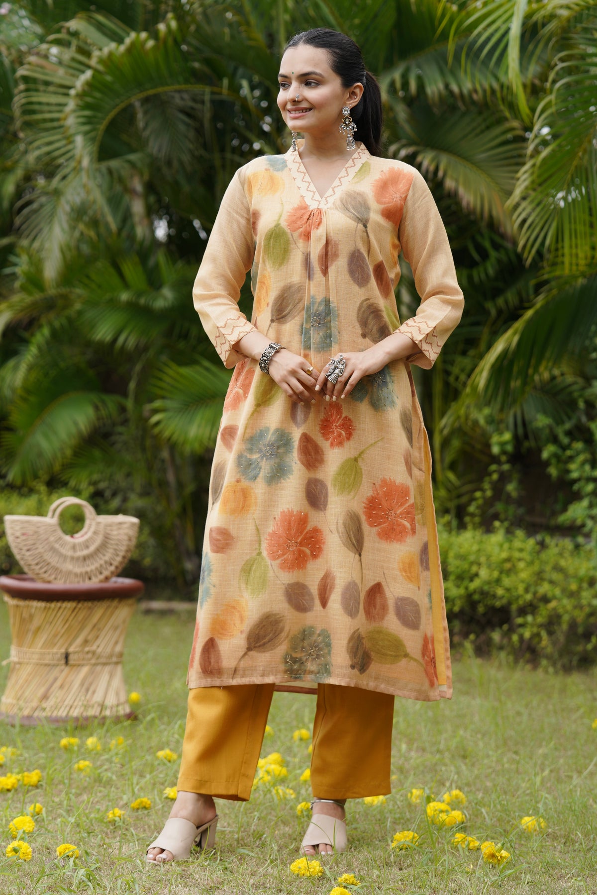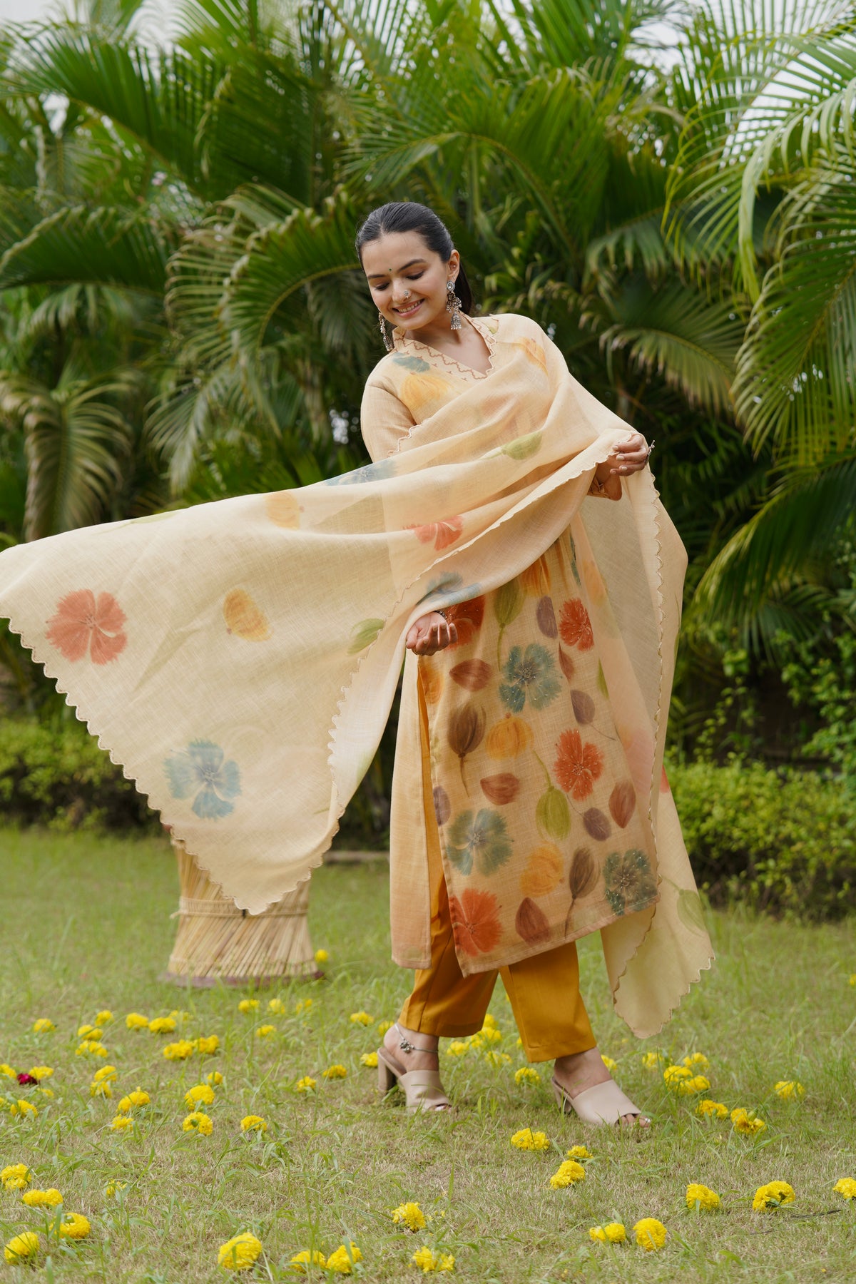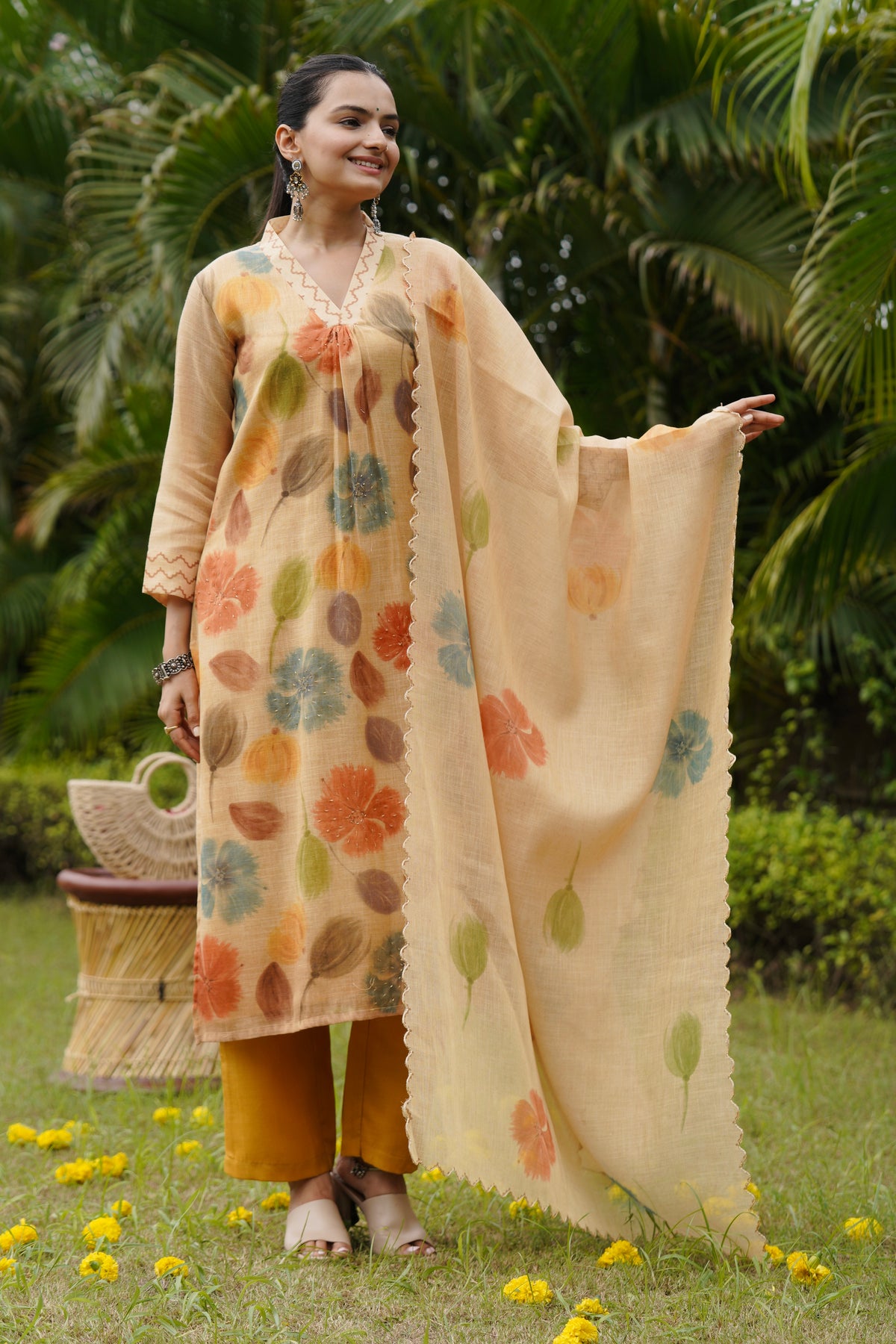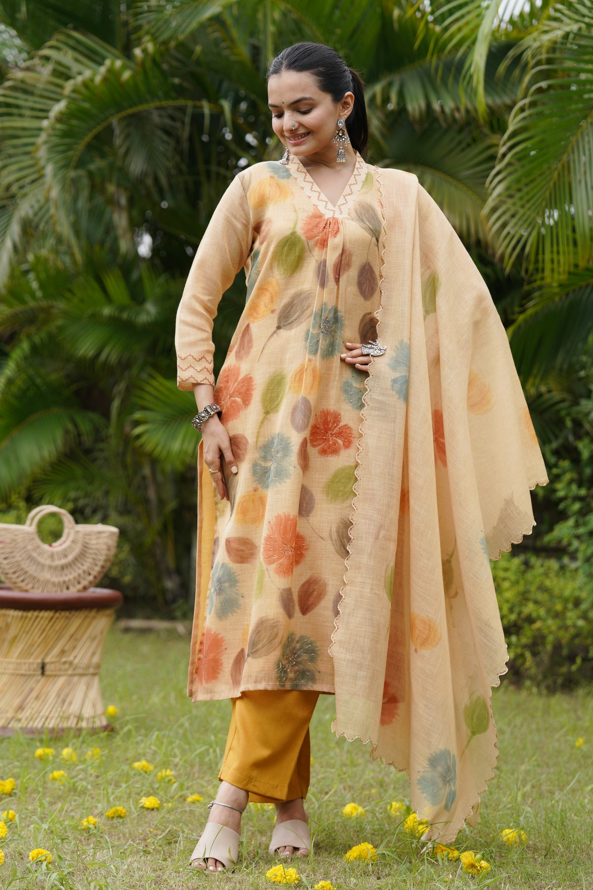 This floral suit set is a breath of fresh air, featuring playful bursts of orange, blue, green, and brown blooms scattered across a warm beige base. The kurta has a soft V-neckline with a wavy trim that continues along the edge of the flowing dupatta. Paired with mustard pants, this look is perfect for a breezy day out or a casual festive gathering.