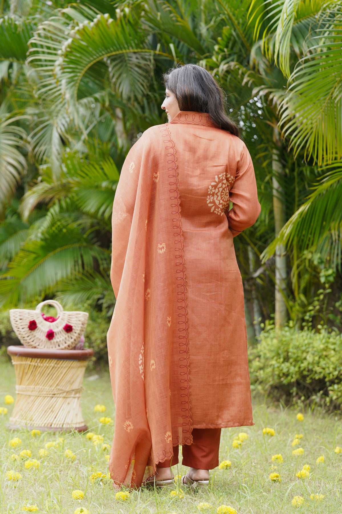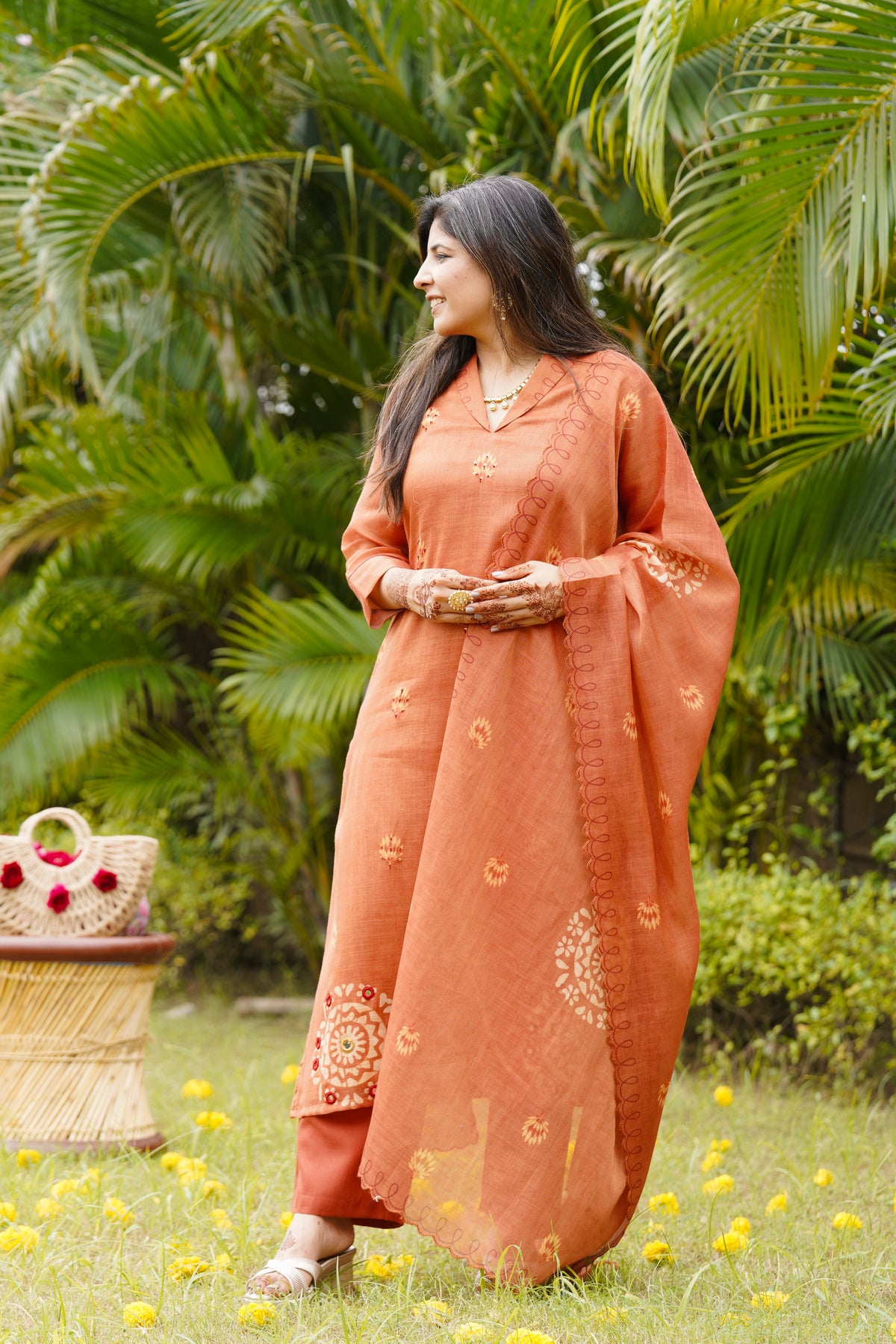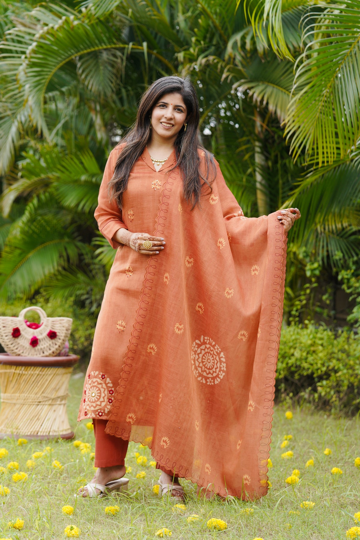 A beautiful rust colour suit set with elegant floral handwork on the kurta. The soft dupatta comes with scallop edges and matching handwork detailing, giving it a stylish and graceful look. The fabric feels light and breathable, perfect for all-day comfort. Pair it with minimal jewellery for a charming festive vibe.