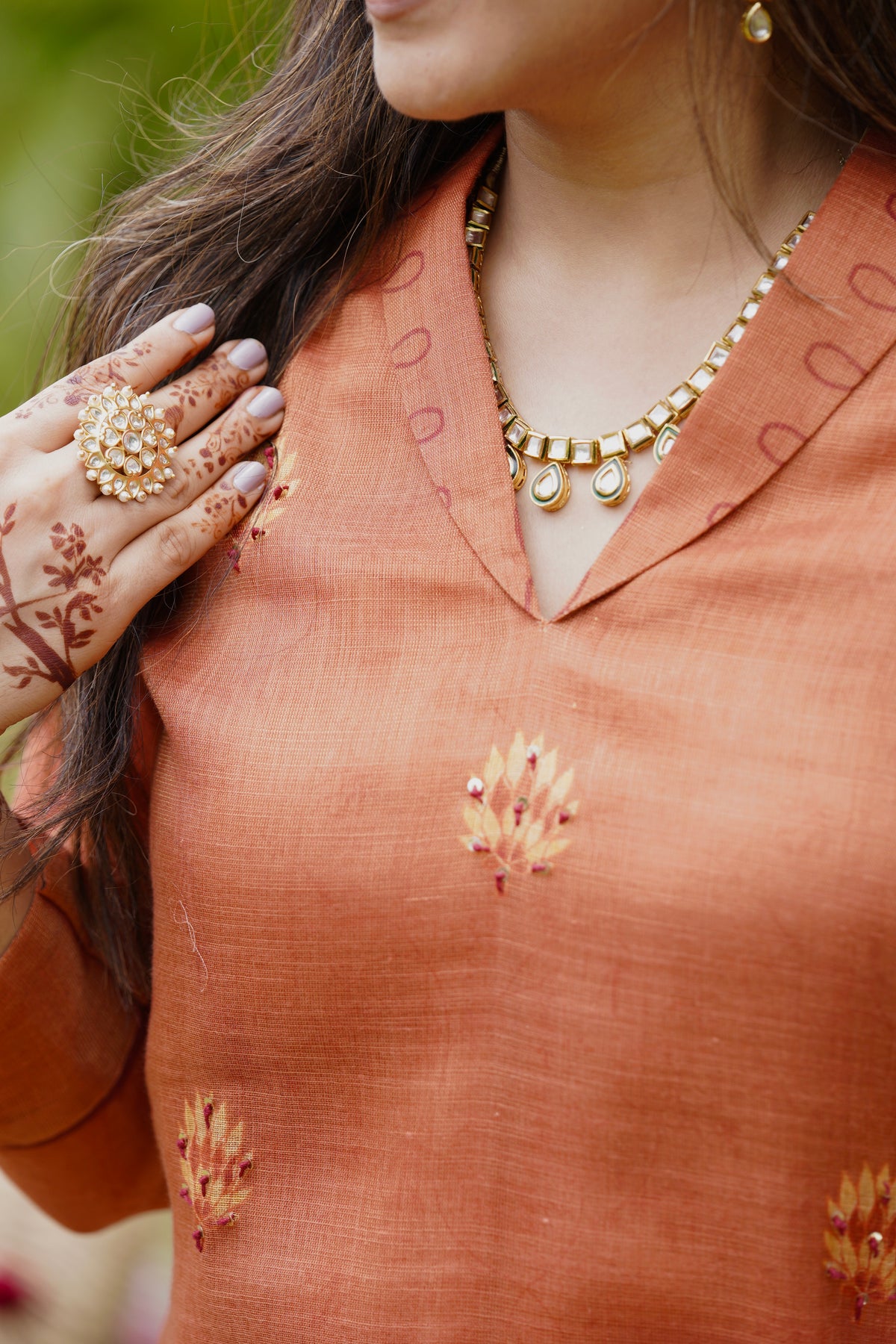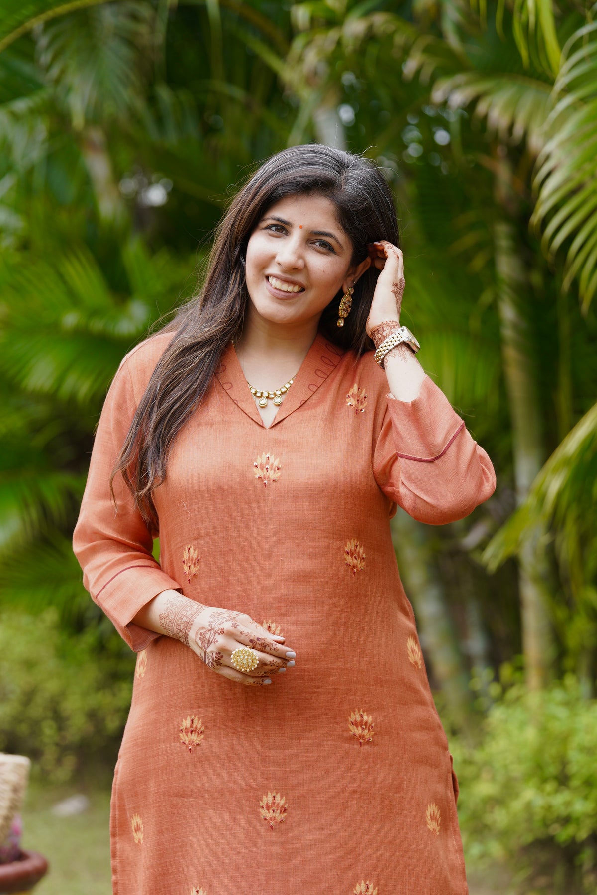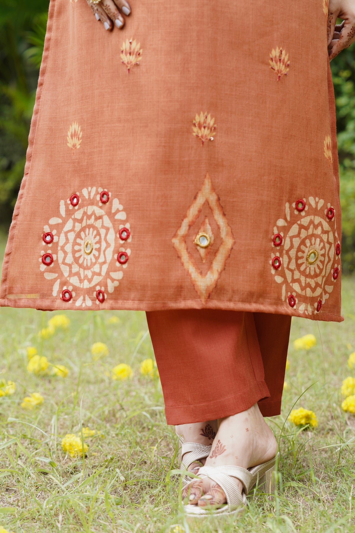 A beautiful rust colour suit set with elegant floral handwork on the kurta. The soft dupatta comes with scallop edges and matching handwork detailing, giving it a stylish and graceful look. The fabric feels light and breathable, perfect for all-day comfort. Pair it with minimal jewellery for a charming festive vibe.