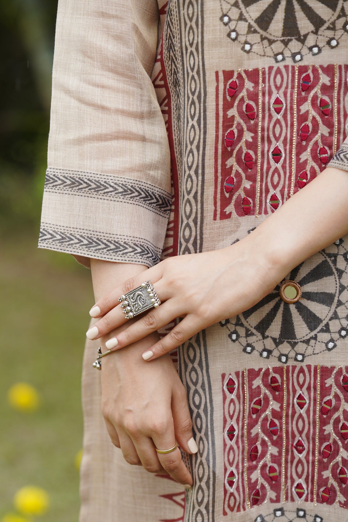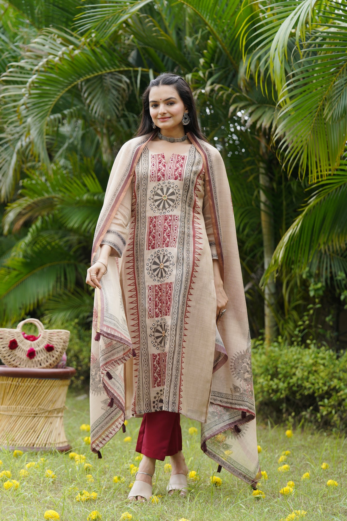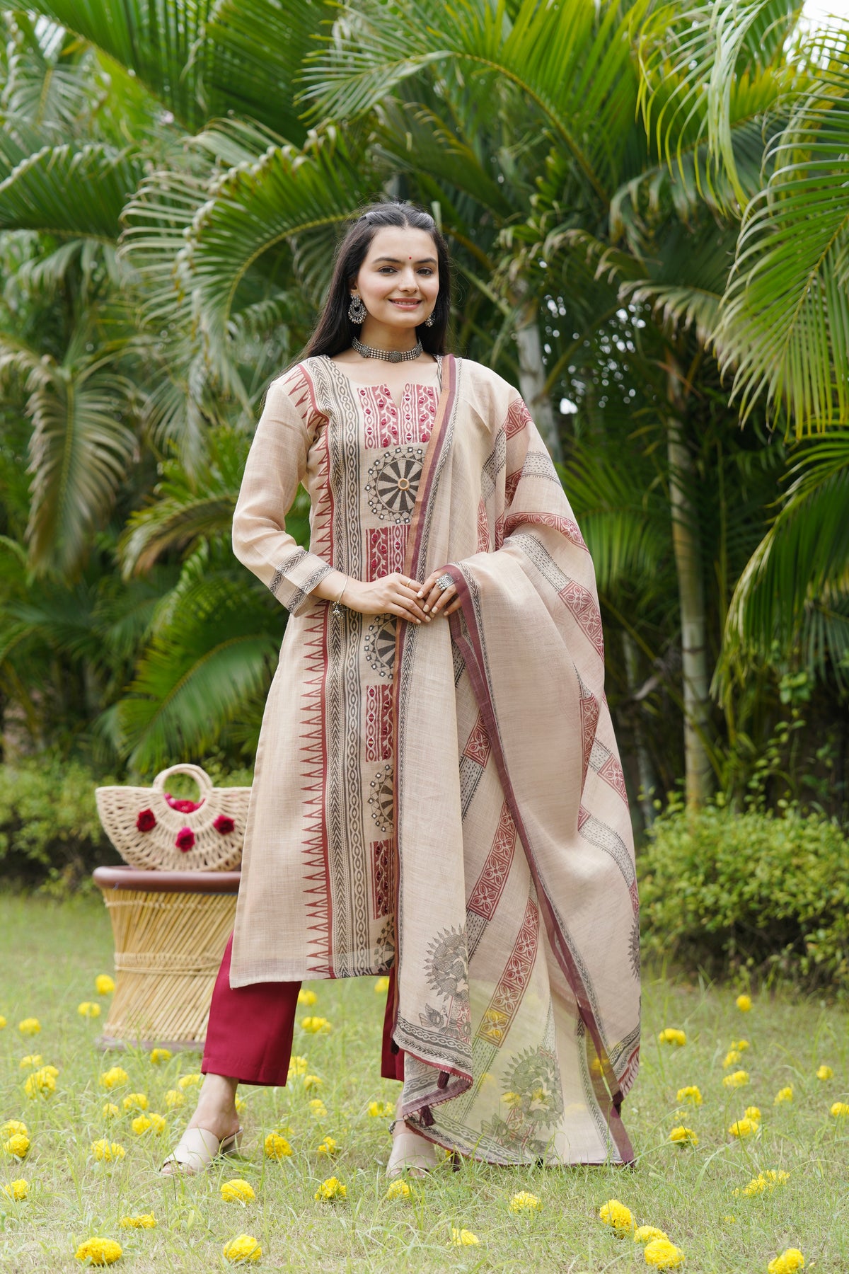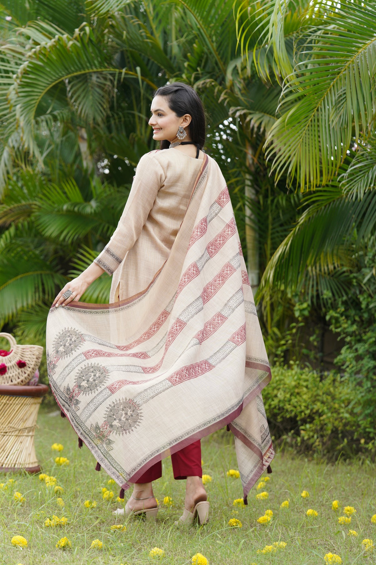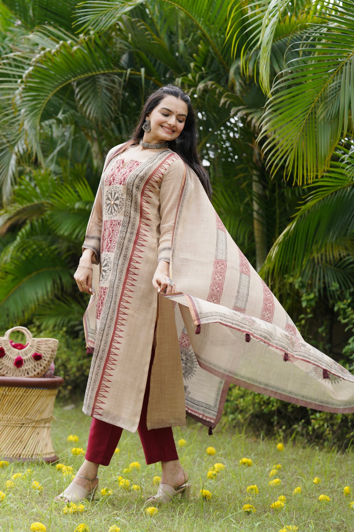 The dupatta also carries delicate hand-done motifs, making the set look complete and well-finished. The neat cuts and graceful drape give it a very refined and polished look. A truly stunning piece that speaks of elegance in every thread.