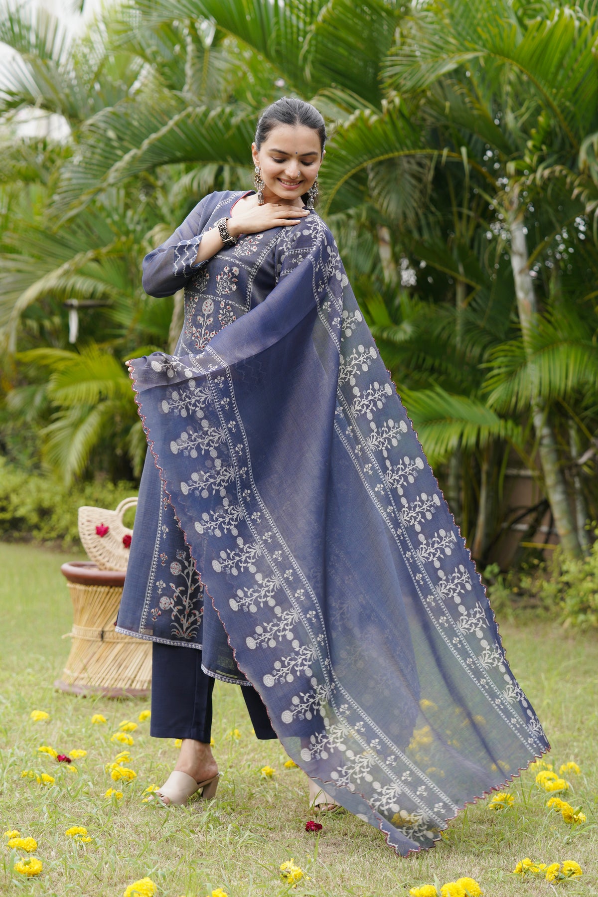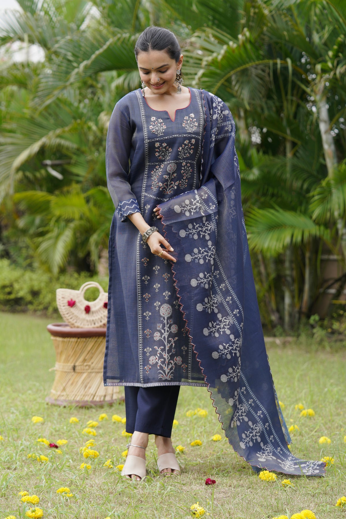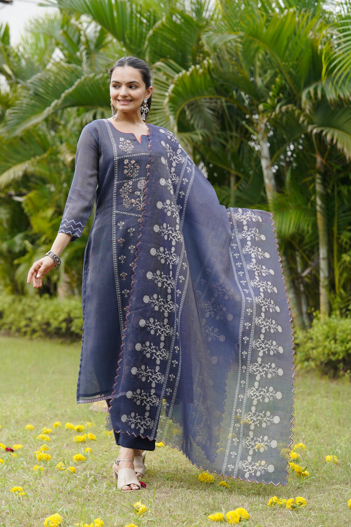 Grace meets tradition in this navy blue suit set featuring intricate threadwork and floral patterns. The kurta’s delicate detailing pairs beautifully with the scalloped dupatta, creating a refined ethnic look. Perfect for festive occasions, poojas, or family functions.