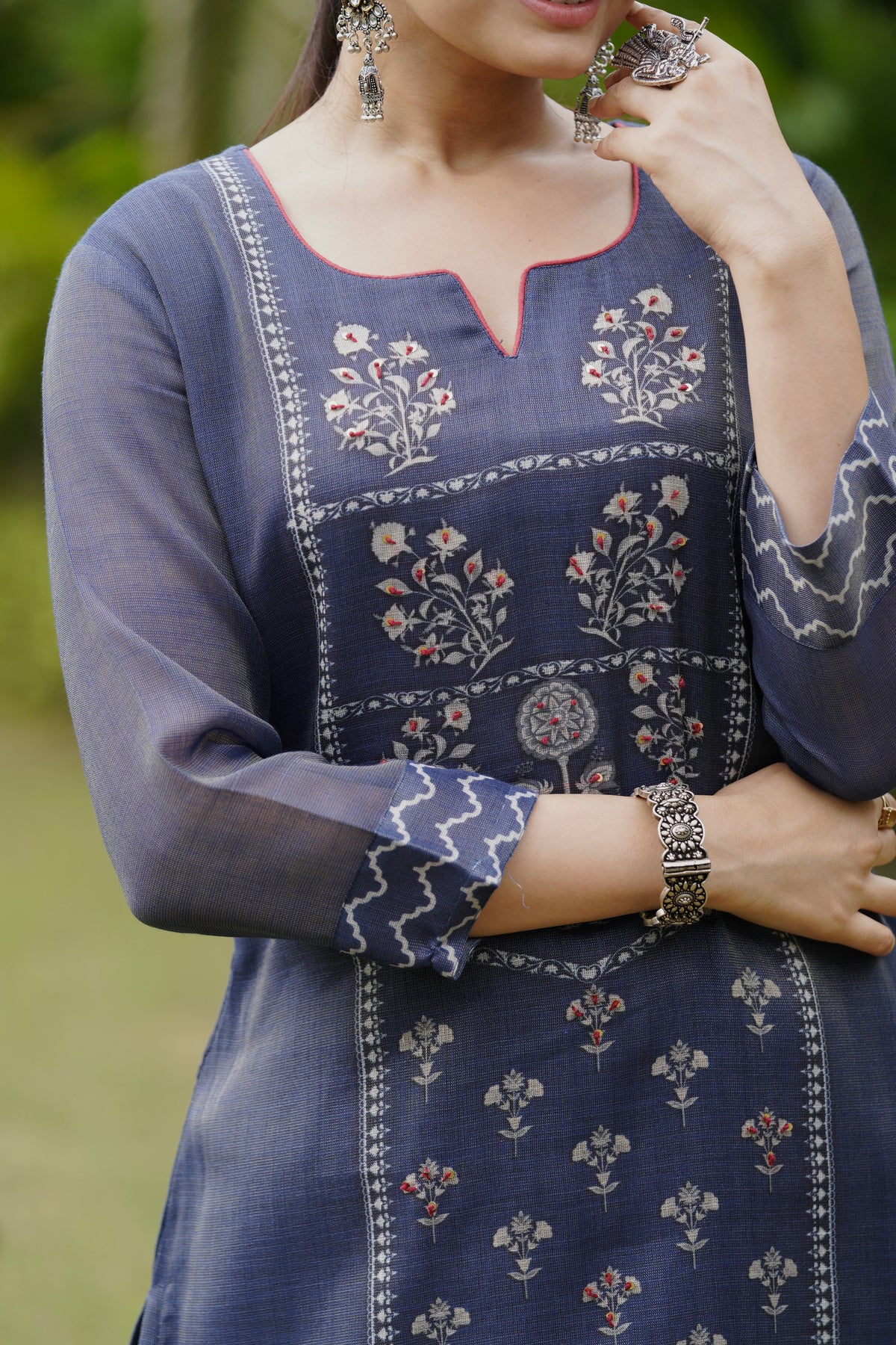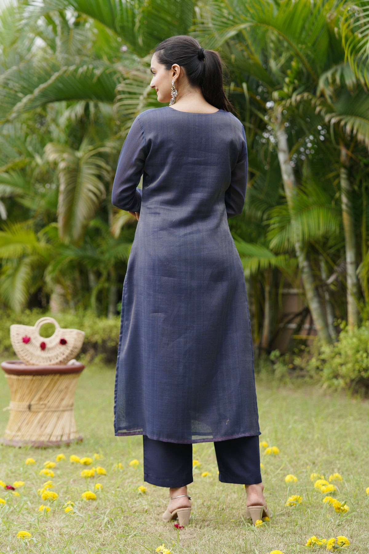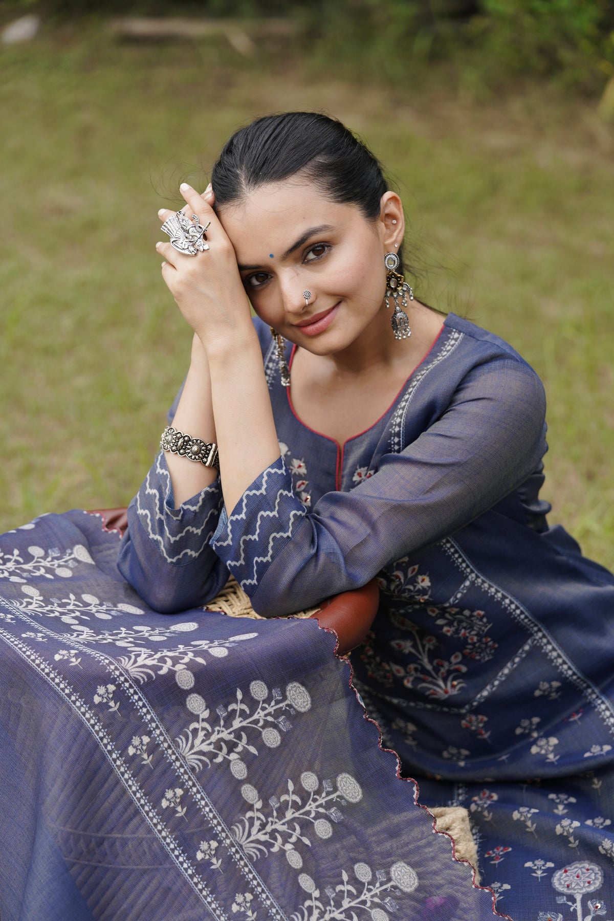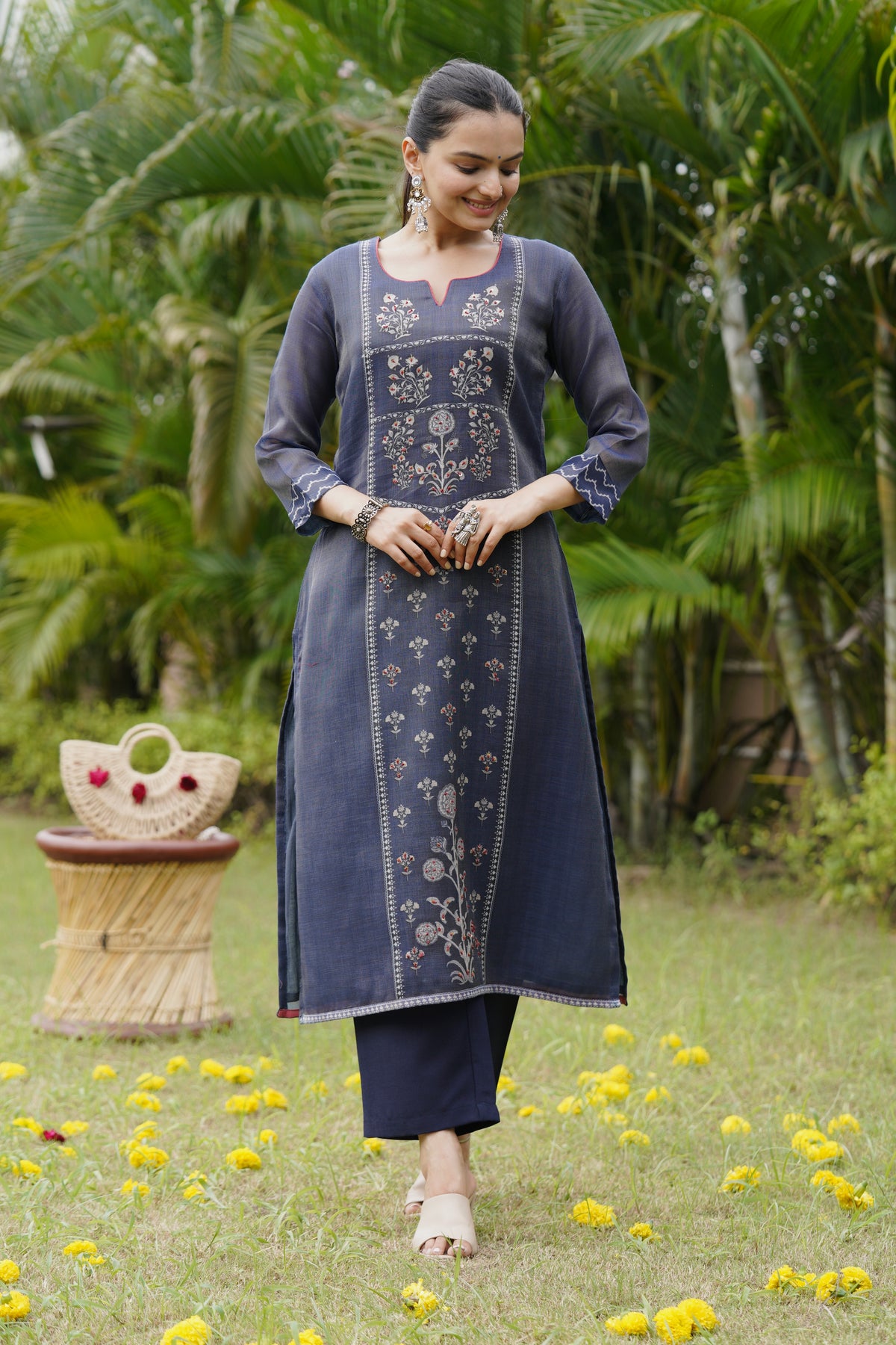 Grace meets tradition in this navy blue suit set featuring intricate threadwork and floral patterns. The kurta’s delicate detailing pairs beautifully with the scalloped dupatta, creating a refined ethnic look. Perfect for festive occasions, poojas, or family functions.