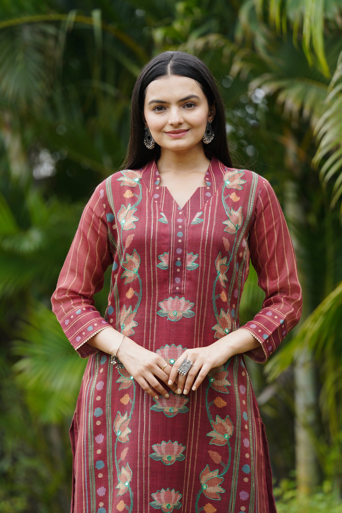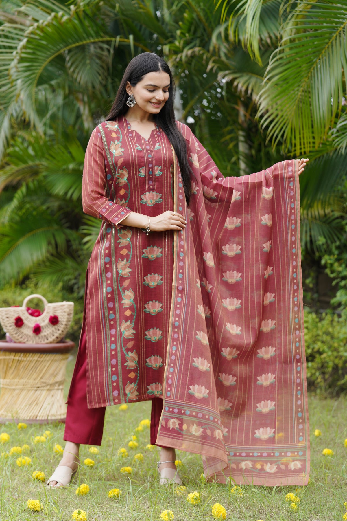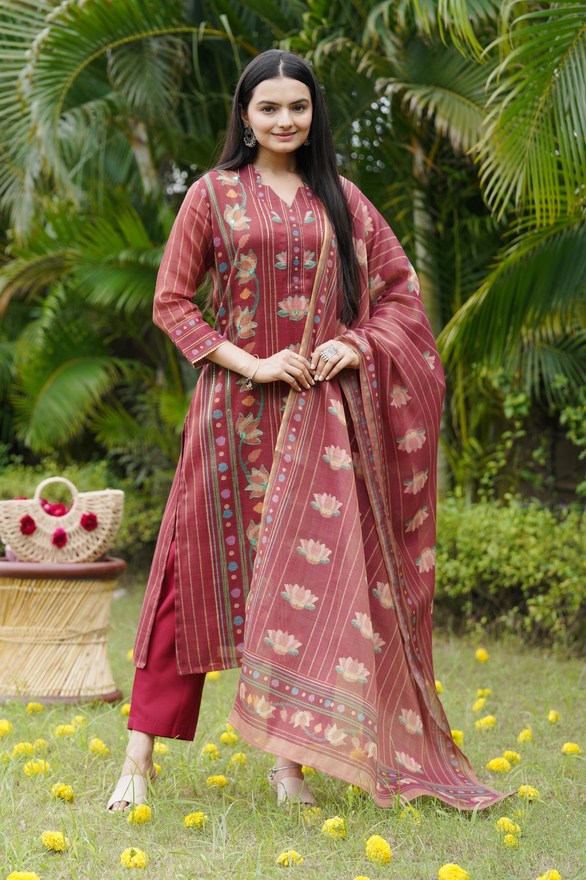 This beautiful suit set brings together traditional charm and soft elegance. The kurta is highlighted with lotus motifs and delicate handwork that adds a graceful touch to the overall design. The dupatta matches perfectly with its fine floral patterns, giving the whole look a balanced and festive feel. A perfect pick for those who love subtle beauty with a hint of tradition.