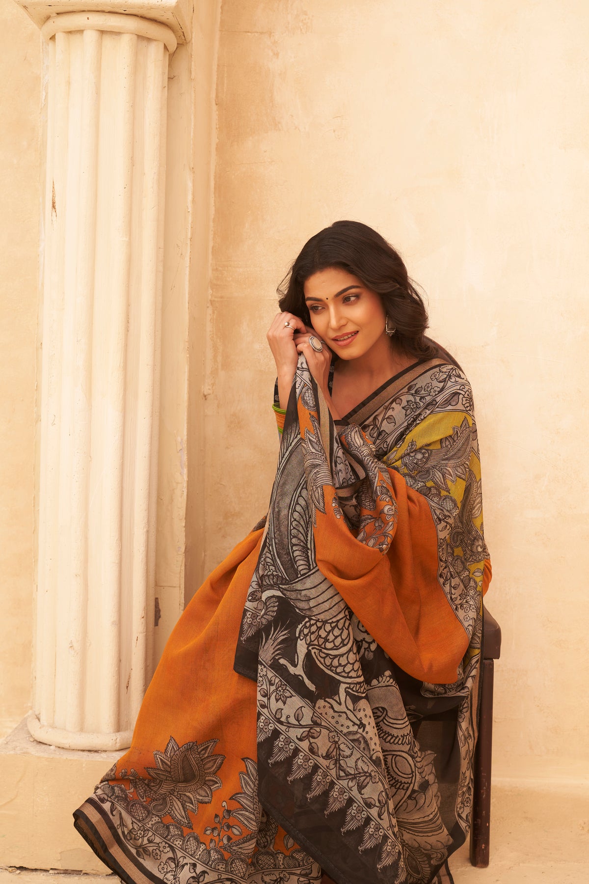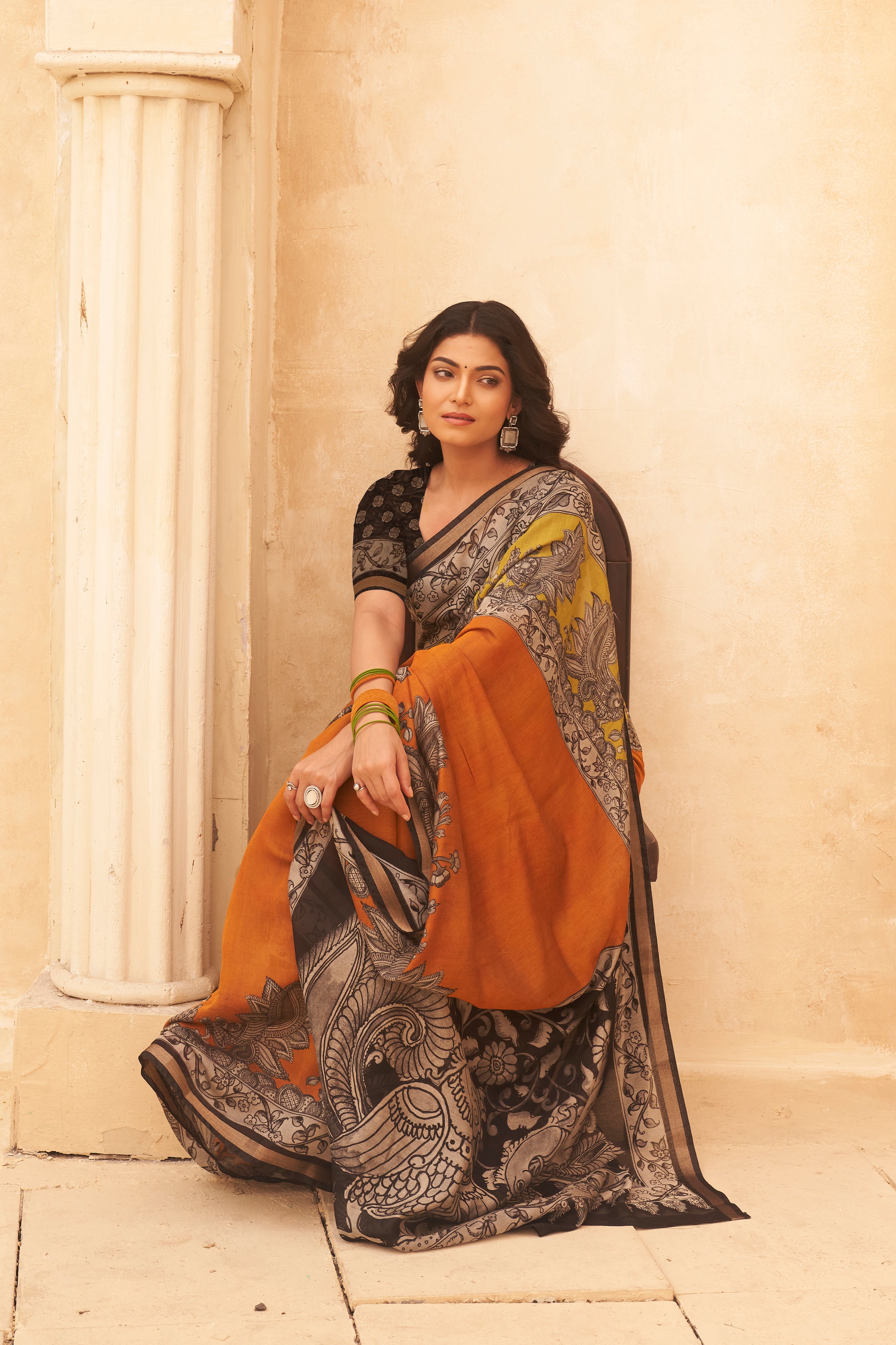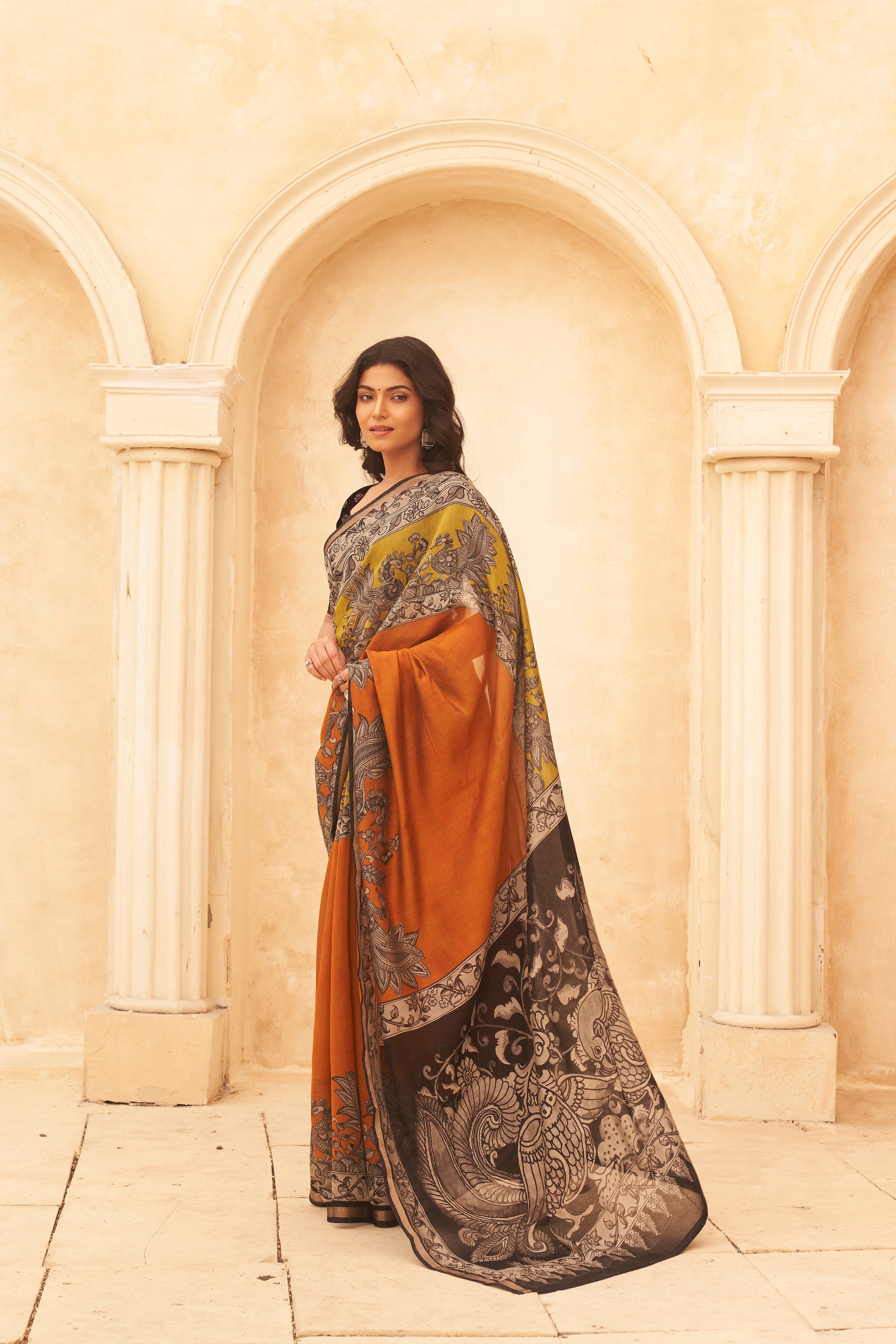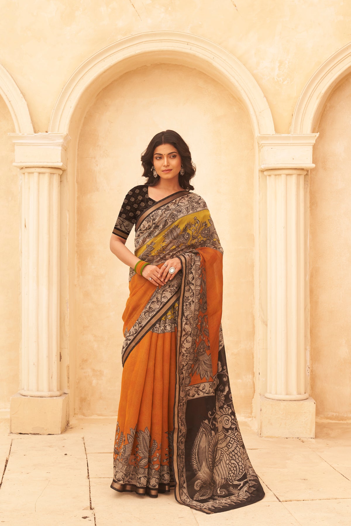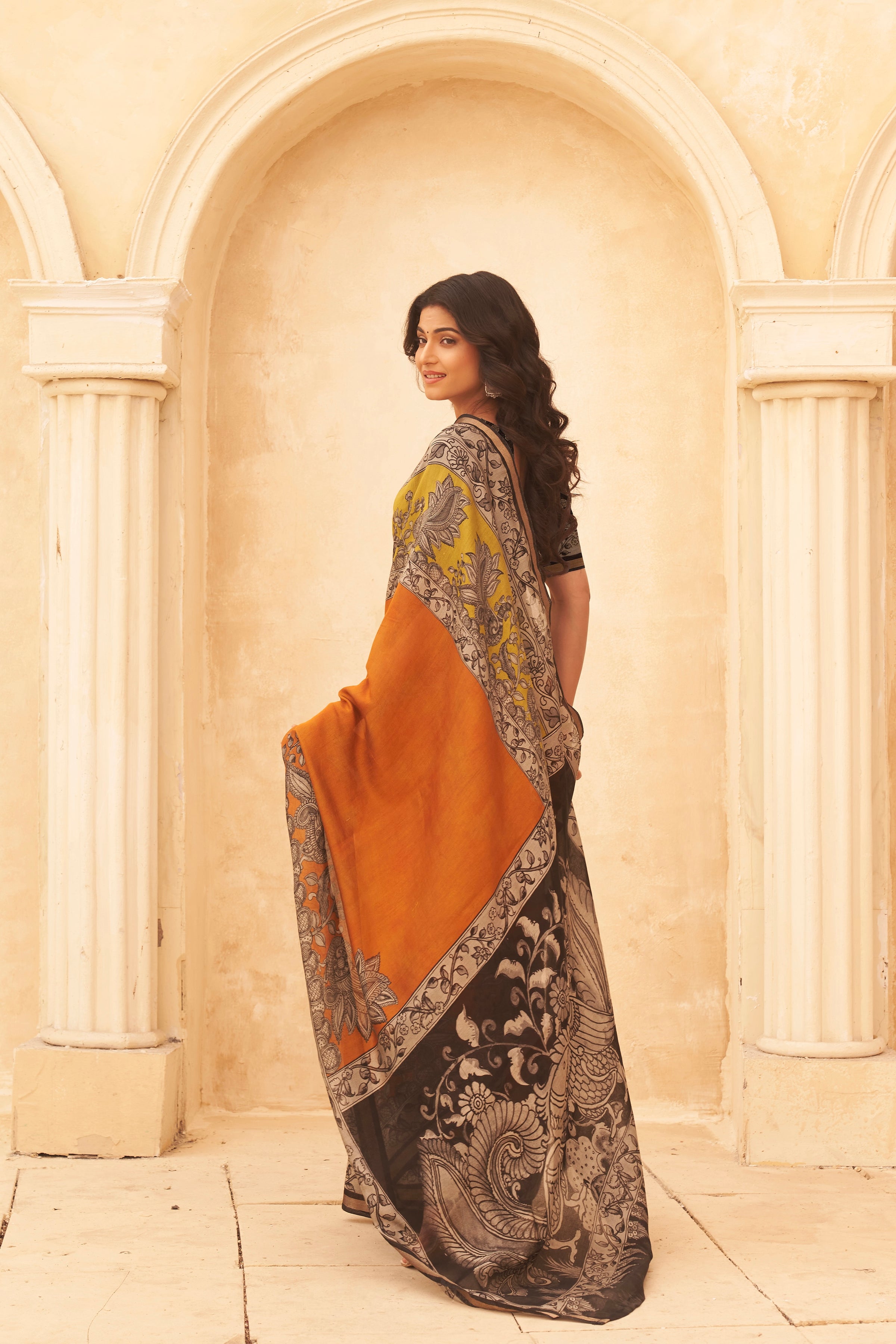 This saree blends rich rust-orange tones with olive-mustard highlights, finished with an intricate black and beige traditional border. Detailed motifs add a heritage charm, while the soft drape keeps the look graceful. Perfect for festive gatherings and elegant day occasions.