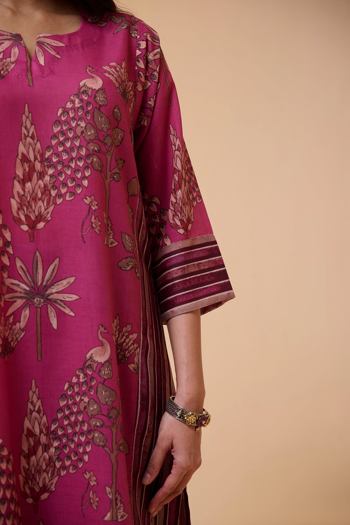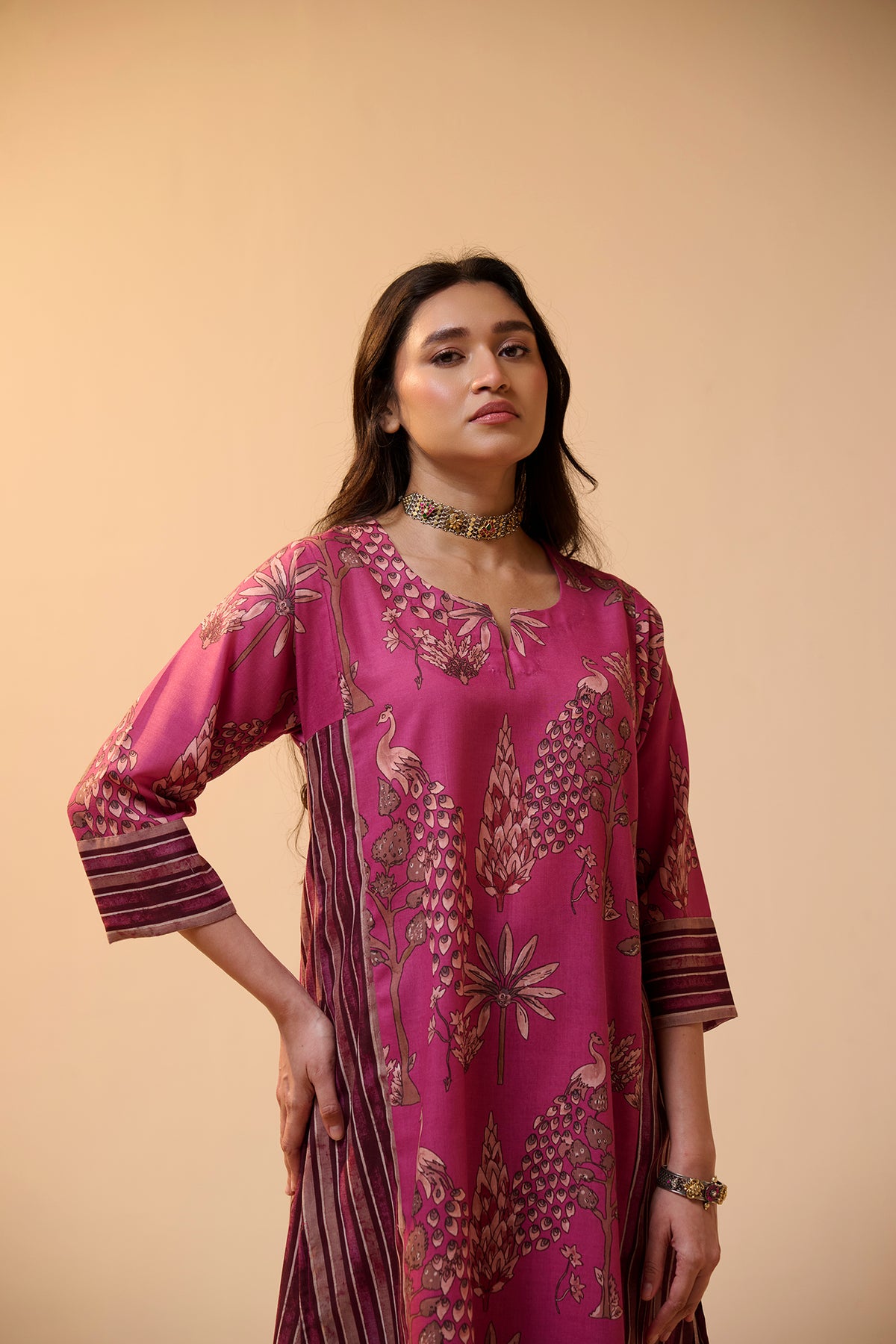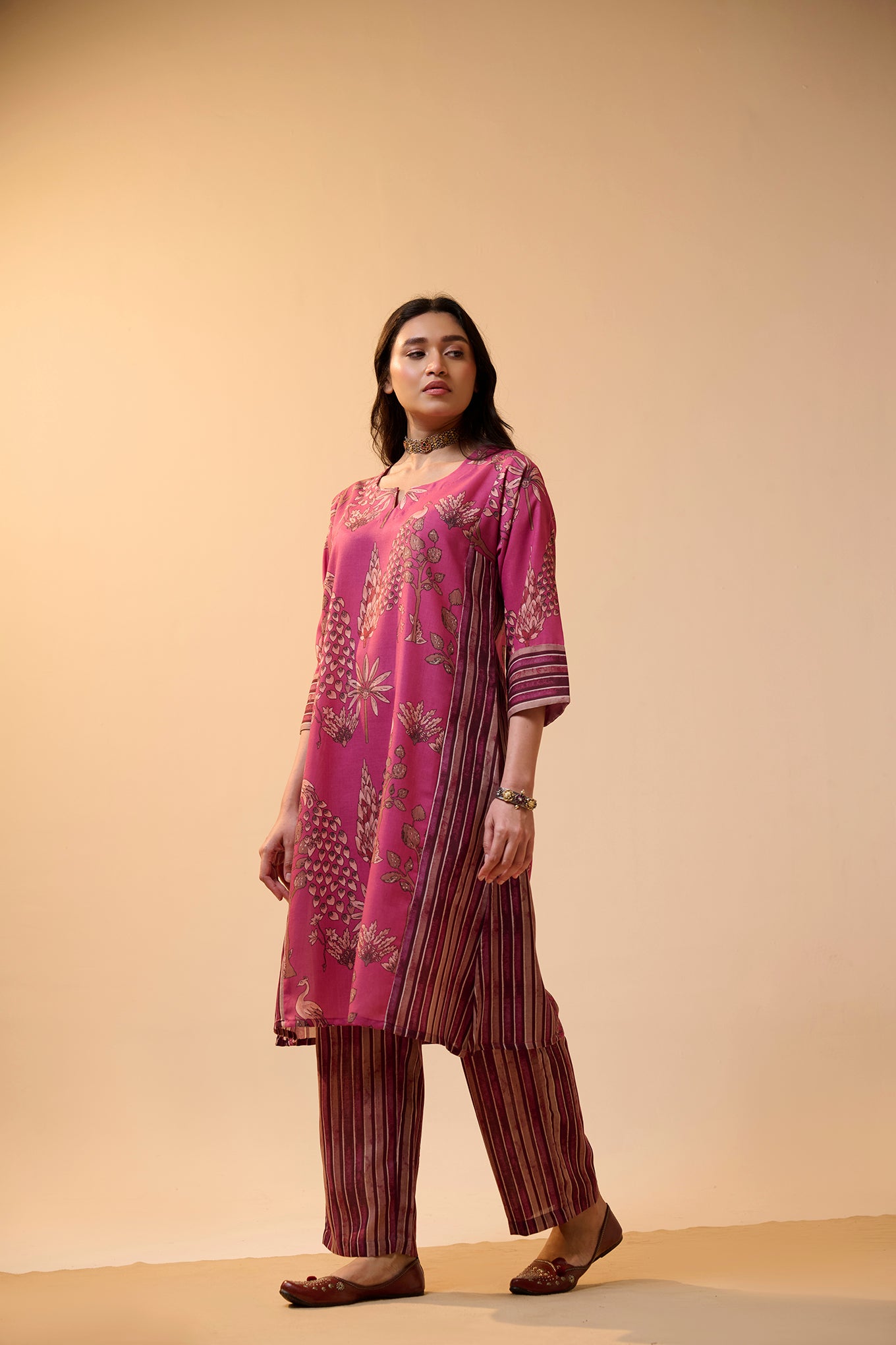 This kurta set features a bold floral print with detailed motifs spread across the front. The side panels have stripe patterns that add a stylish contrast to the overall look. It also comes with a one-sided pocket in the kurta for added convenience. The mix of prints gives it a trendy and eye-catching vibe. Perfect for a chic and modern ethnic outfit.