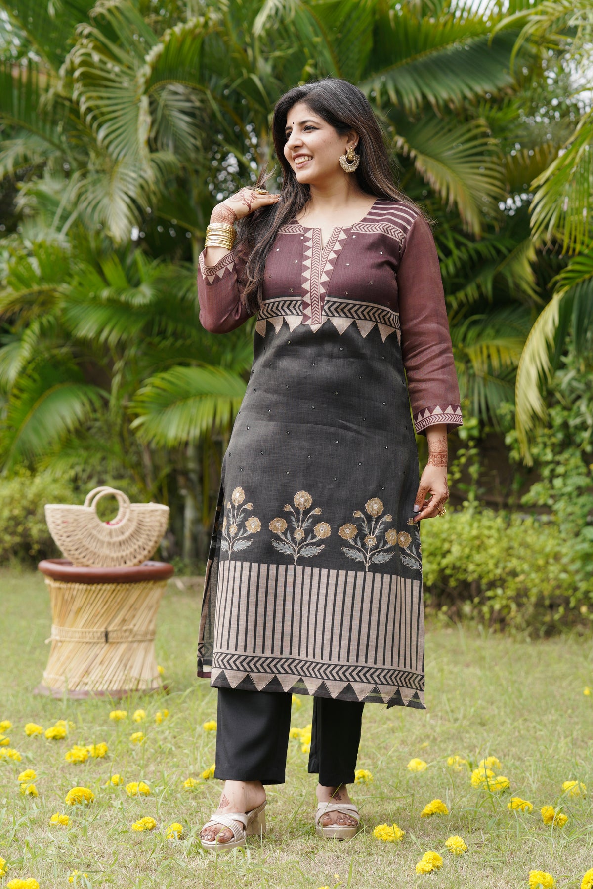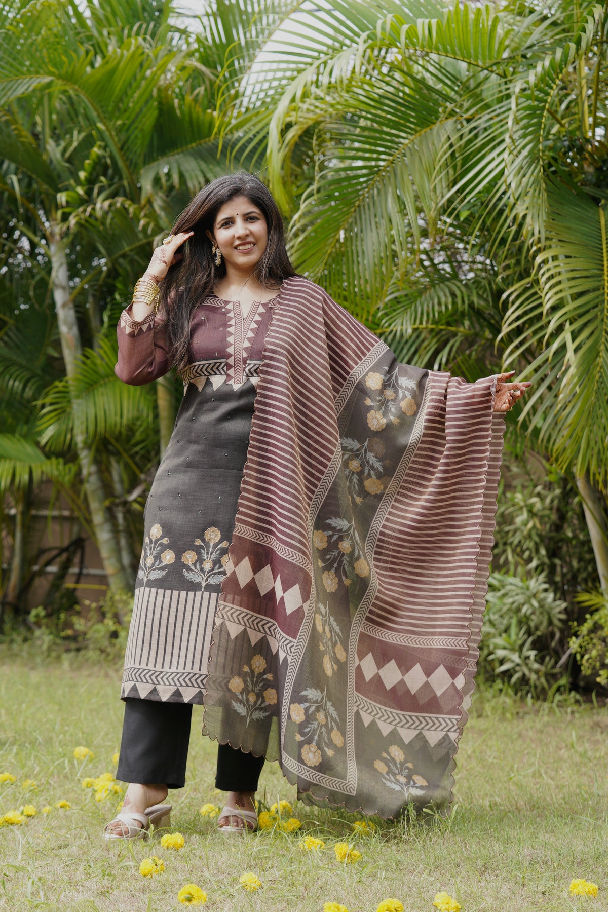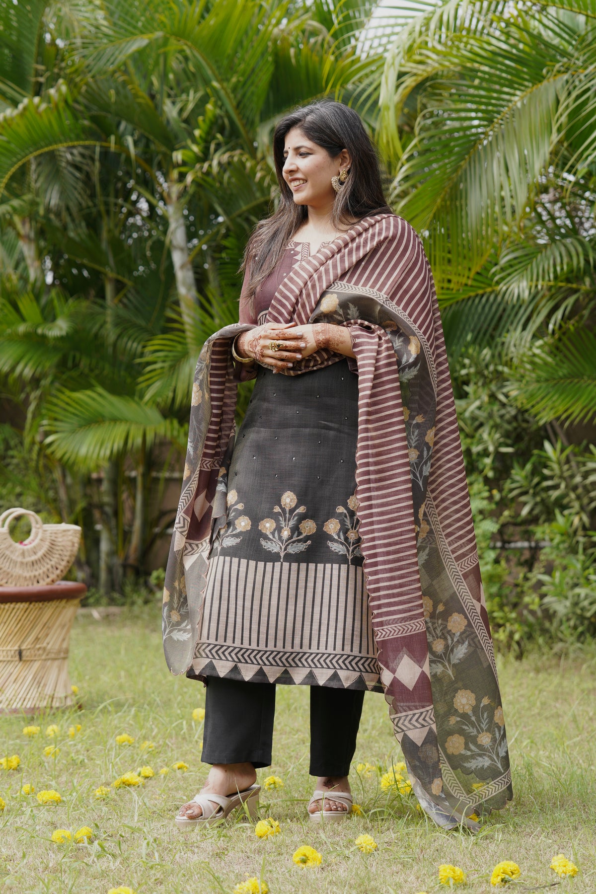 This plum and black suit set features beautiful floral prints and fine handwork on the kurta, adding a touch of traditional charm. The kurta is crafted with neat detailing that makes it stand out. Paired with a scallop-edged dupatta and comfortable matching pants, this set is perfect for festive events or day outings. Soft fabric and graceful design make it a must-have for your wardrobe.