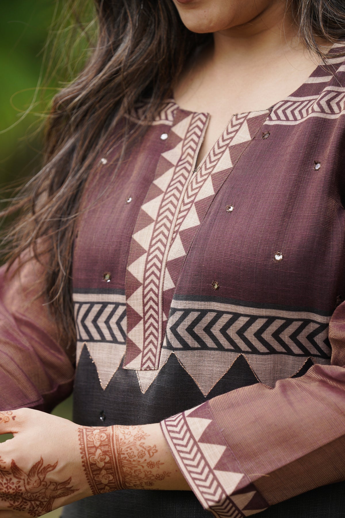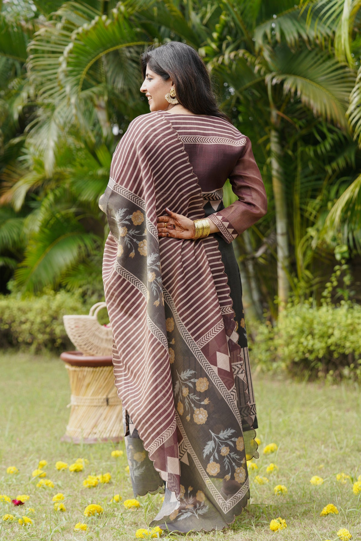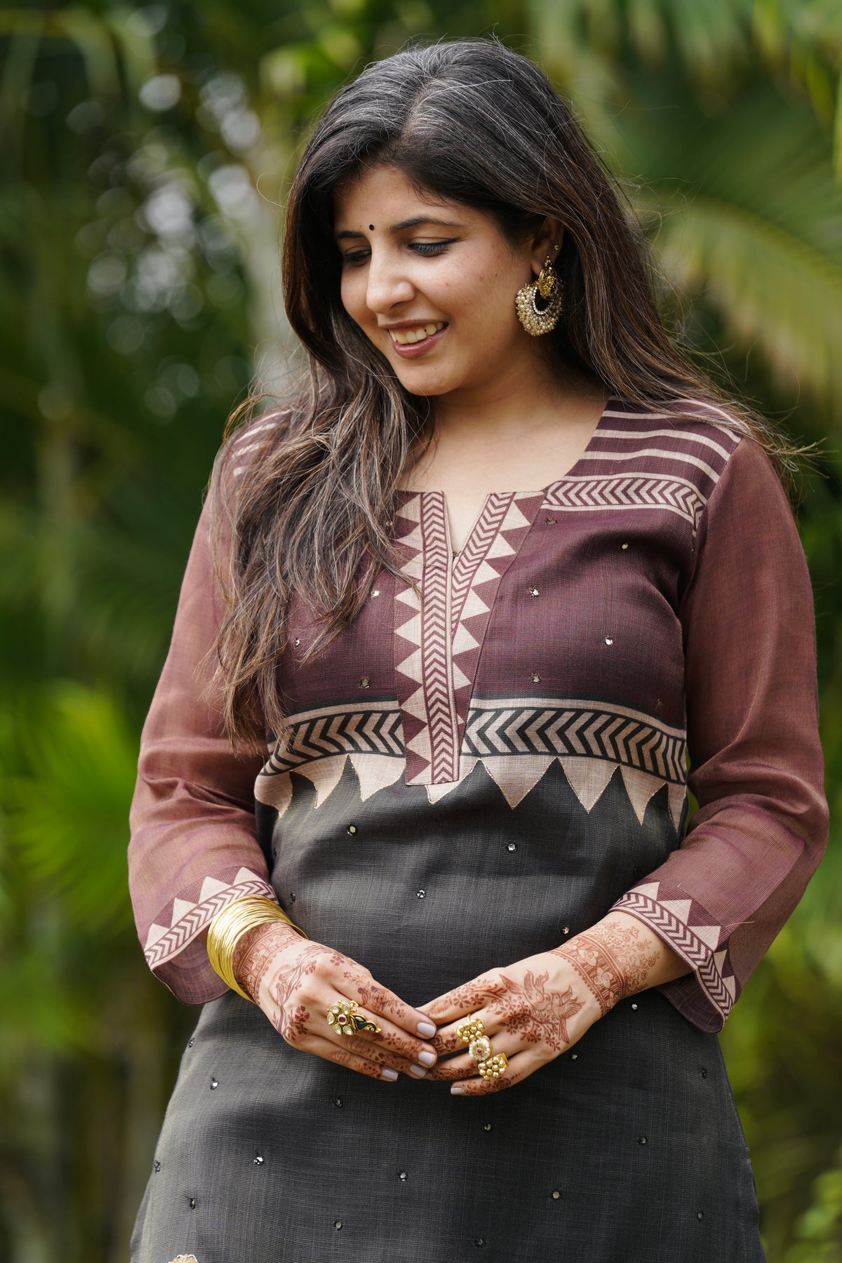 This plum and black suit set features beautiful floral prints and fine handwork on the kurta, adding a touch of traditional charm. The kurta is crafted with neat detailing that makes it stand out. Paired with a scallop-edged dupatta and comfortable matching pants, this set is perfect for festive events or day outings. Soft fabric and graceful design make it a must-have for your wardrobe.