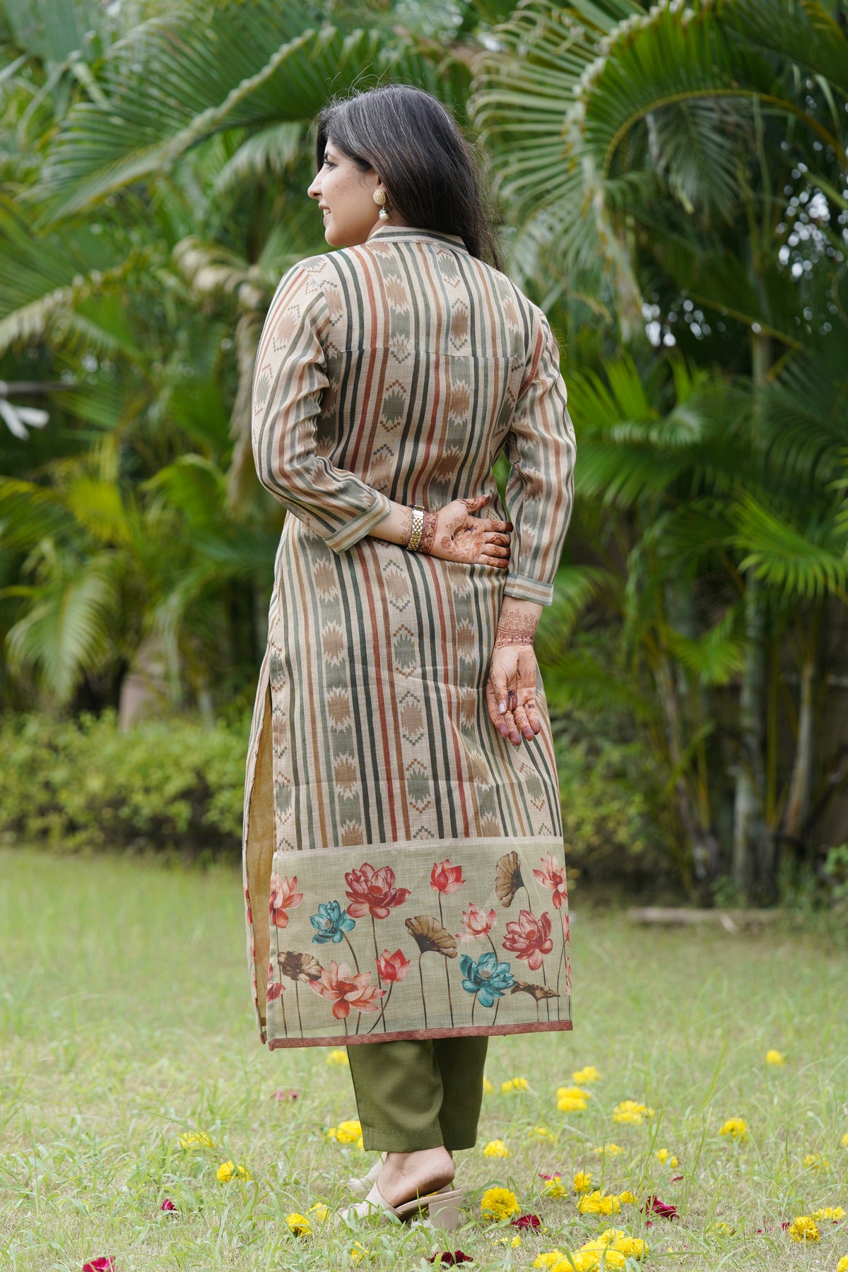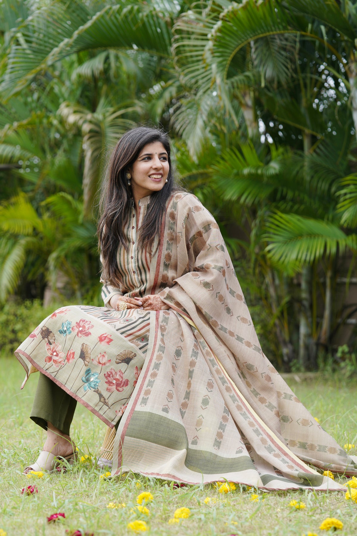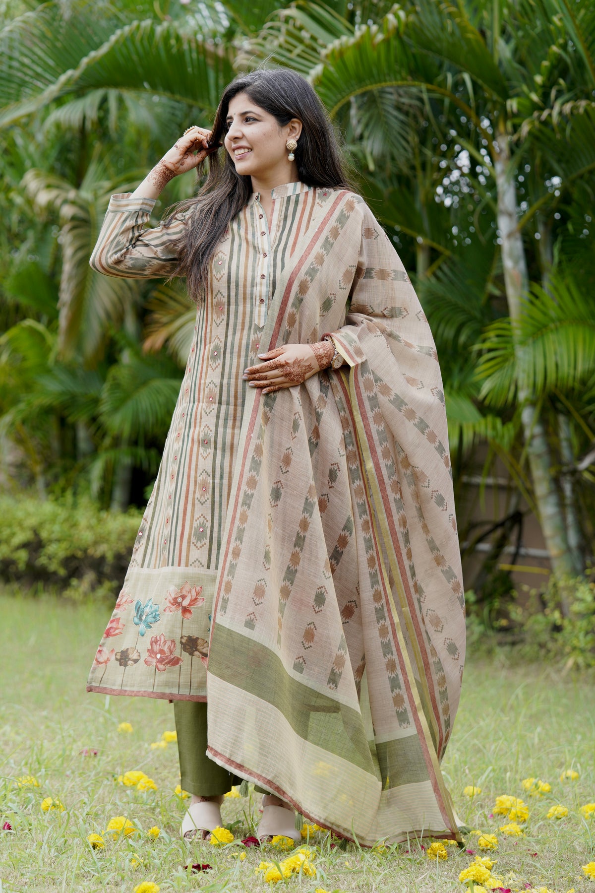 This elegant suit set comes with soft stripes and pretty floral designs on the kurta. The dupatta has matching patterns with beautiful shapes and calm, earthy colors. Lotus flowers near the bottom of the kurta add a special touch. It’s a perfect outfit for a simple, stylish, and traditional look.
