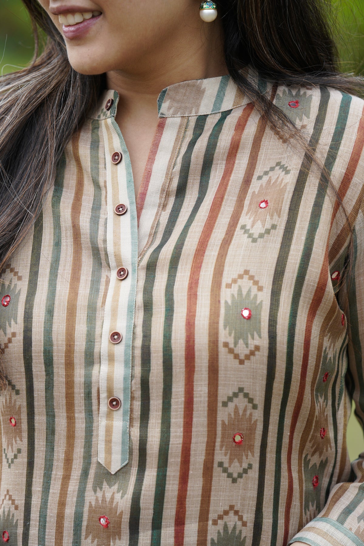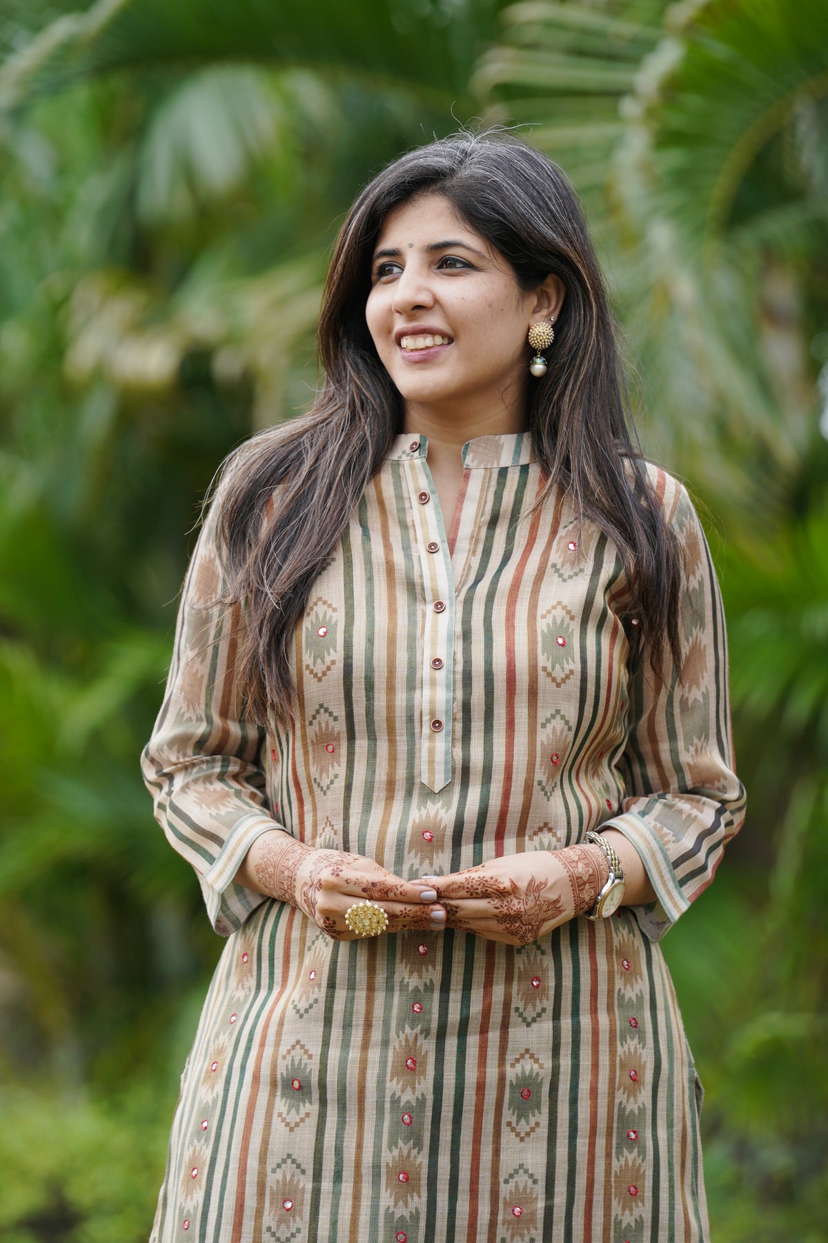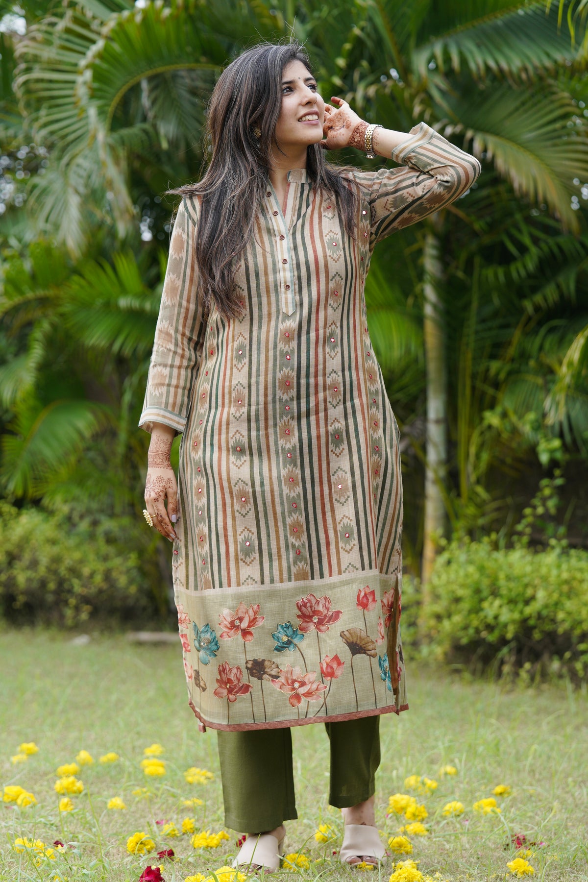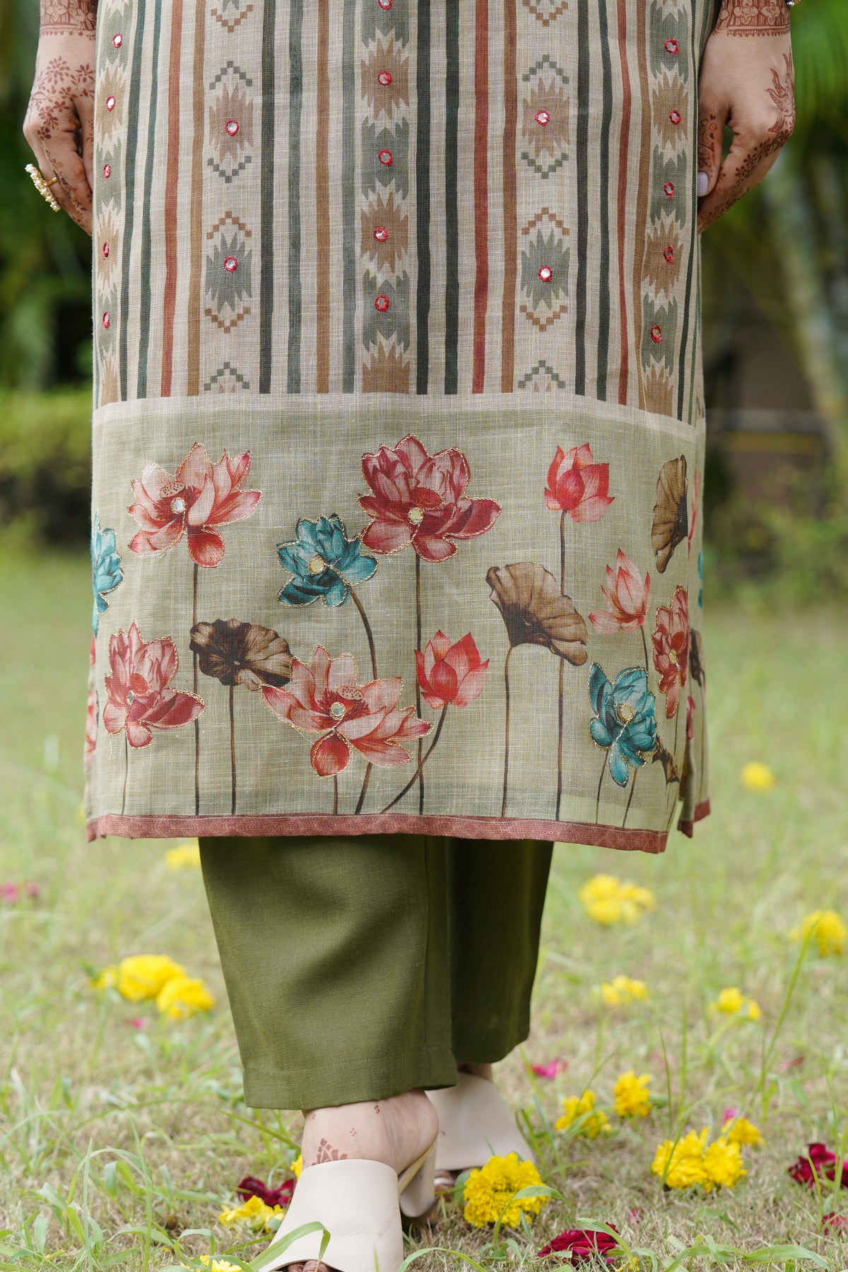 This elegant suit set comes with soft stripes and pretty floral designs on the kurta. The dupatta has matching patterns with beautiful shapes and calm, earthy colors. Lotus flowers near the bottom of the kurta add a special touch. It’s a perfect outfit for a simple, stylish, and traditional look.