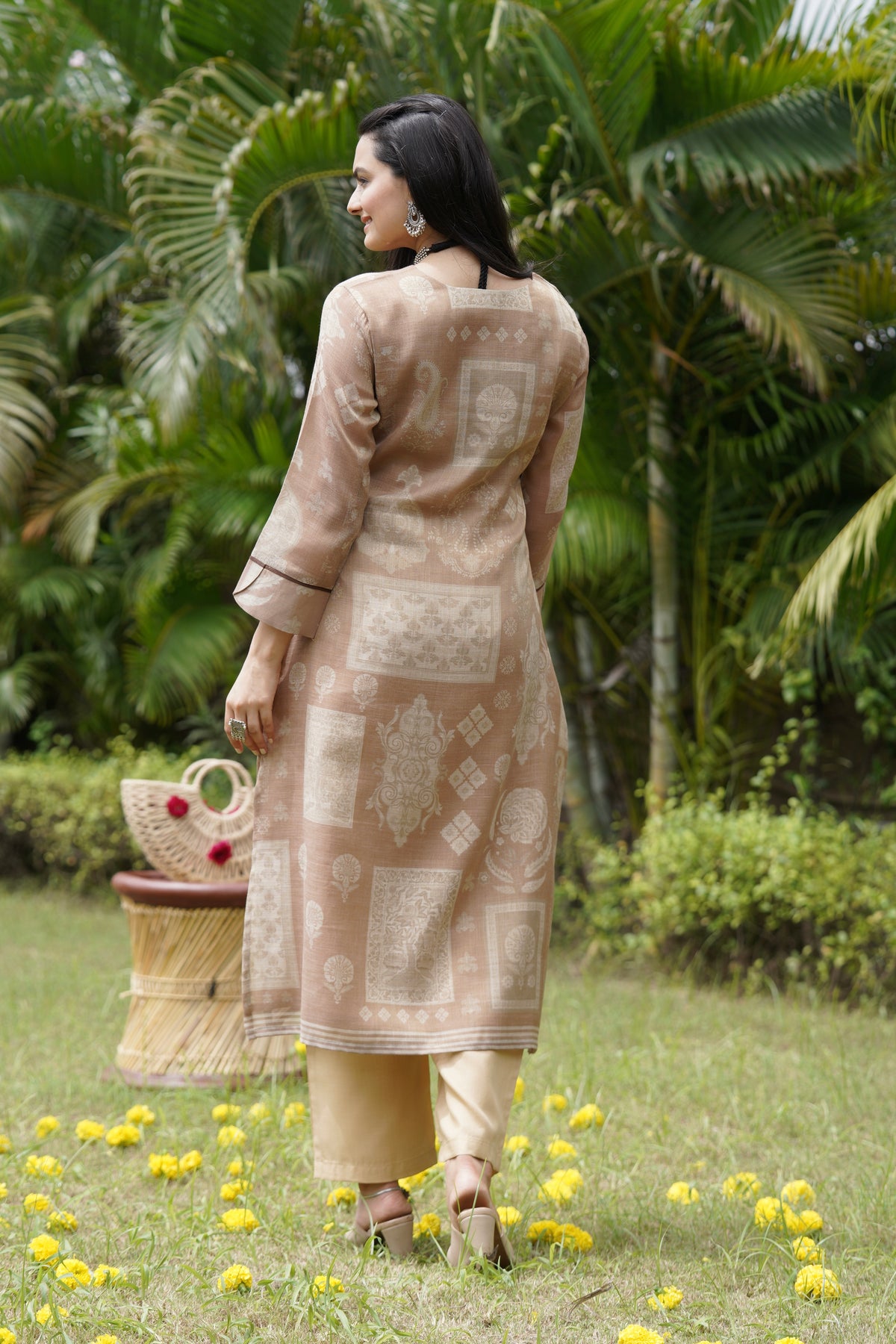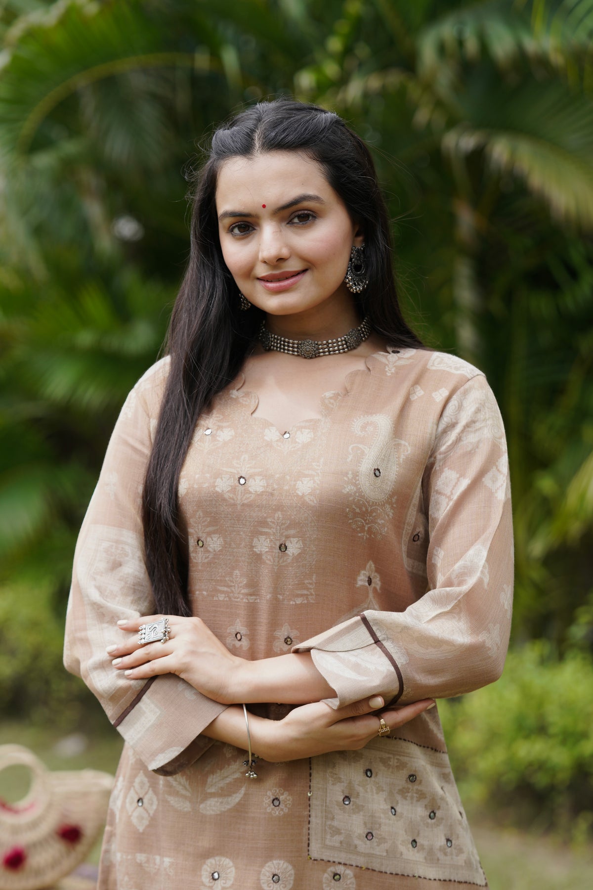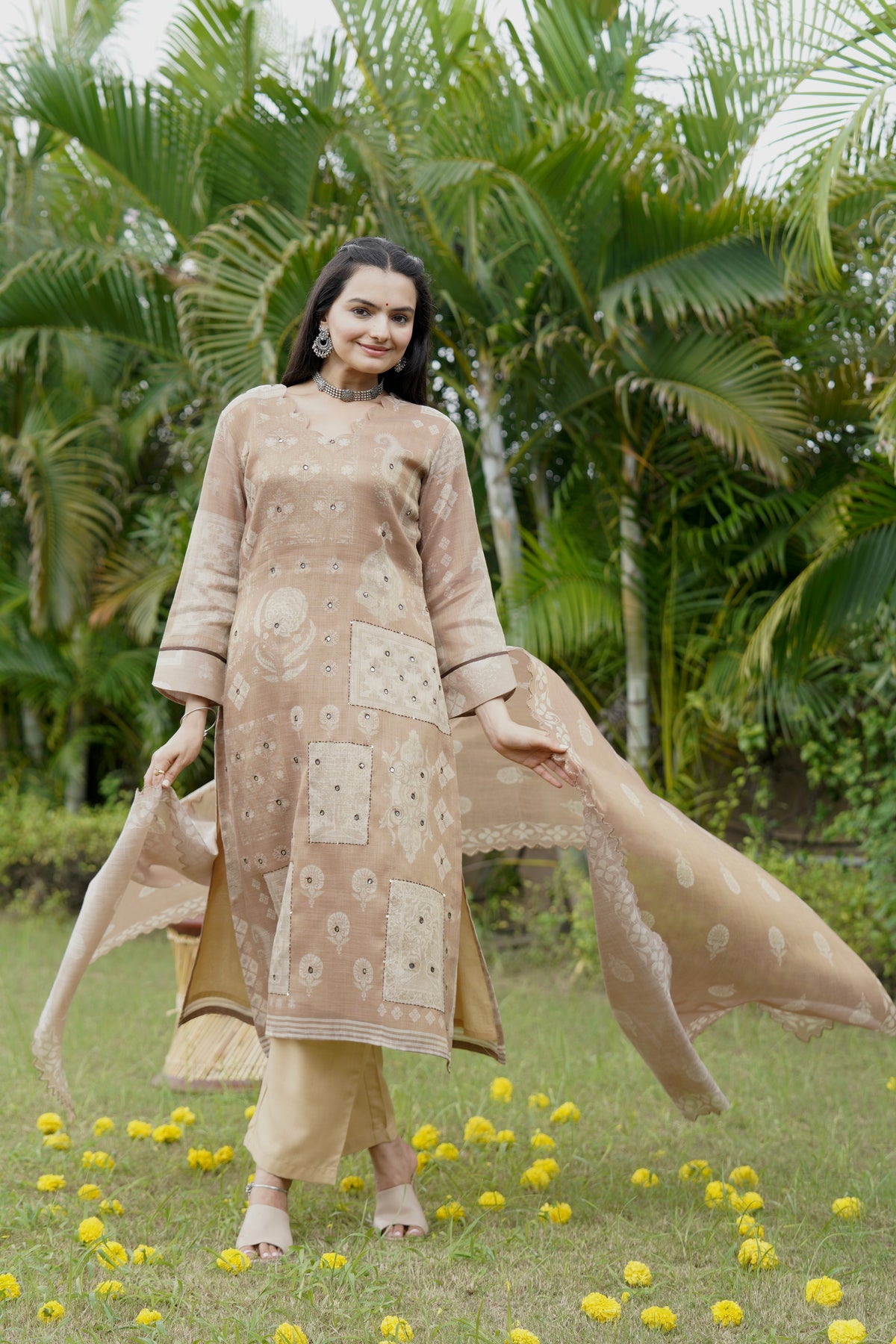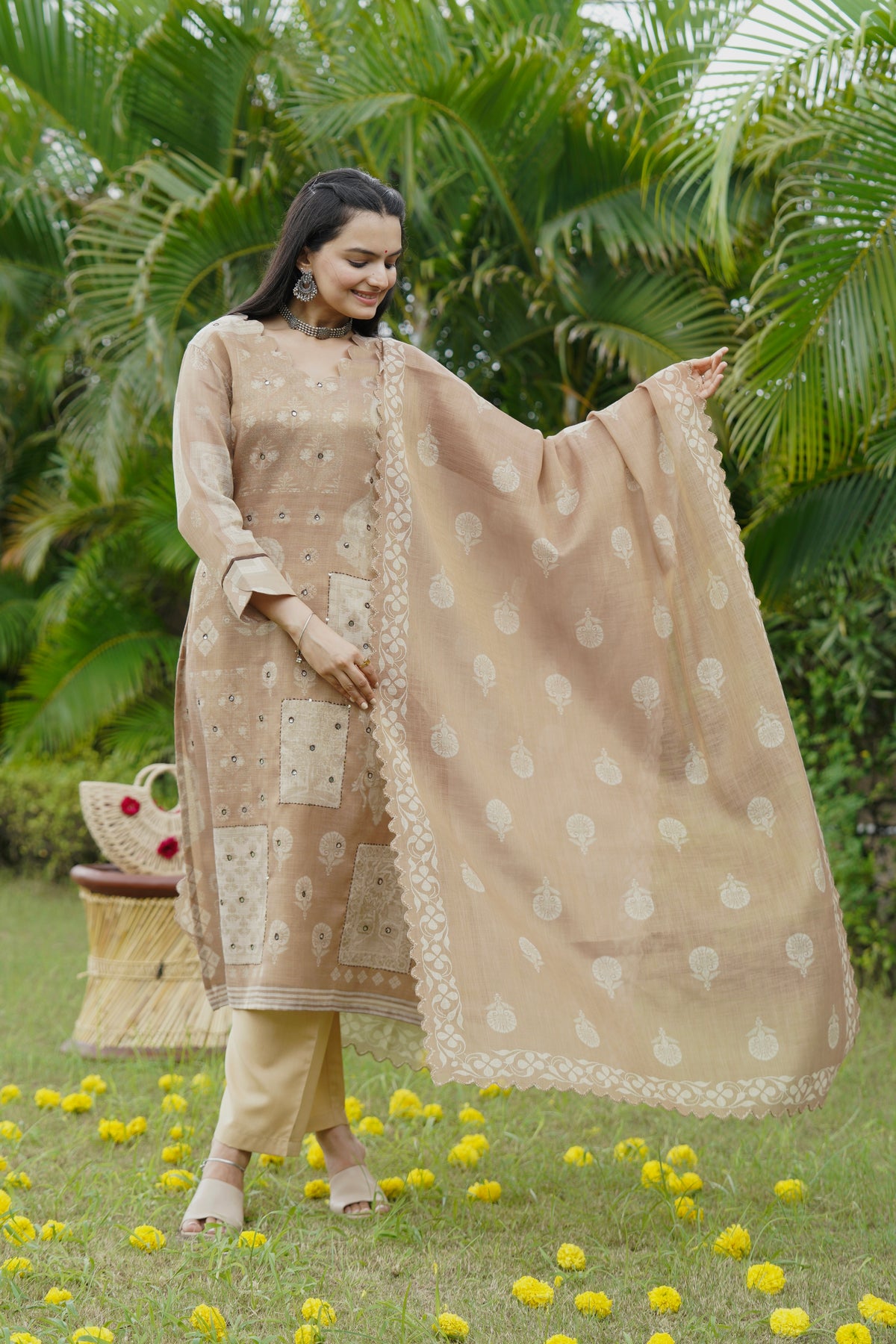 This beige suit set brings together delicate handwork with subtle traditional charm. The kurta features embroidered mirror highlights and patch-style motifs that add depth and texture. The soft dupatta is adorned with woven tree-inspired buttas and a scalloped border that adds a graceful finishing touch. Ideal for festive brunches, poojas, or elegant daywear.