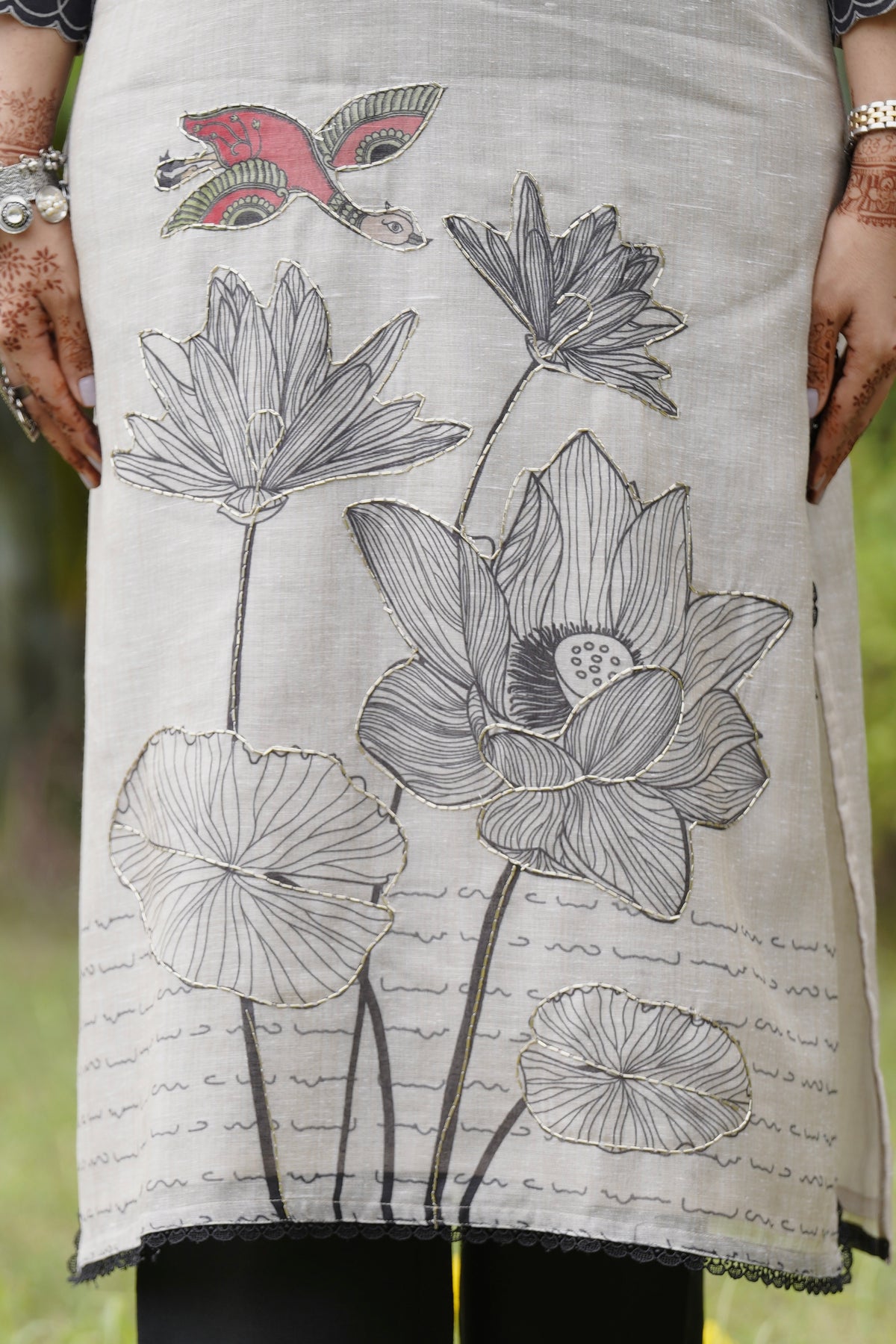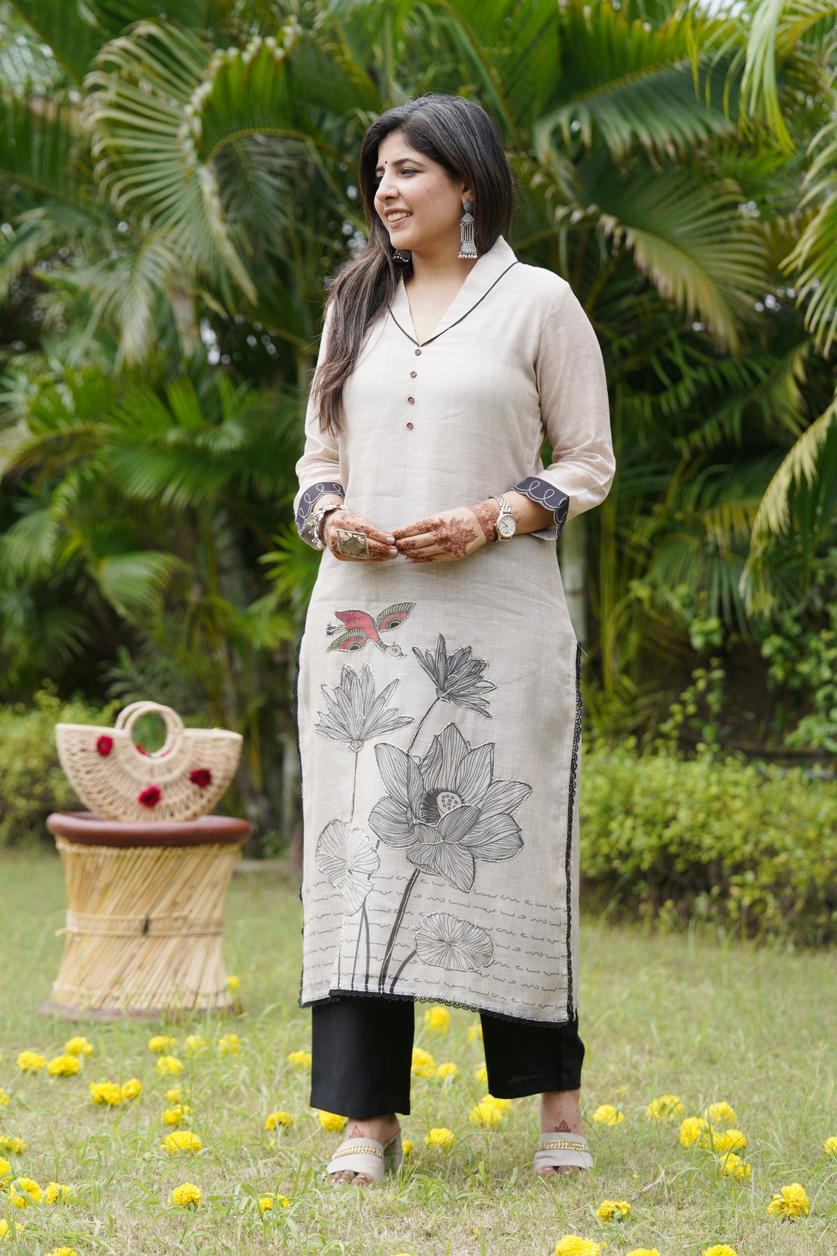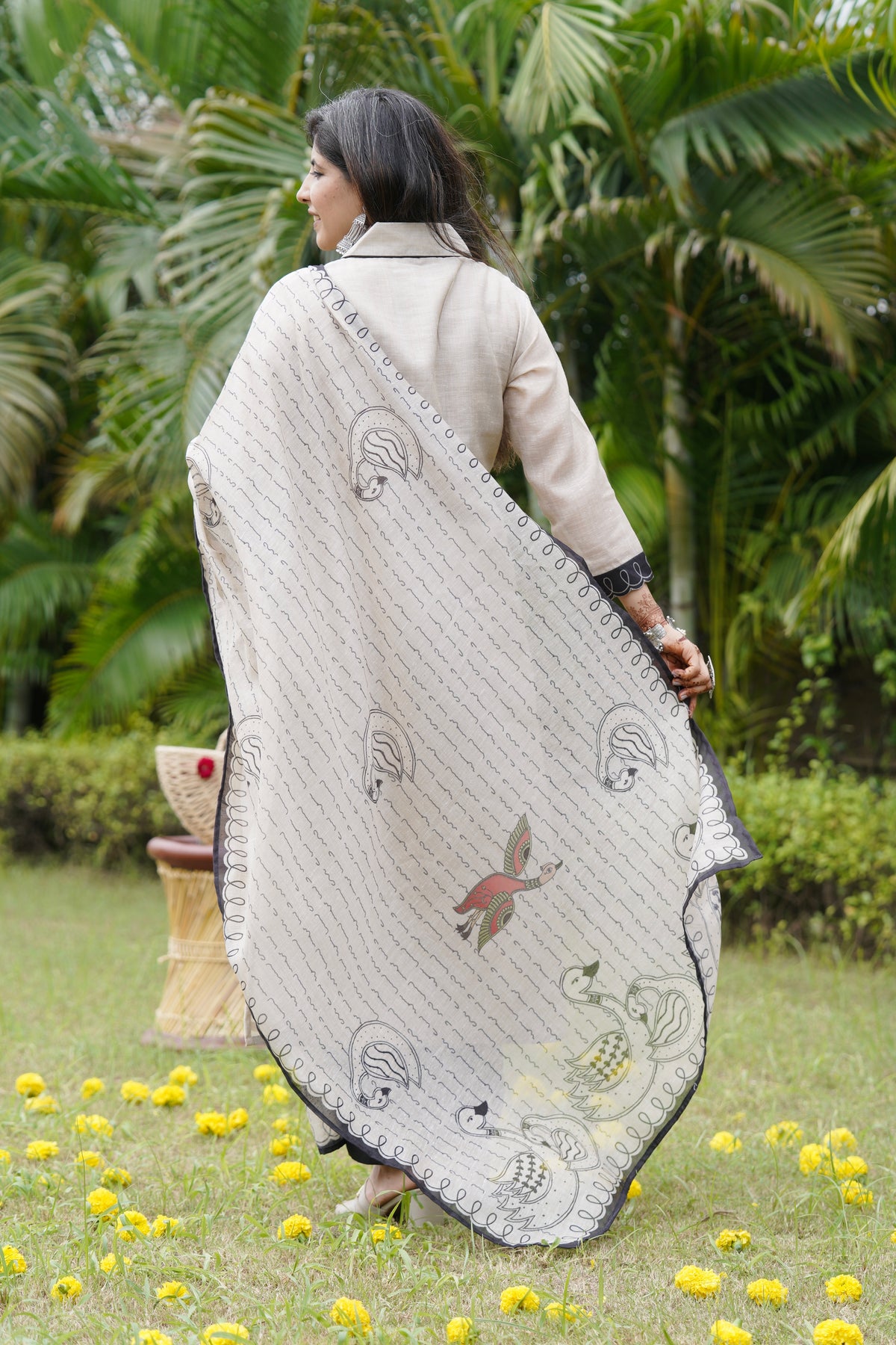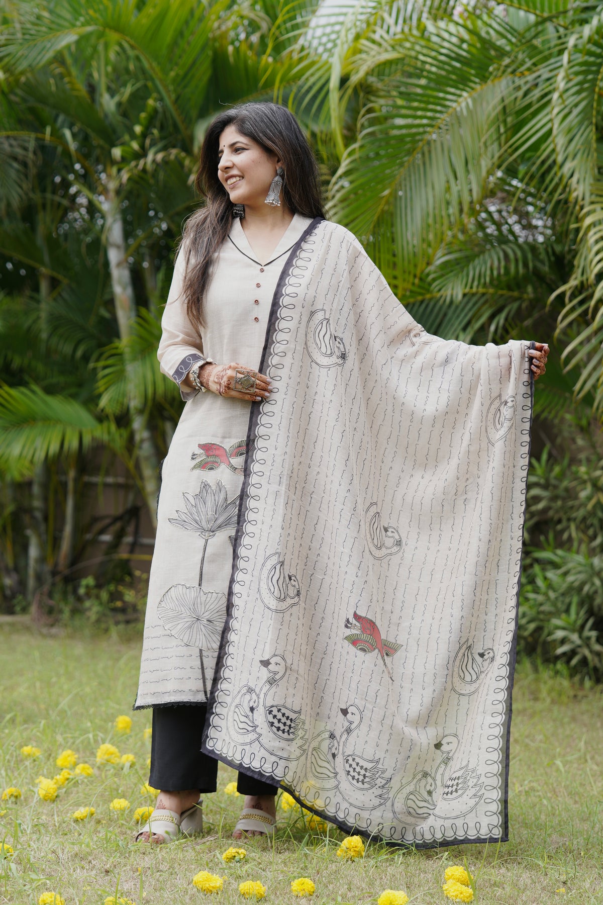 This ivory-beige suit set captures the calm beauty of nature with its soft lotus blooms and flying bird motifs — symbolising purity, freedom, and grace. The matching dupatta features elegant swans and intricate line patterns that bring a serene, lakeside charm to the look. Accents of red and green on a soothing base make it both earthy and striking. Crafted in breathable fabric, it's a perfect pick for festive mornings, poojas, or meaningful daywear.