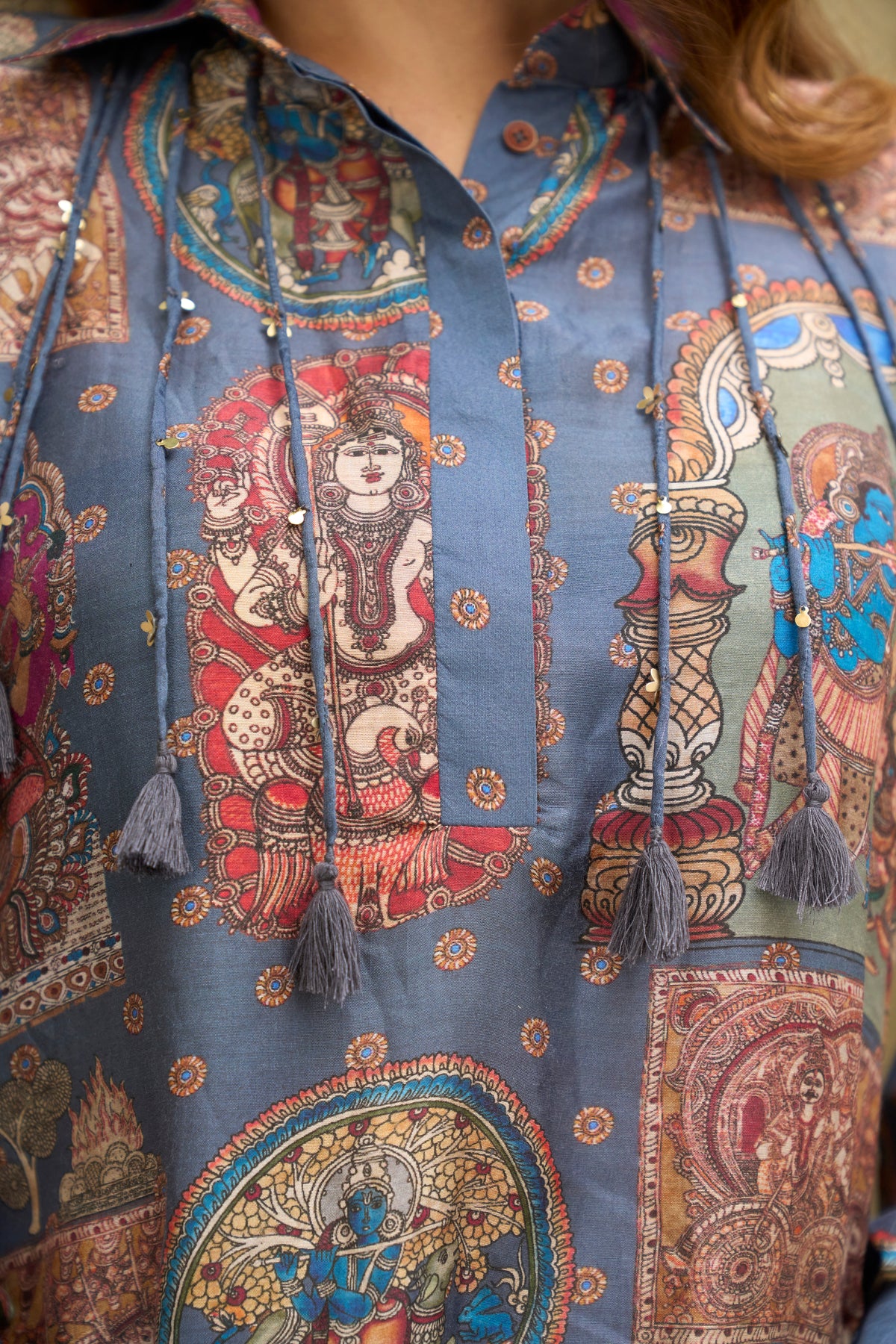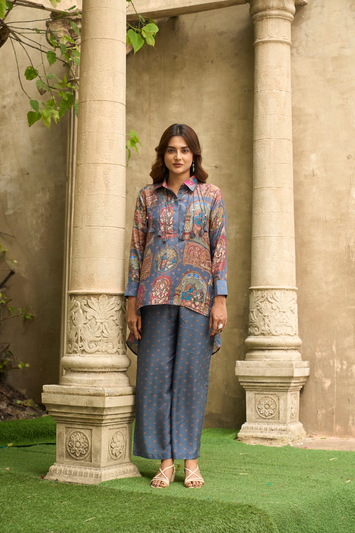 A stylish pure fine silk co-ord set in blue with multicolor artistic prints. The top comes with a collared neckline, button-down front, and tie strings. It is paired with printed straight pants for a relaxed and smart look.