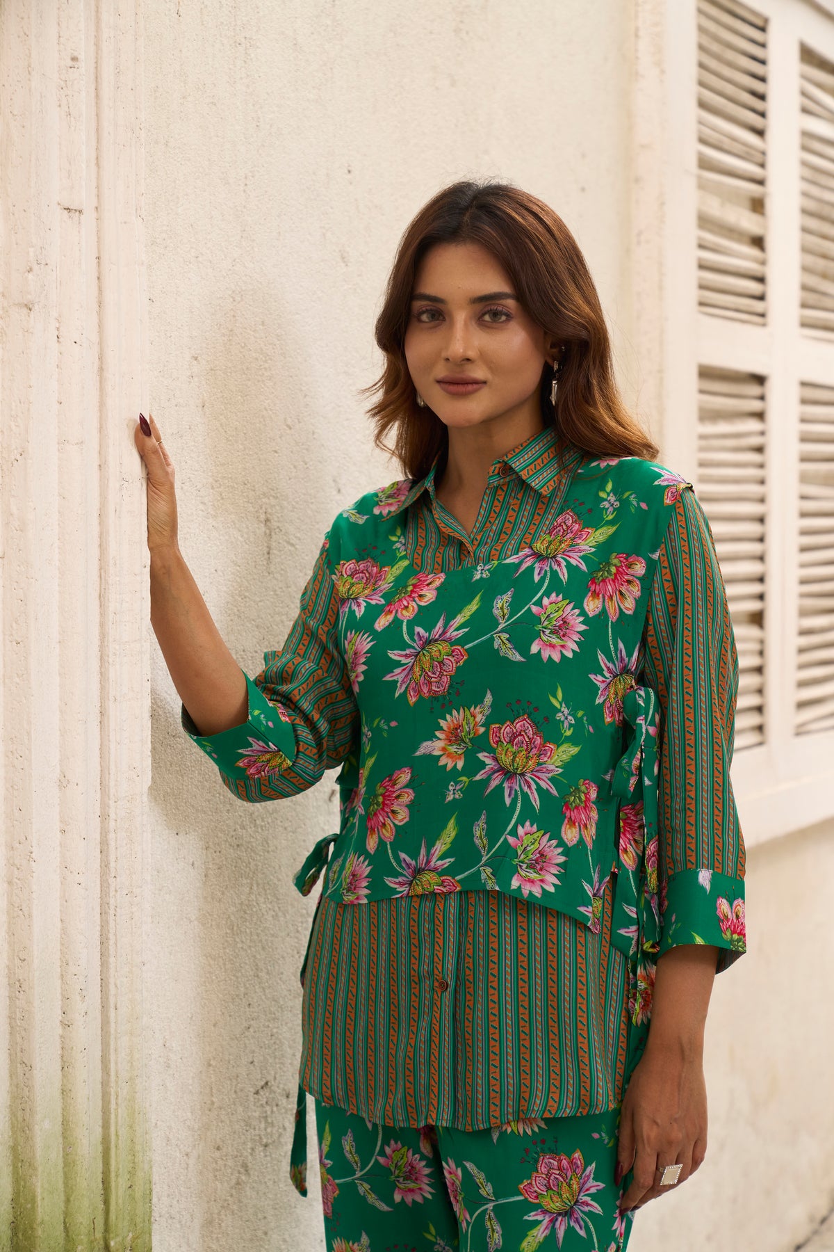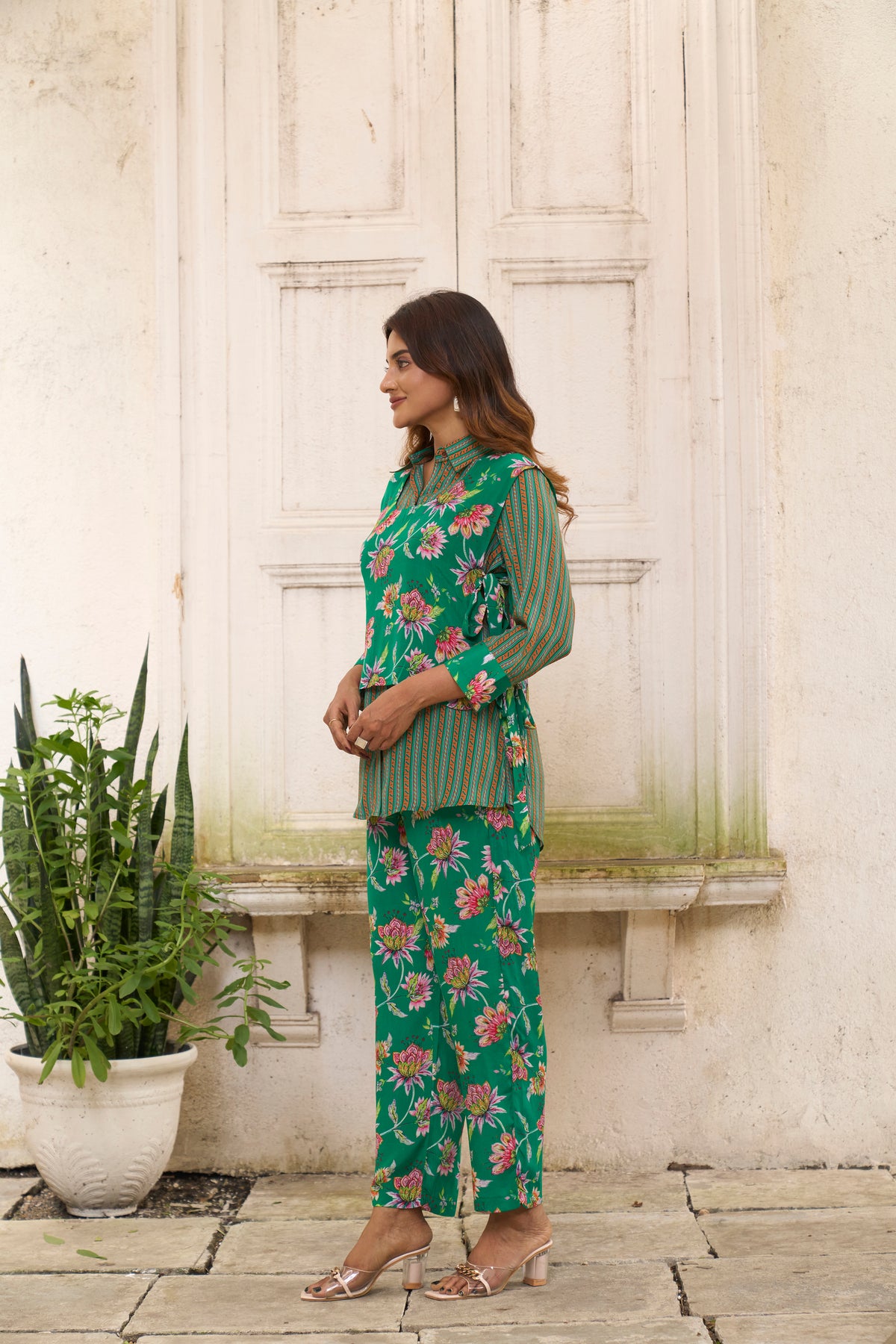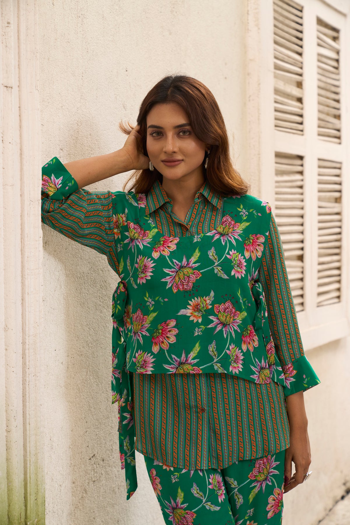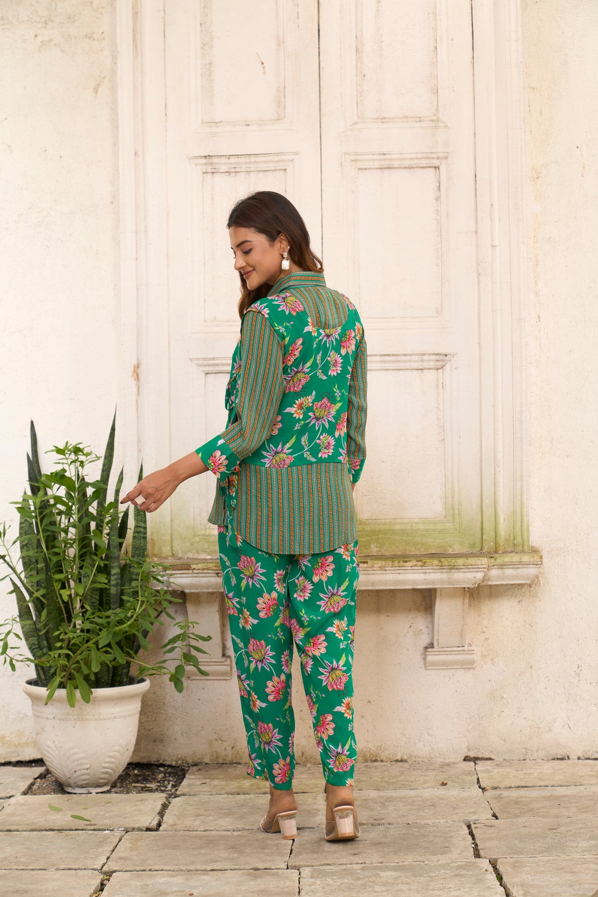 This co-ord set is a lively mix of bold florals and subtle stripes, giving it a fresh and playful vibe. The vibrant green base makes the pink and yellow flowers pop, adding a cheerful touch. The striped detailing breaks the monotony and adds a structured contrast to the overall look. Perfect for making a statement while staying effortlessly chic.