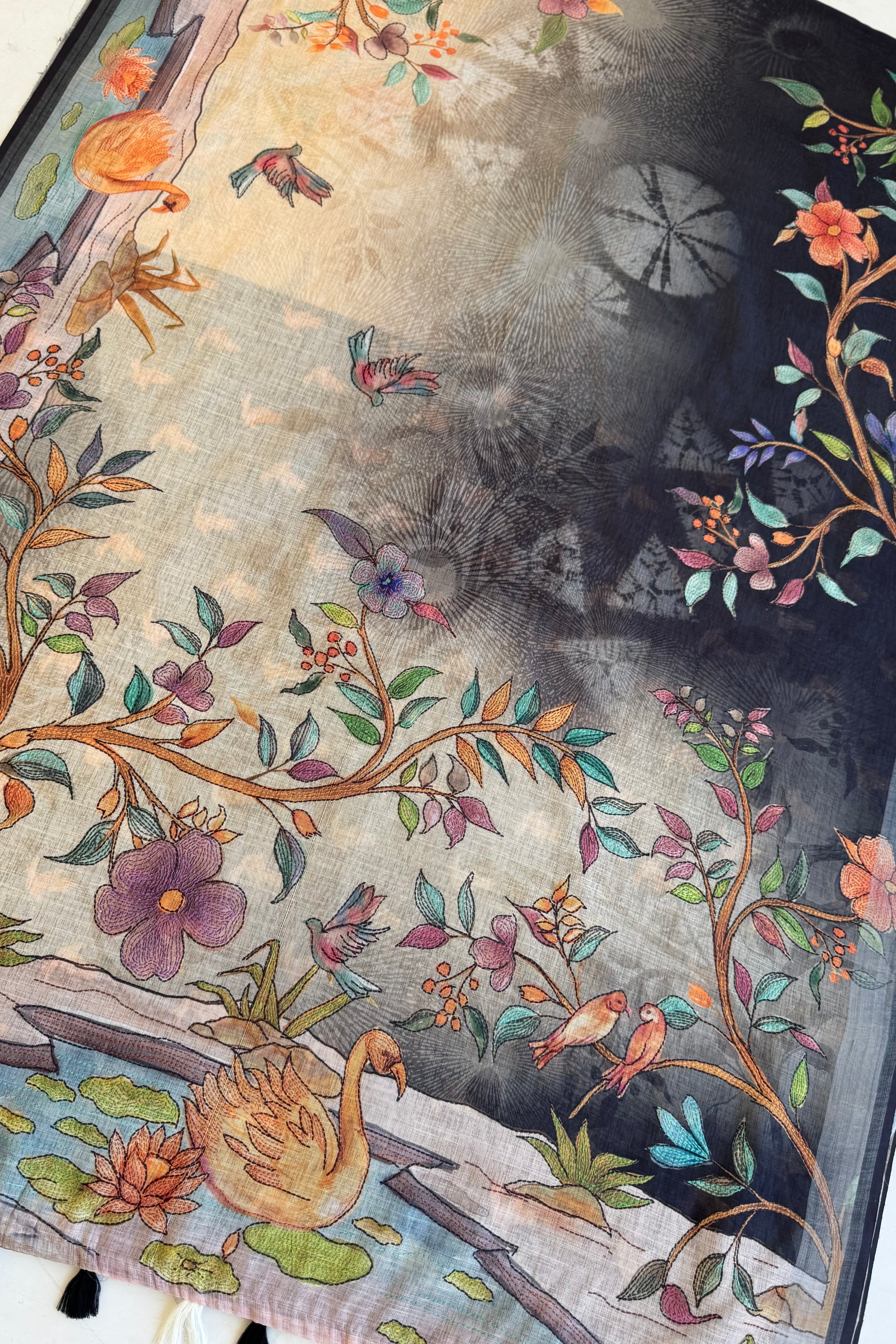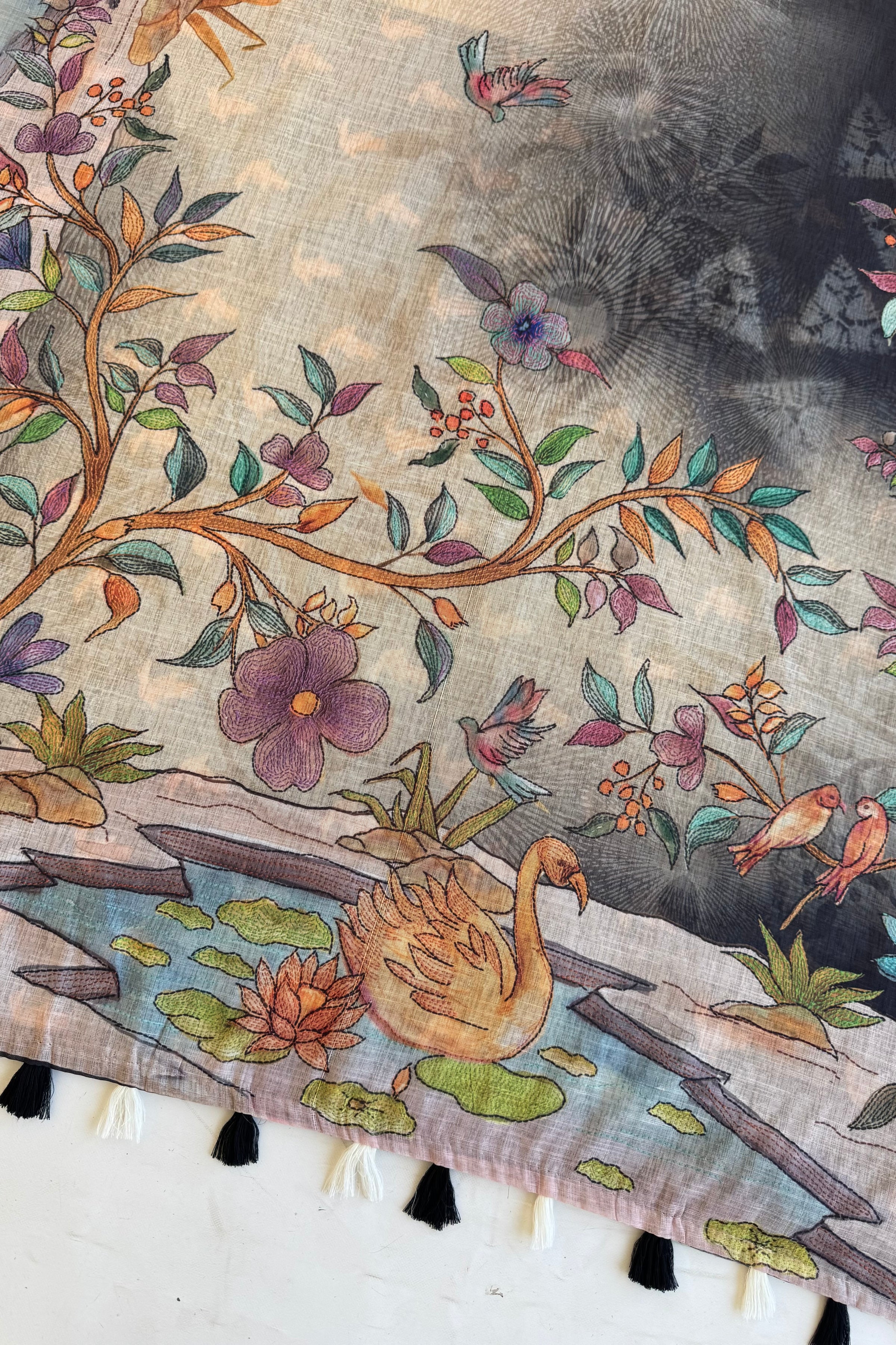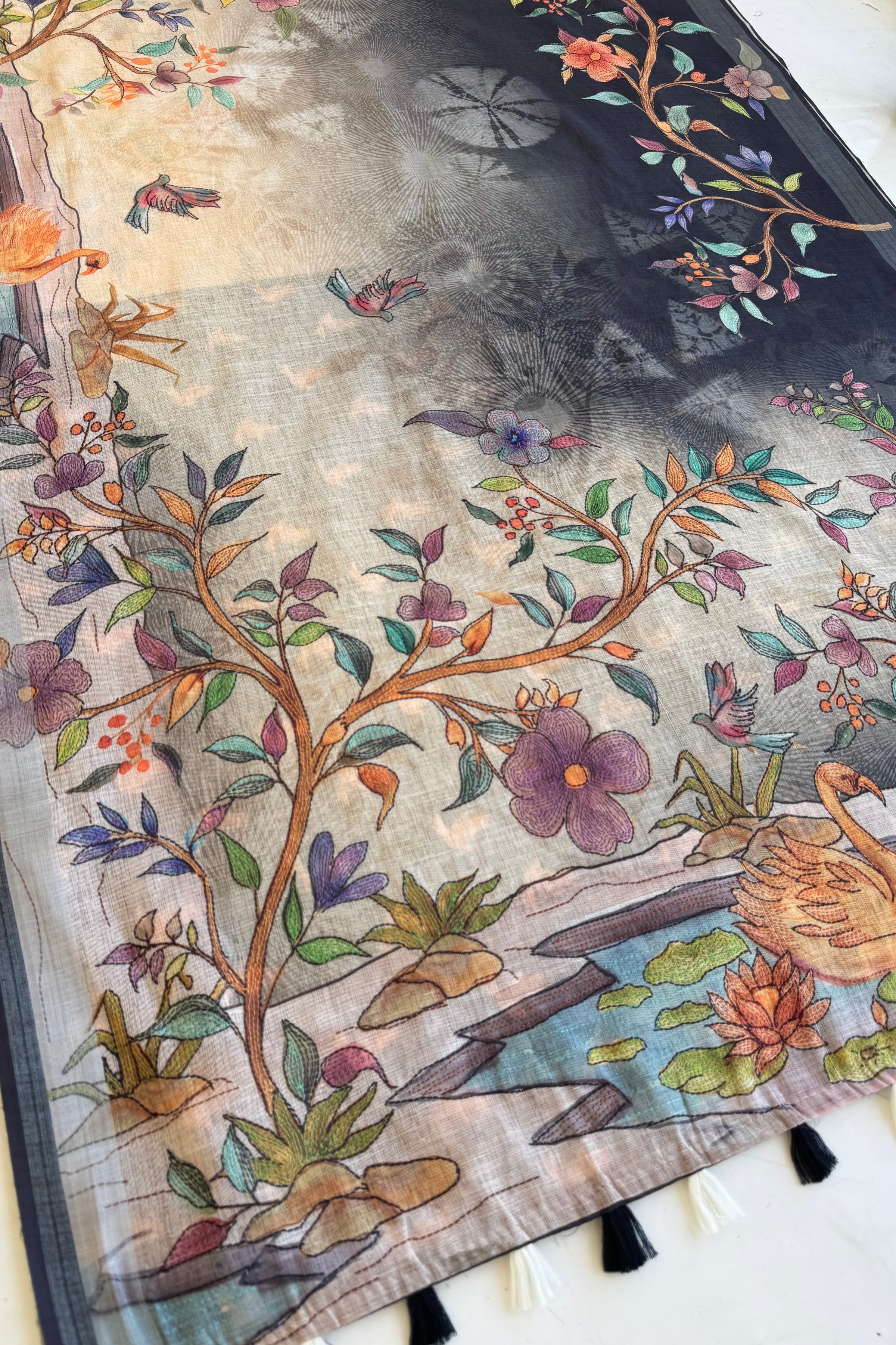 Inspired by quiet waters and blooming lotuses, this Soft Linen Saree with Zari Patta features delicate nature motifs woven into a gentle, story-like design. Subtle shading and detailed borders add depth without overpowering the look.