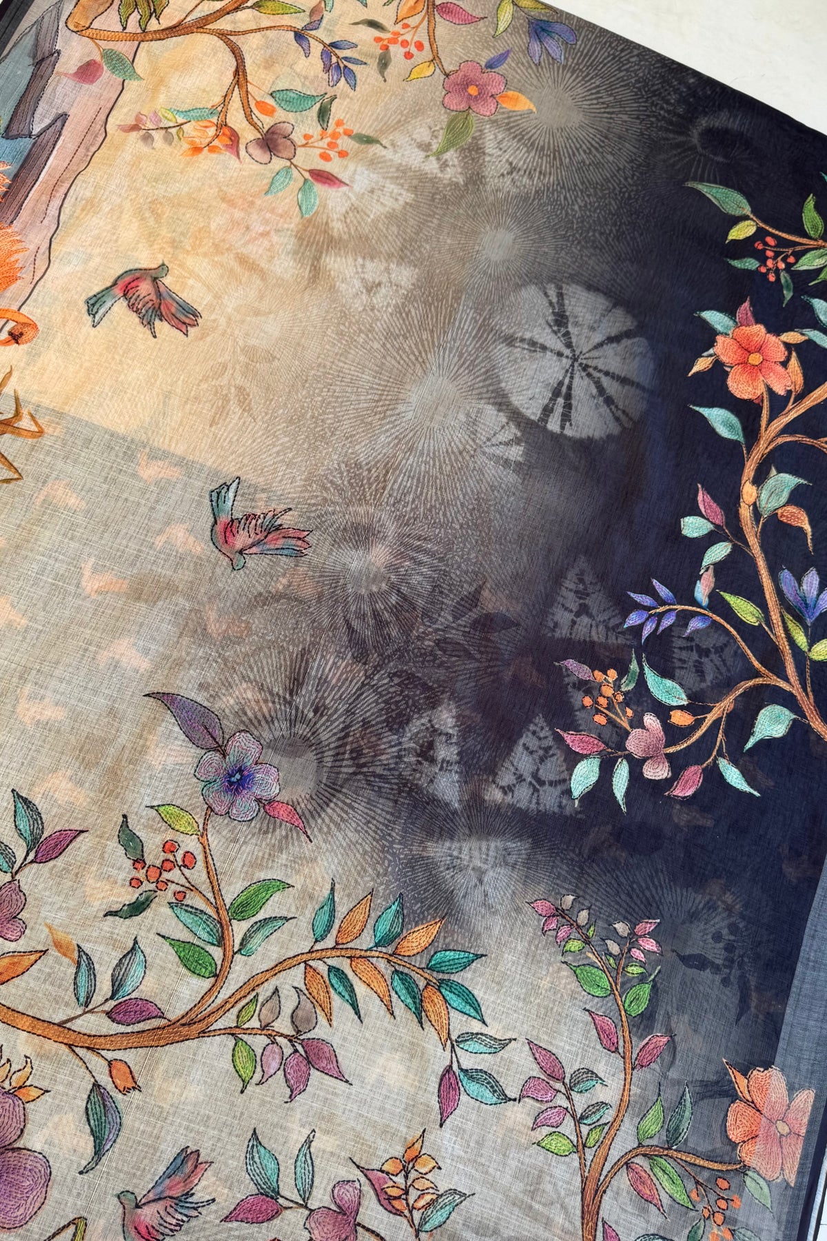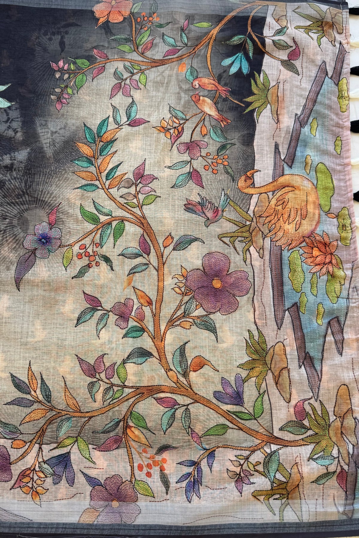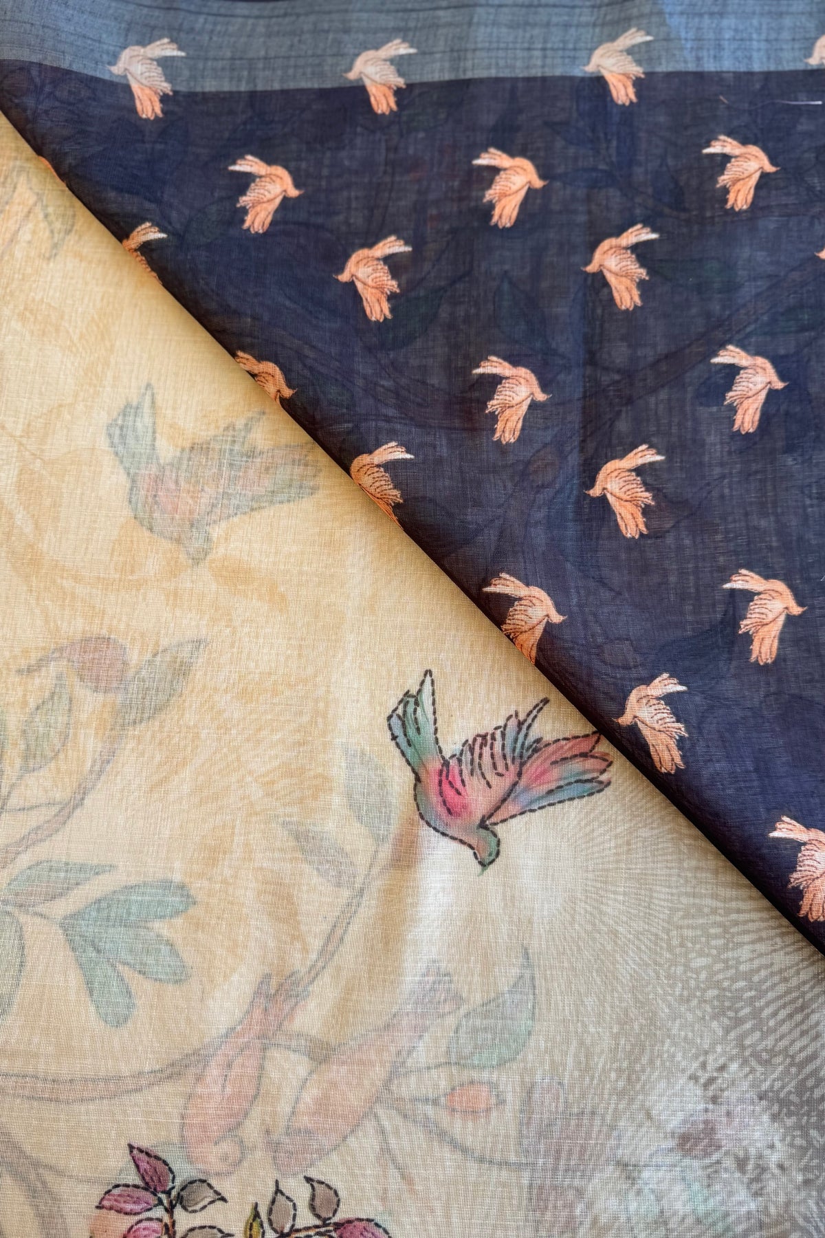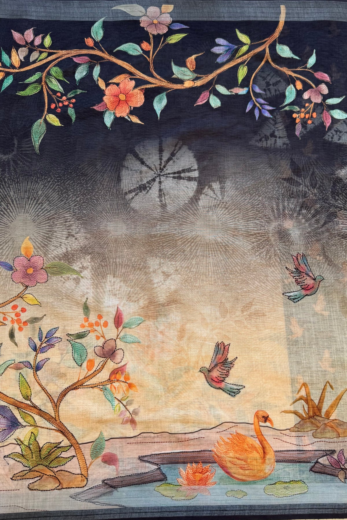 Inspired by quiet waters and blooming lotuses, this Soft Linen Saree with Zari Patta features delicate nature motifs woven into a gentle, story-like design. Subtle shading and detailed borders add depth without overpowering the look.