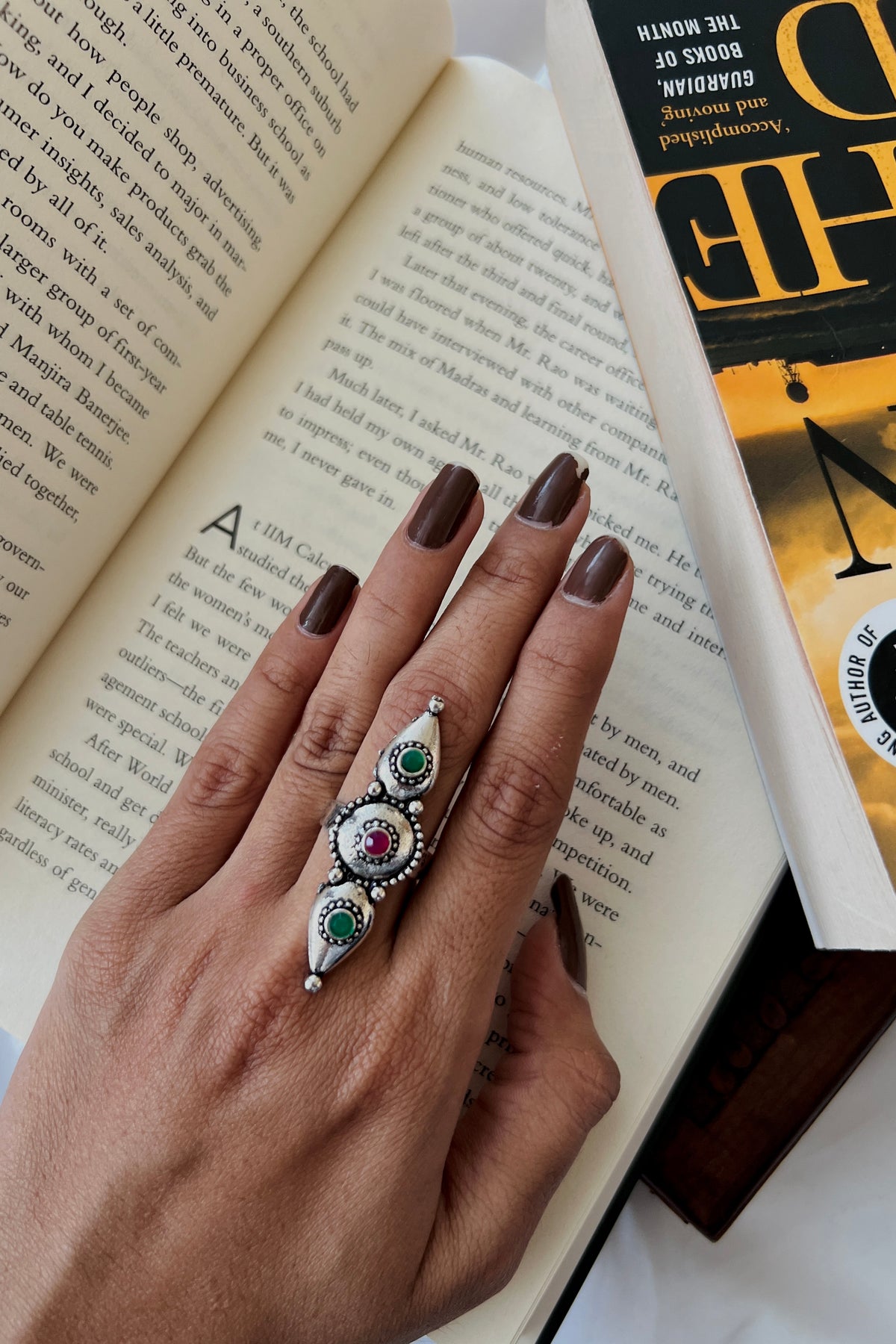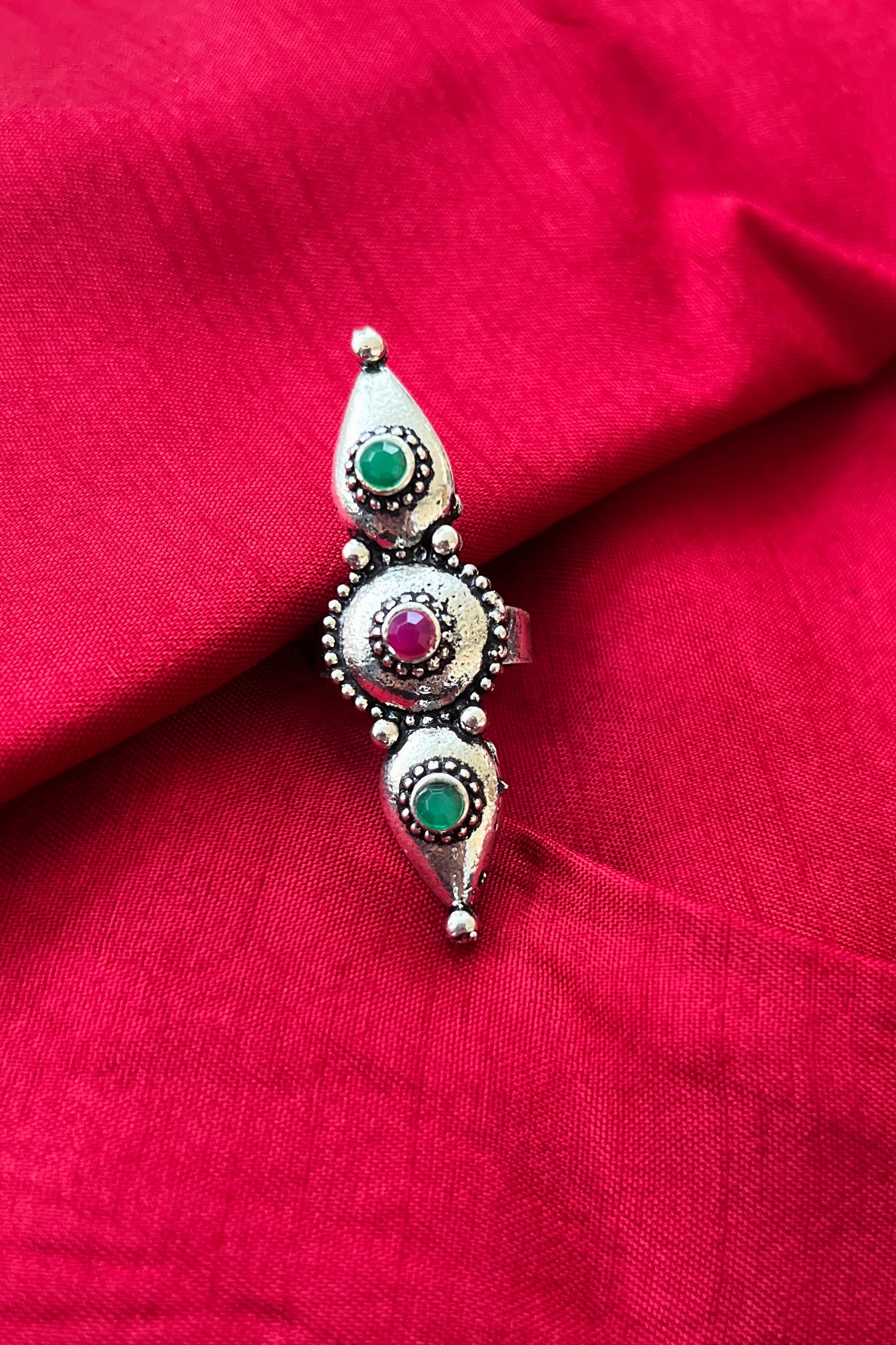 Design: Crafted in oxidised silver, the Naaz Vintage Ring features an elongated design adorned with vibrant green and pink stones. The intricate beaded detailing enhances its vintage charm, creating a statement piece that draws attention without overpowering your look. The design sits beautifully on the finger, making it perfect for adding an elegant, handcrafted touch to your ensemble.