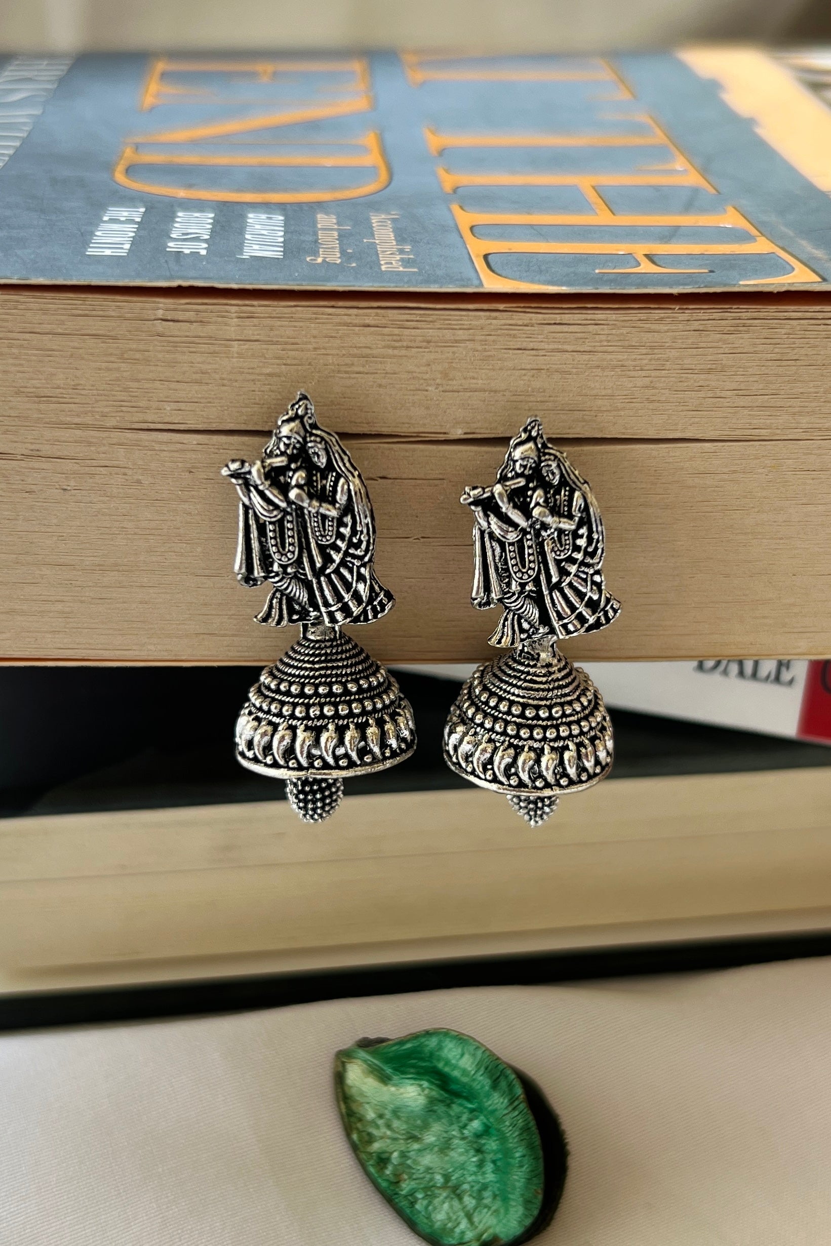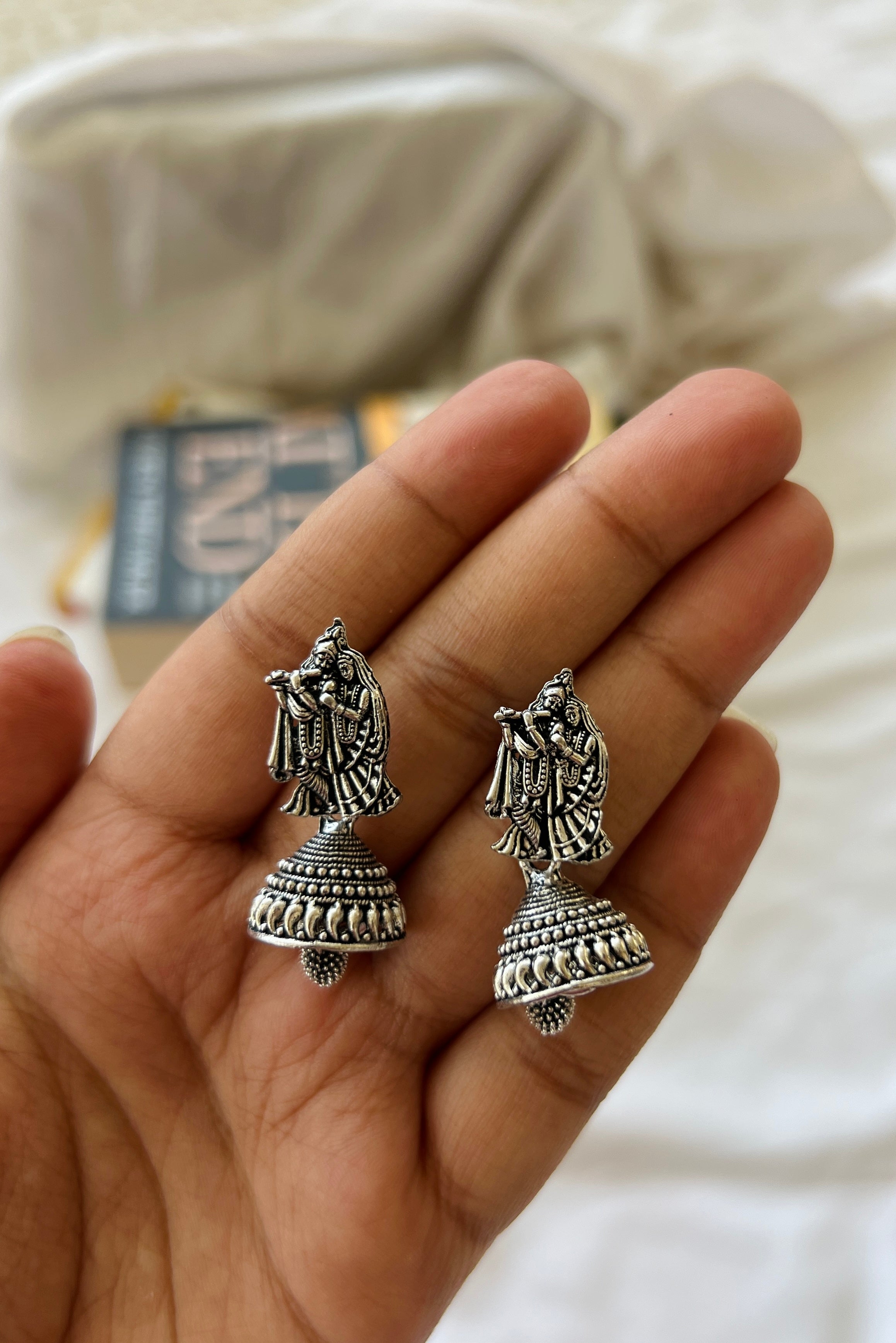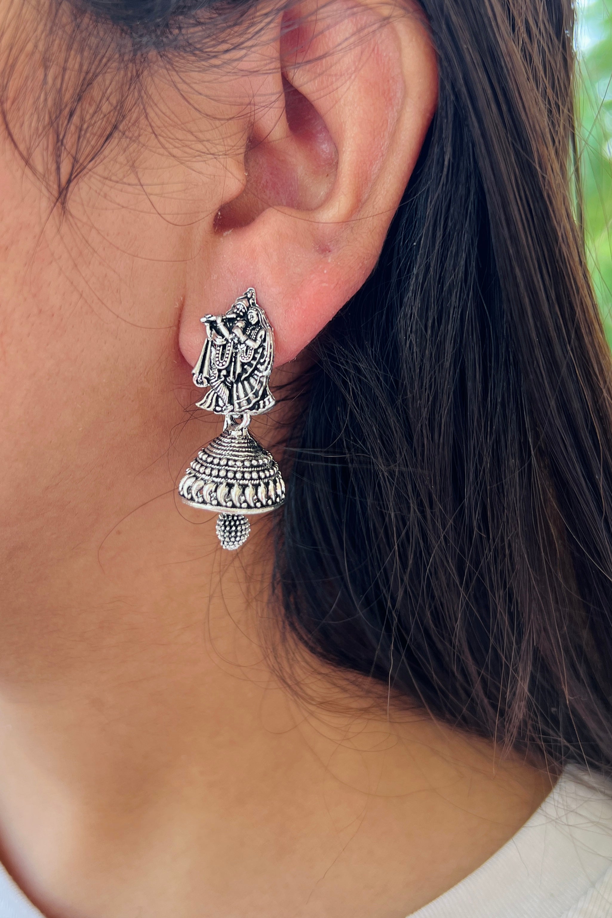 Design: Handcrafted in oxidised silver, the earrings depict the serene image of Krishna playing the flute, with Radha by his side — a symbol of devotion, harmony, and love that transcends lifetimes. The intricate dome-shaped jhumka below adds a rhythmic balance, detailed with fine beaded accents that sway softly with every movement. Each curve and contour is a tribute to skilled craftsmanship and the timeless tales of Vrindavan.