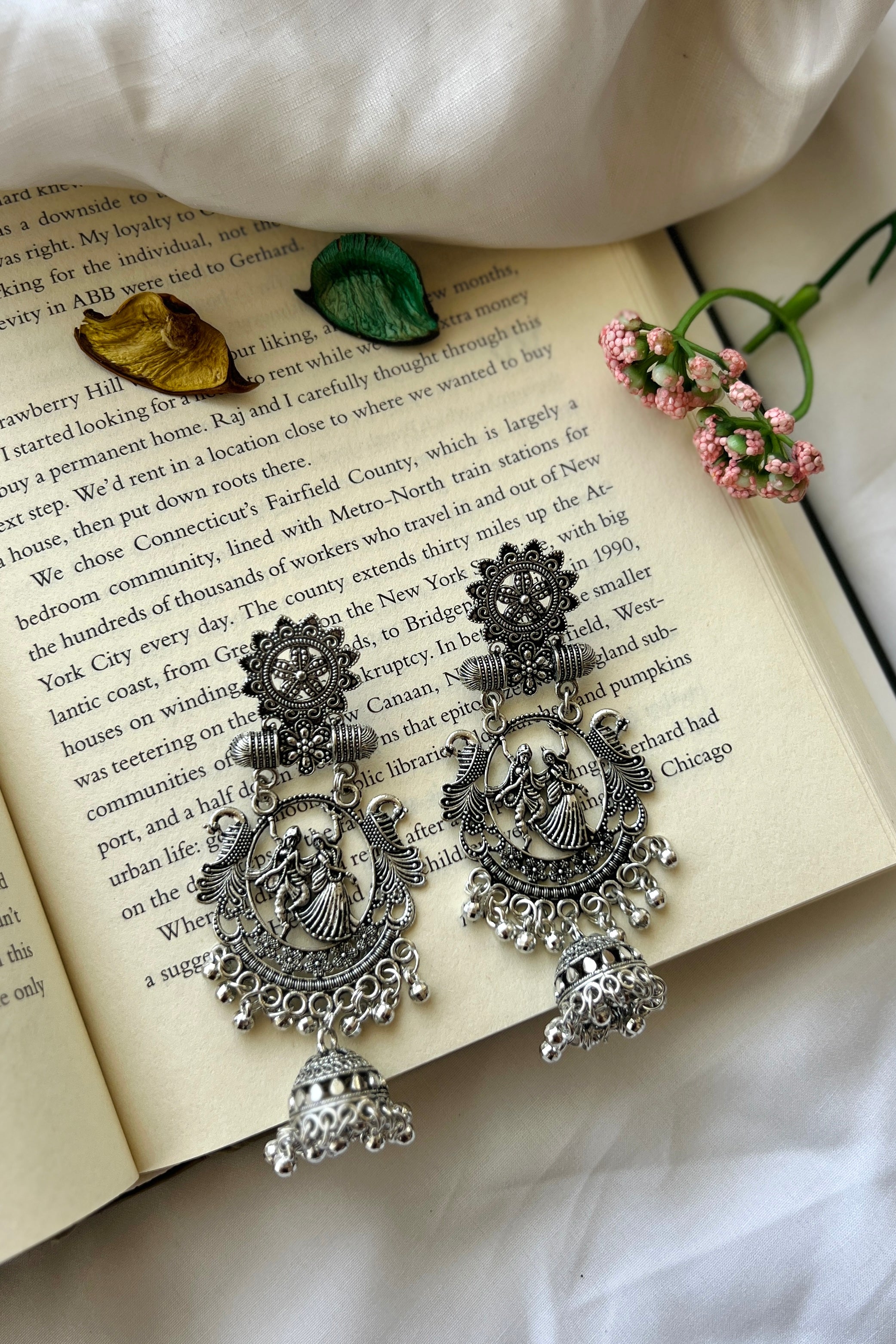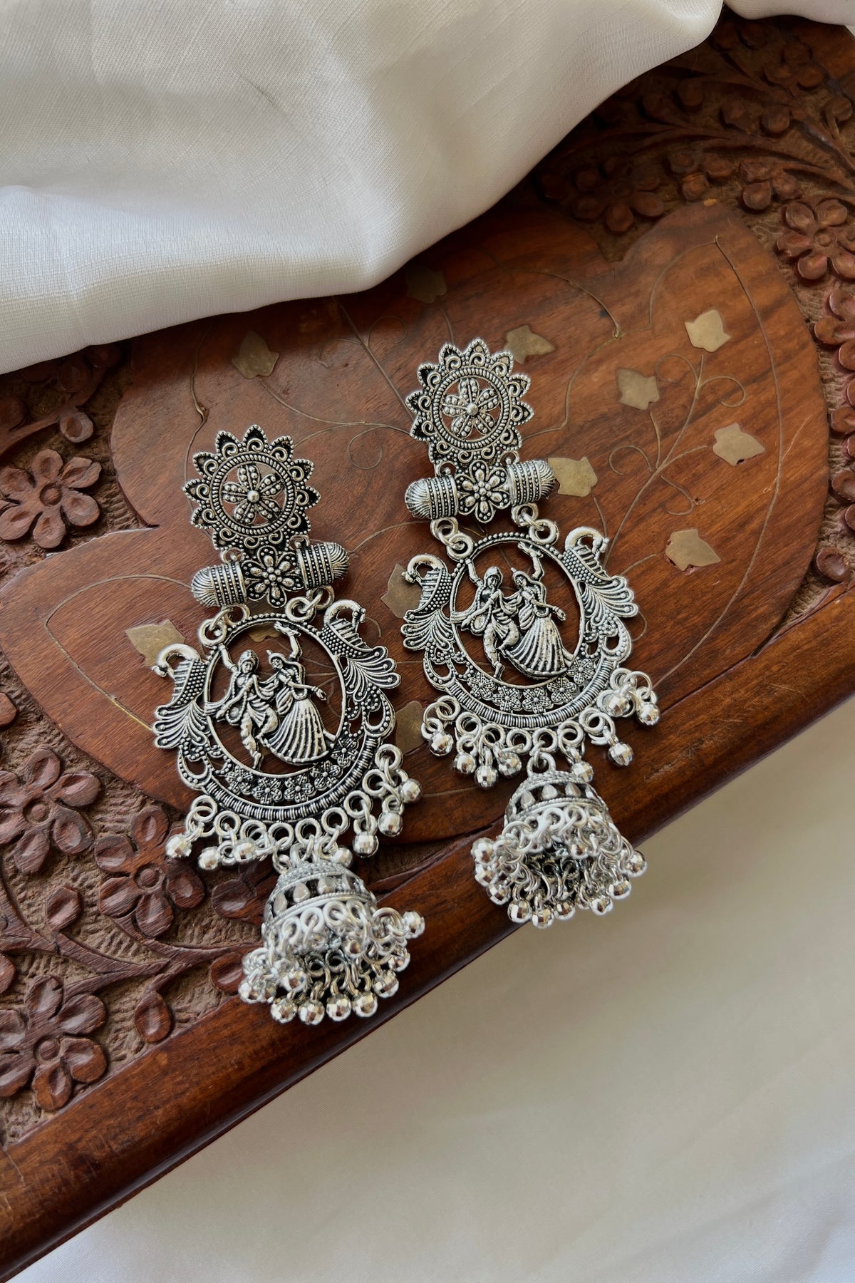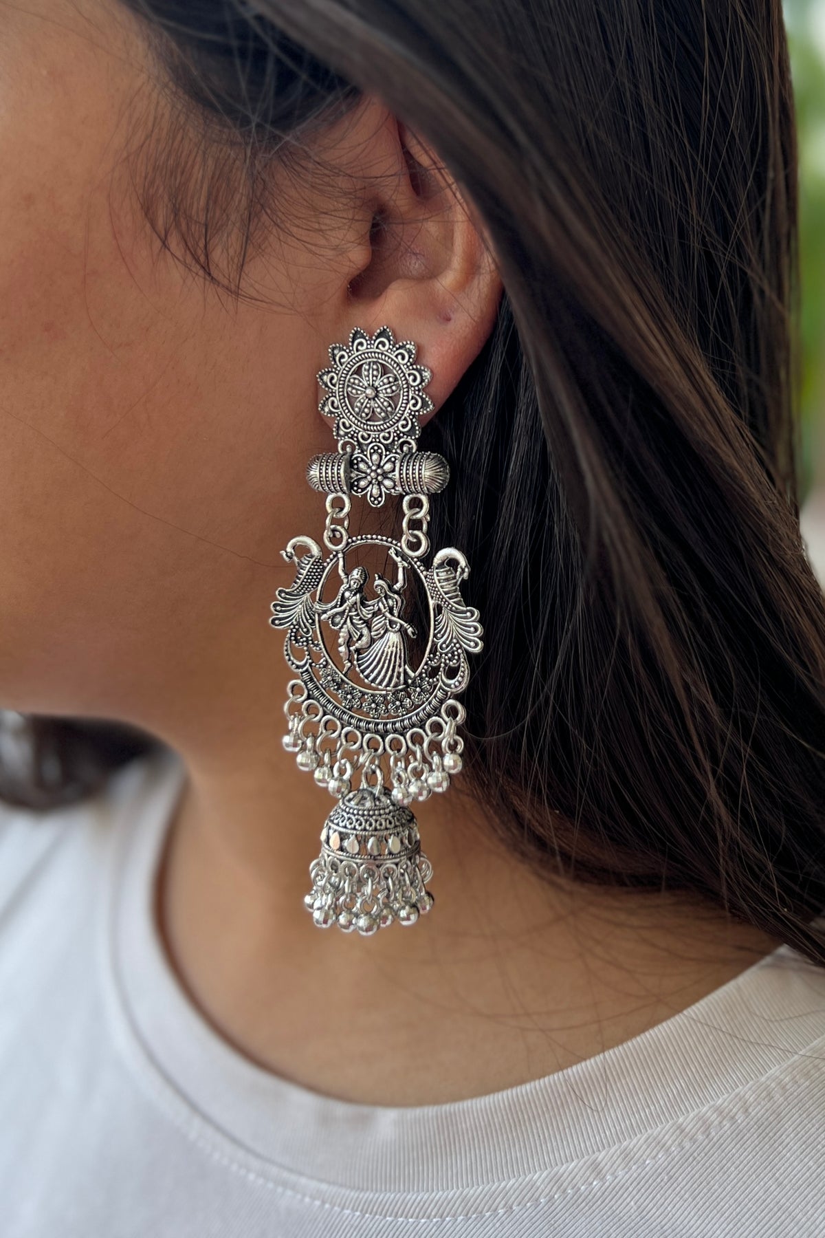 These earrings feature Radha and Krishna dancing under a detailed arch, surrounded by floral motifs and finished with classic jhumka drops. The oxidised silver tone gives them a timeless antique look, while the tiny ghungroo beads add a soft musical charm. Lightweight and graceful, they are designed to make every look special.