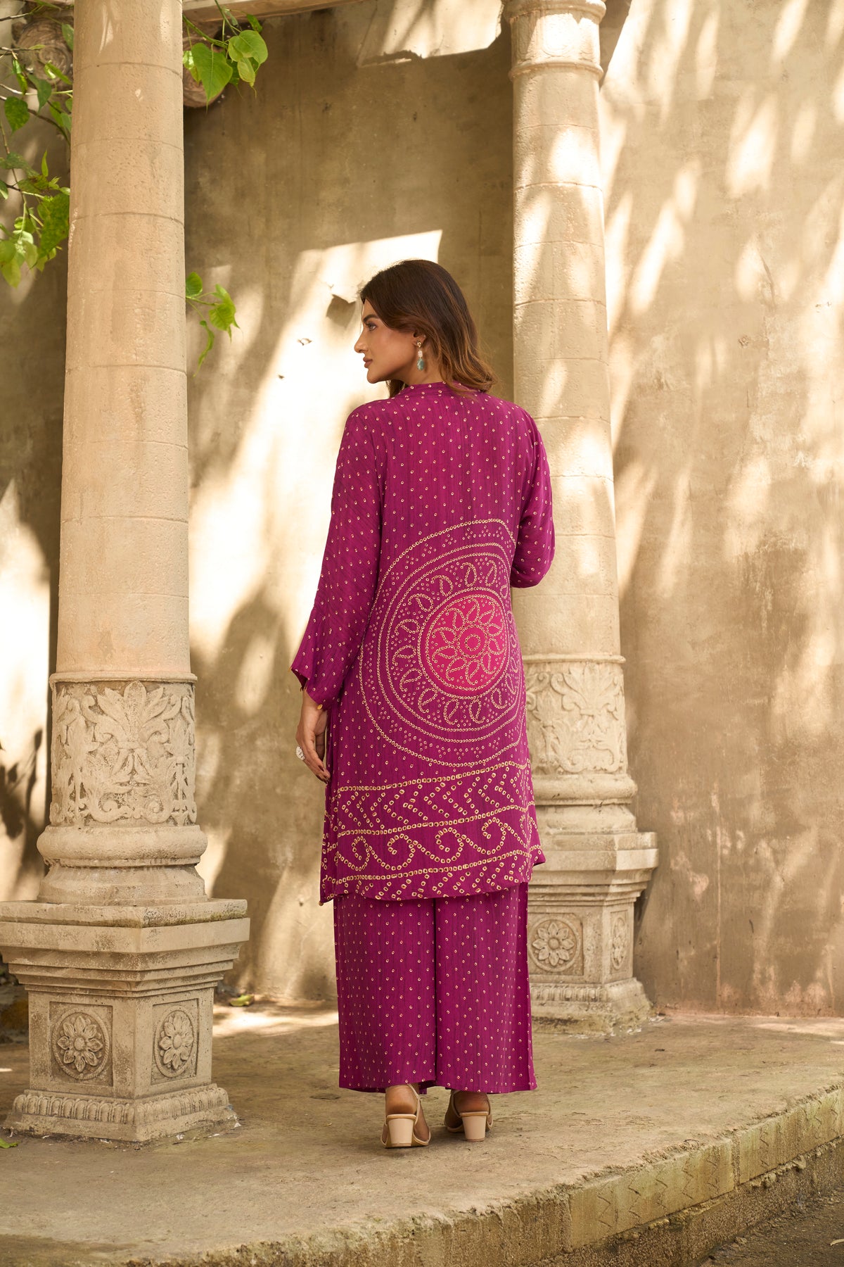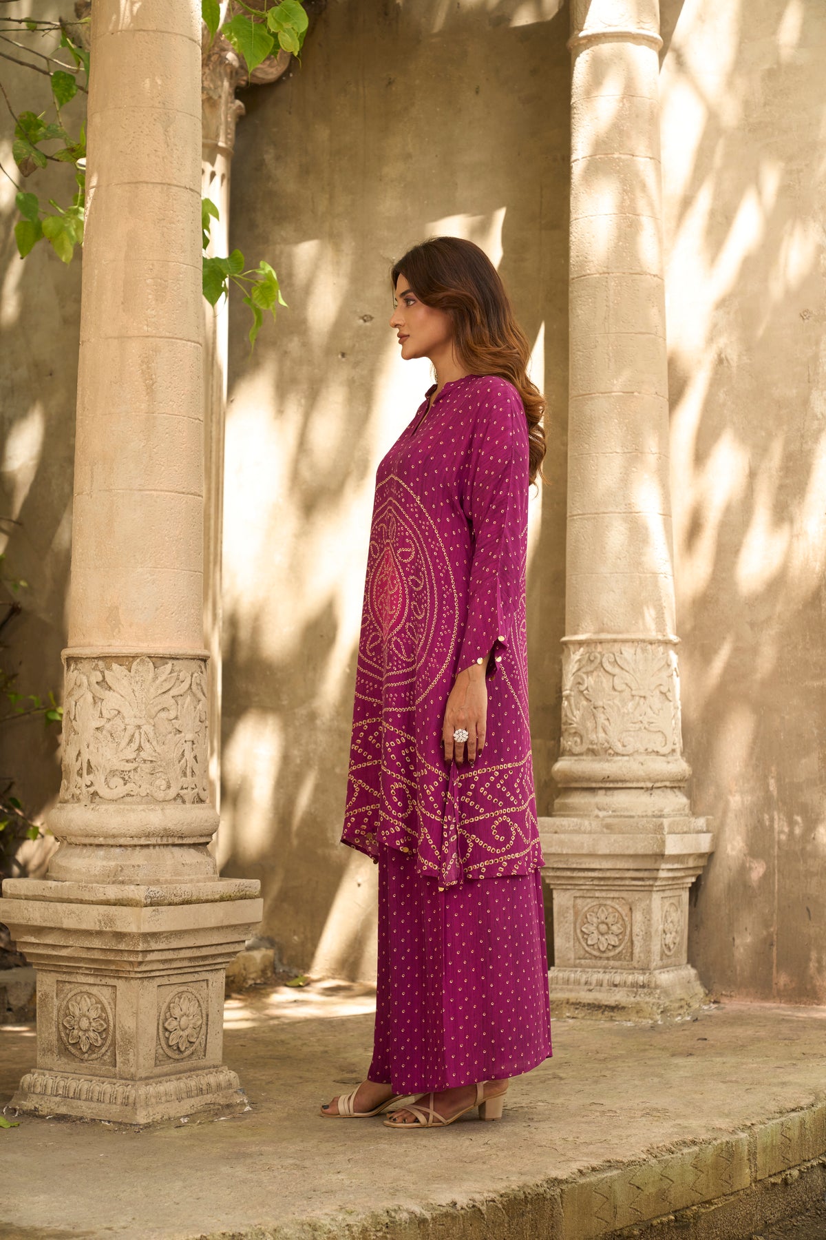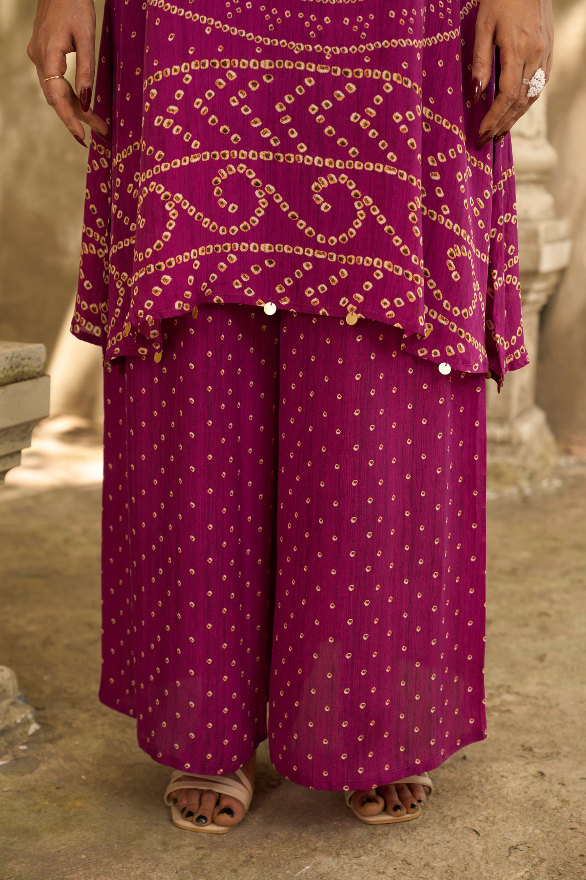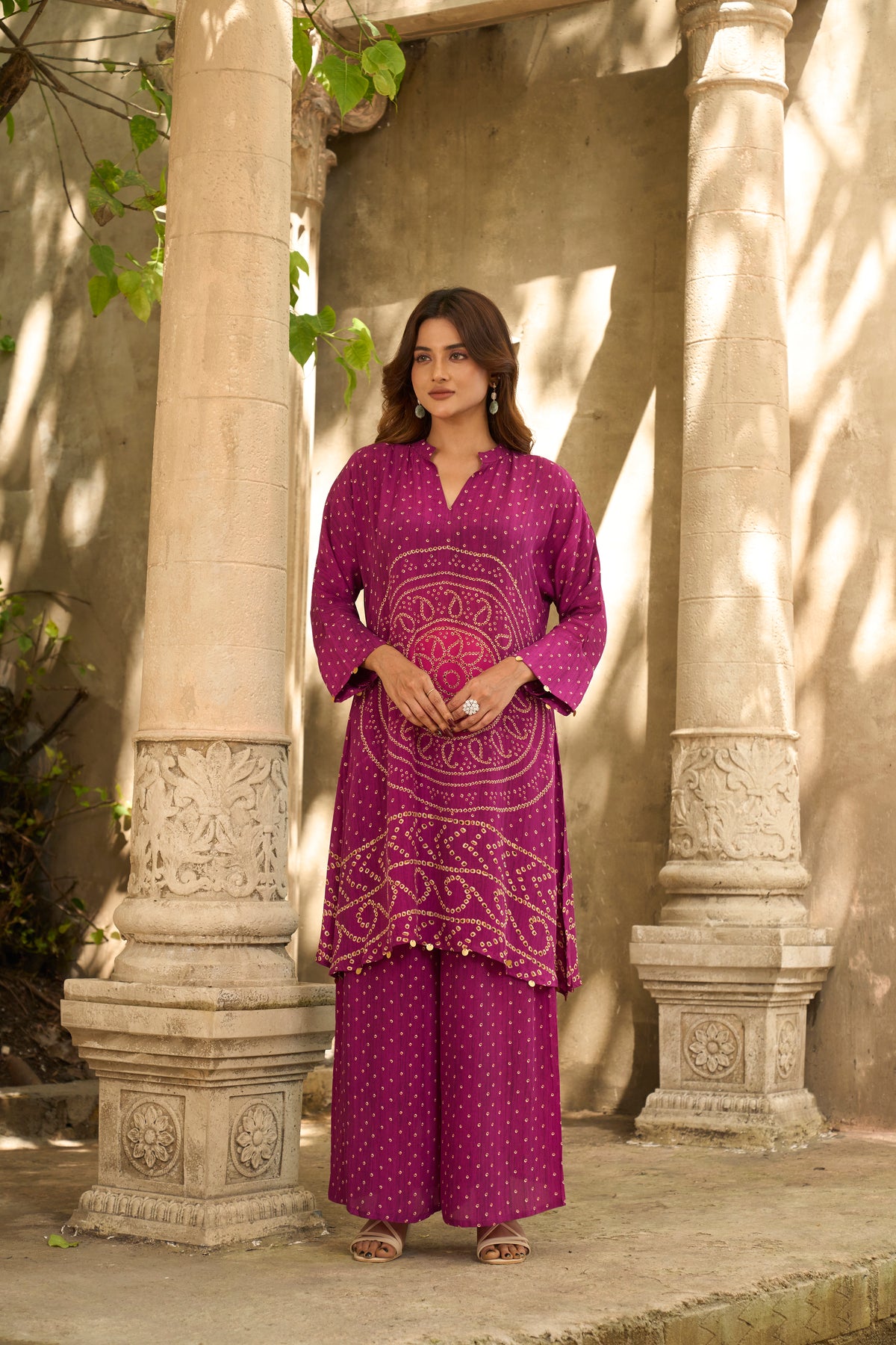 A vibrant purple Natural Crepe co-ord set with delicate golden bandhani-inspired prints. The top comes with a graceful V-neckline, full sleeves, and intricate detailing on the bodice and hem. Paired with palazzo-style straight pants, it offers an elegant and comfortable ethnic look.
