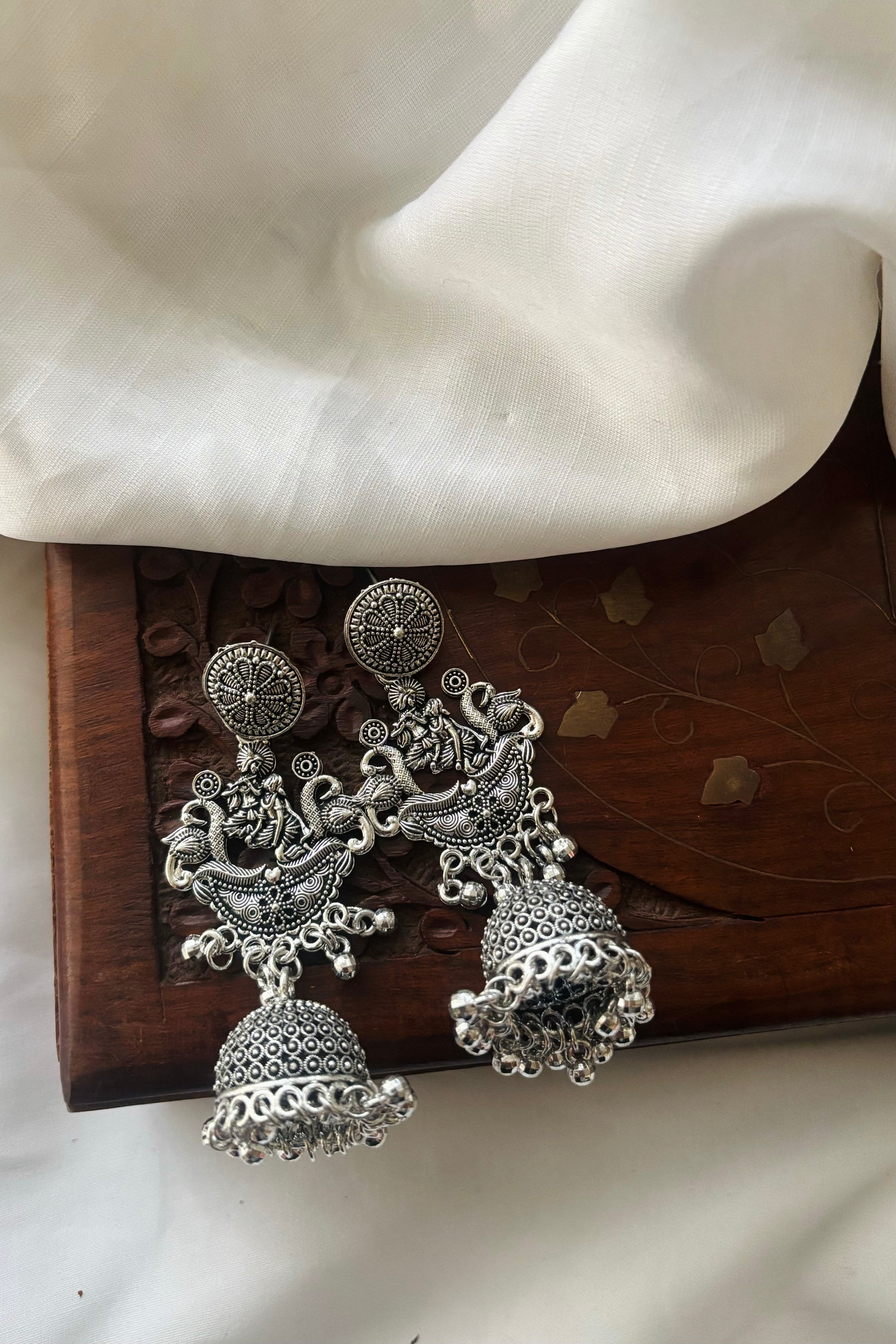 Made in oxidized silver tones, these jhumkas feature intricate carvings with goddess motifs, delicate ghungroo drops, and traditional dome patterns. Lightweight yet grand, they blend spiritual elegance with artistic design — perfect for lovers of traditional jewellery.