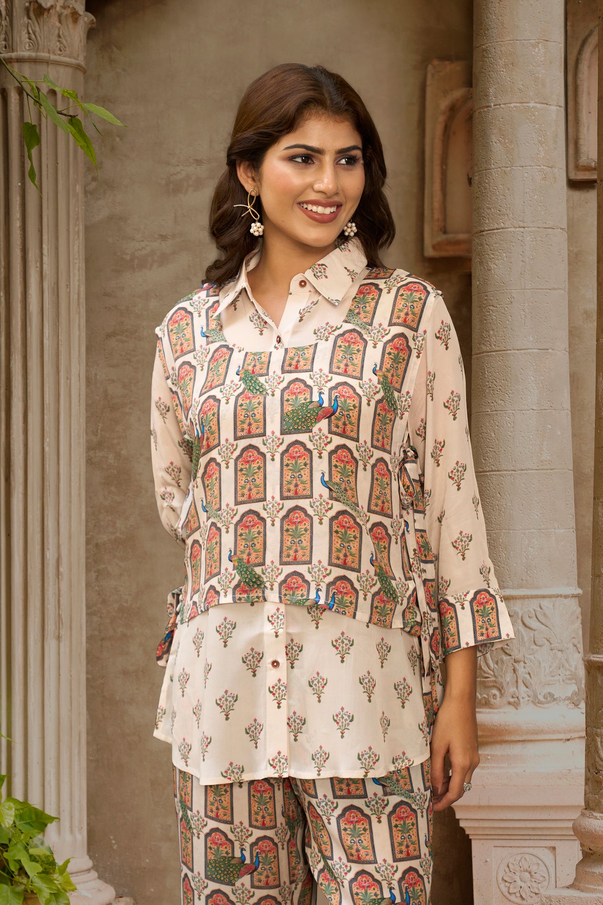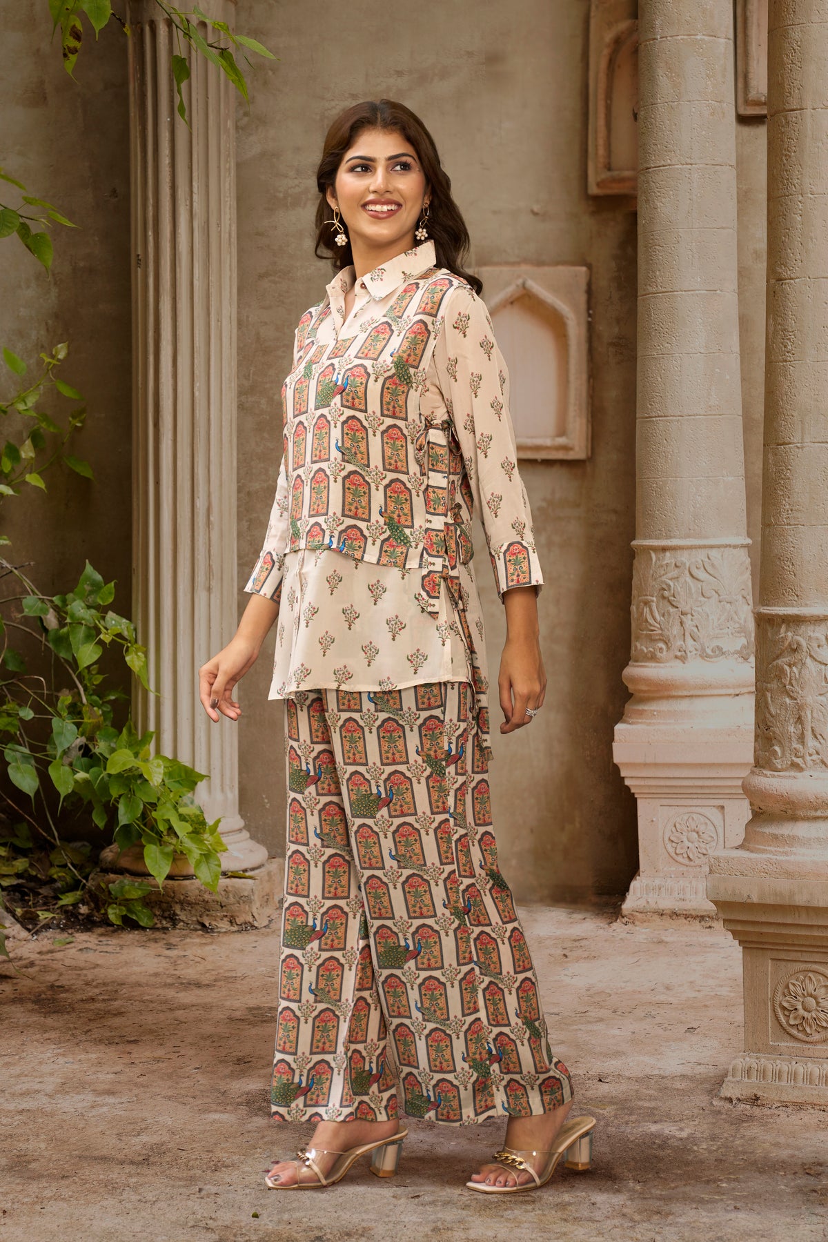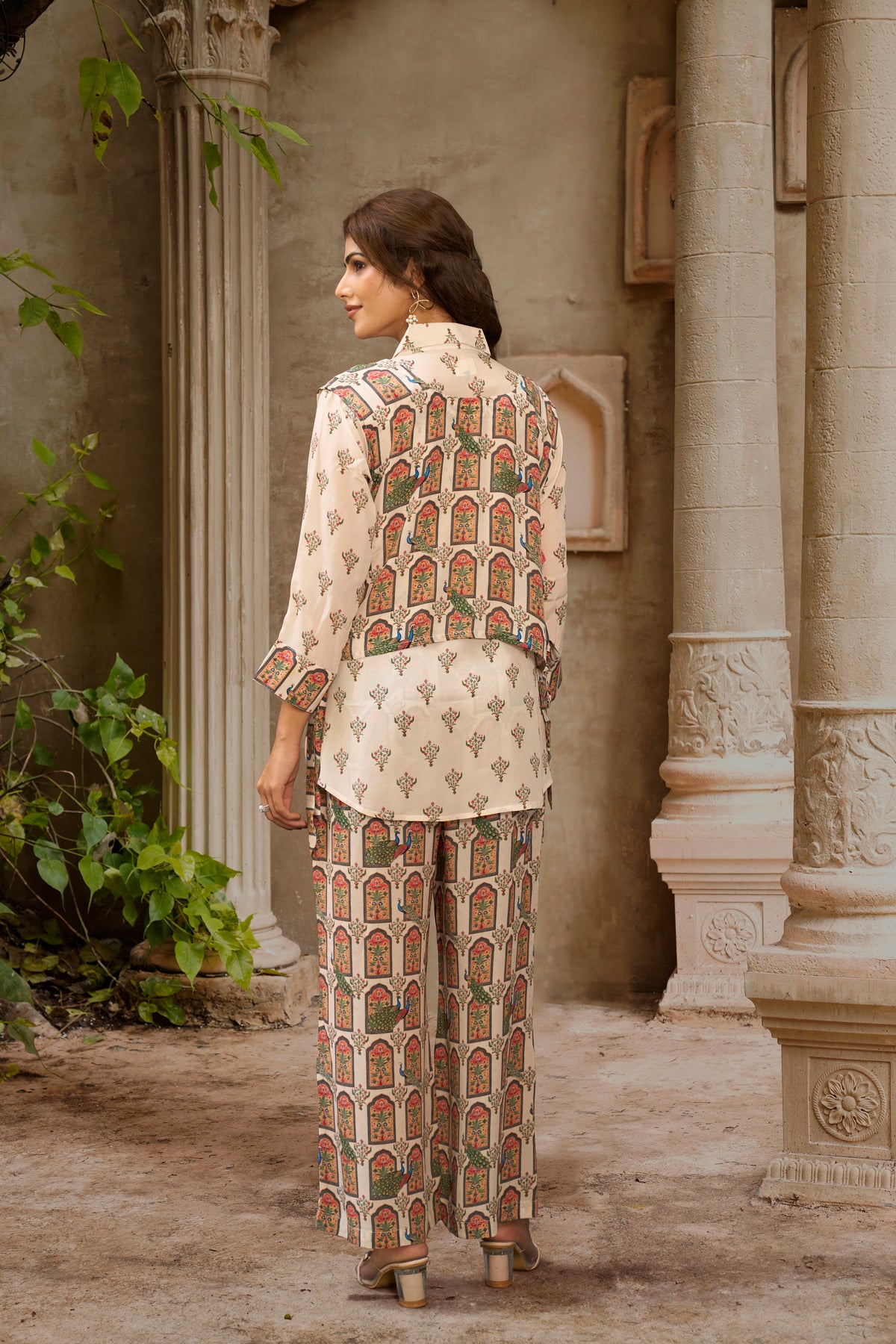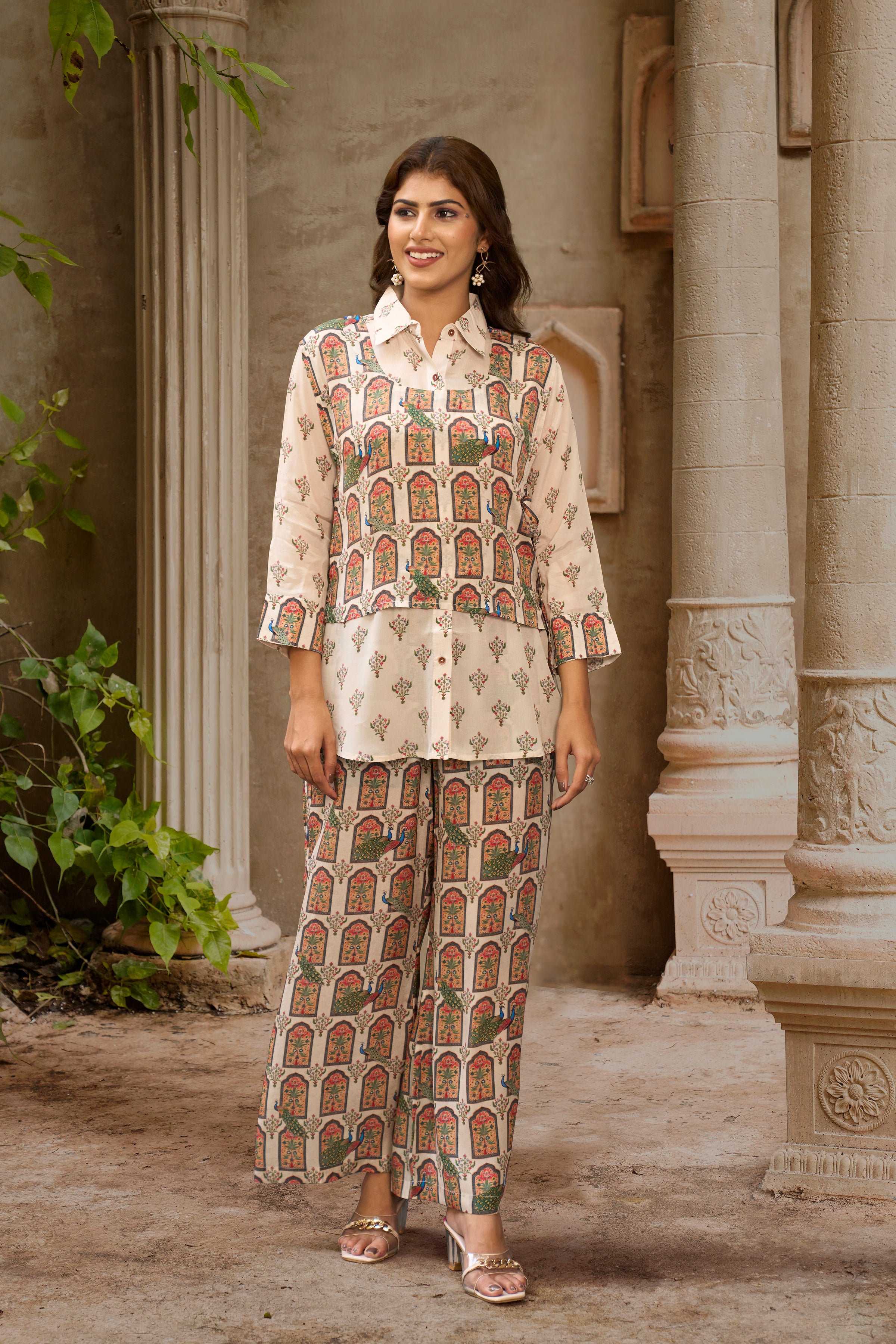 This ivory co-ord set features a button-down shirt with artistic jharokha-inspired prints. The mix of miniature floral motifs and vibrant window patterns lends a traditional yet playful charm. Paired with wide-leg trousers, it’s a stylishly comfortable choice for both casual outings and relaxed gatherings.