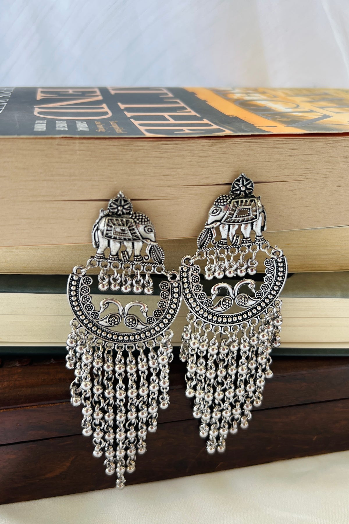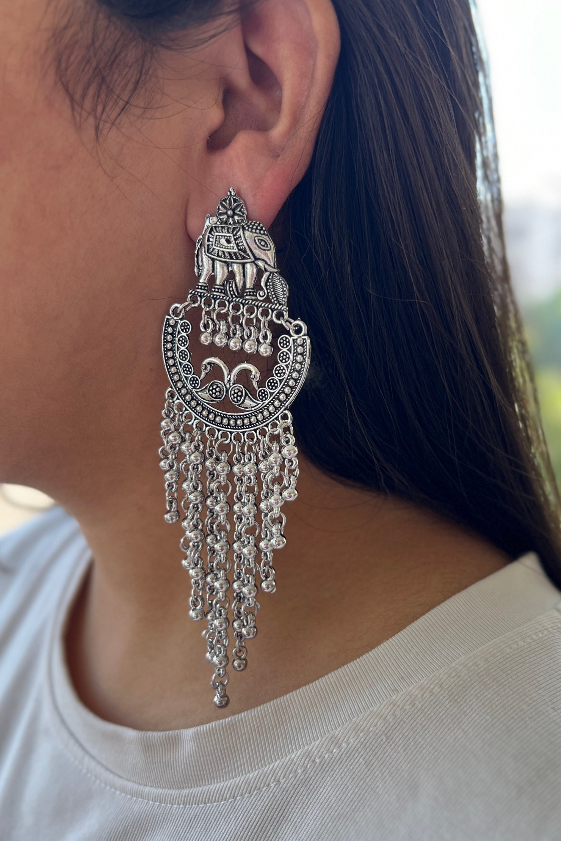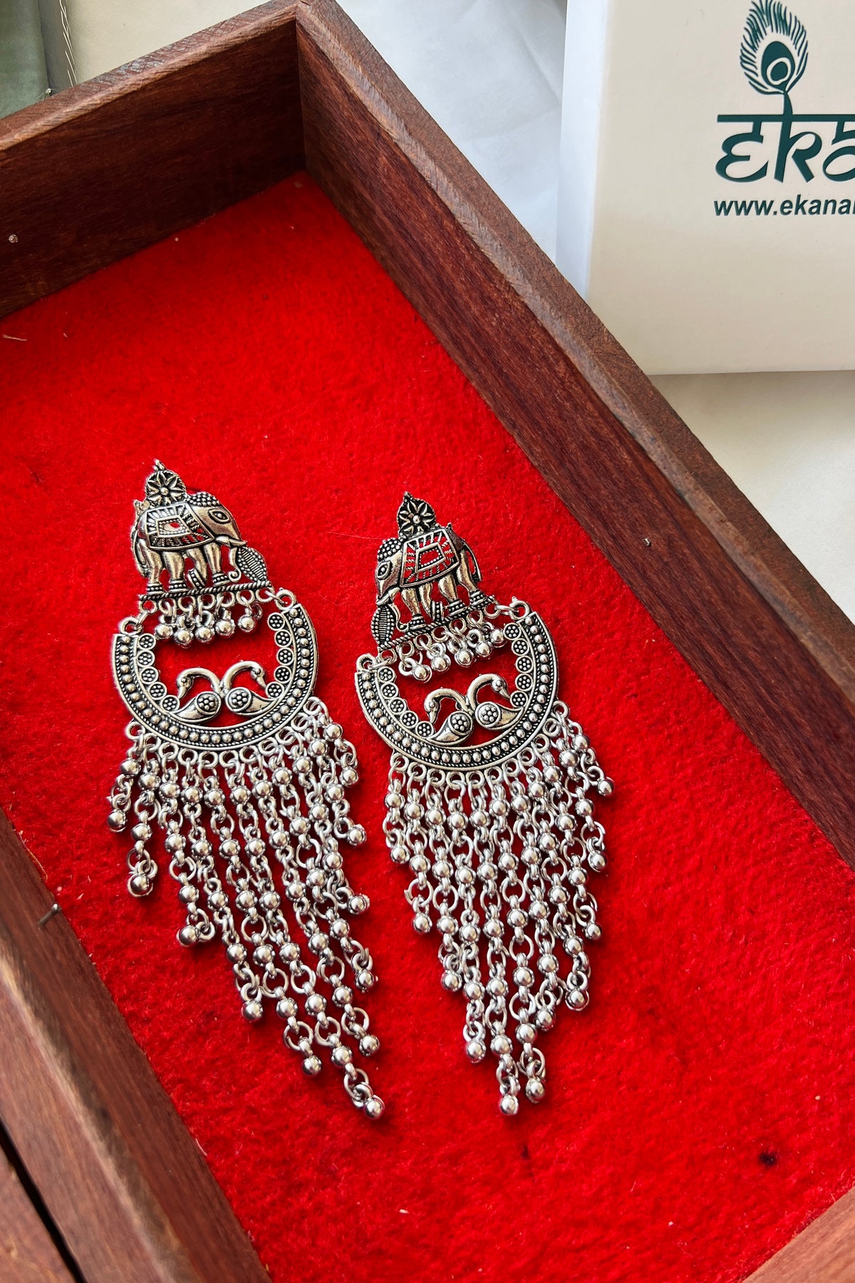 Made in oxidized silver tones, the earrings feature detailed elephant motifs, intricate carvings, and cascading chain drops that add a touch of drama and elegance. Lightweight yet eye-catching, they blend heritage with a modern edge.