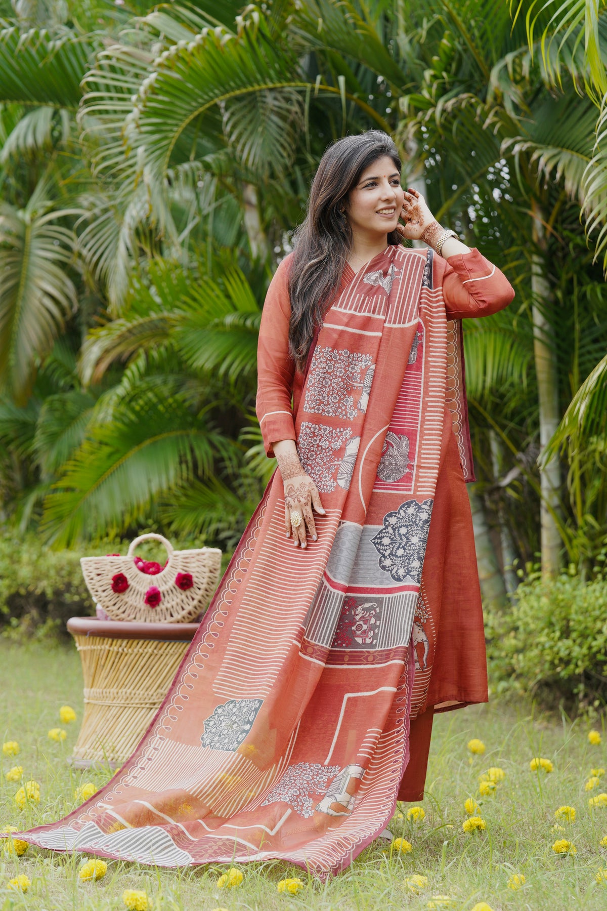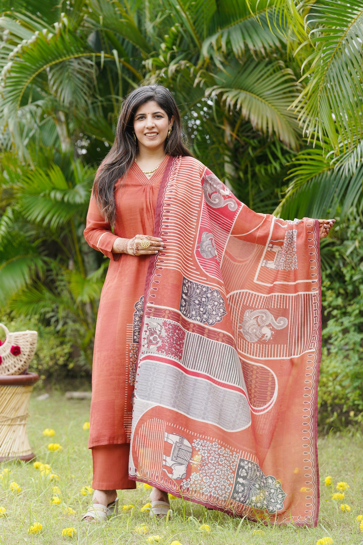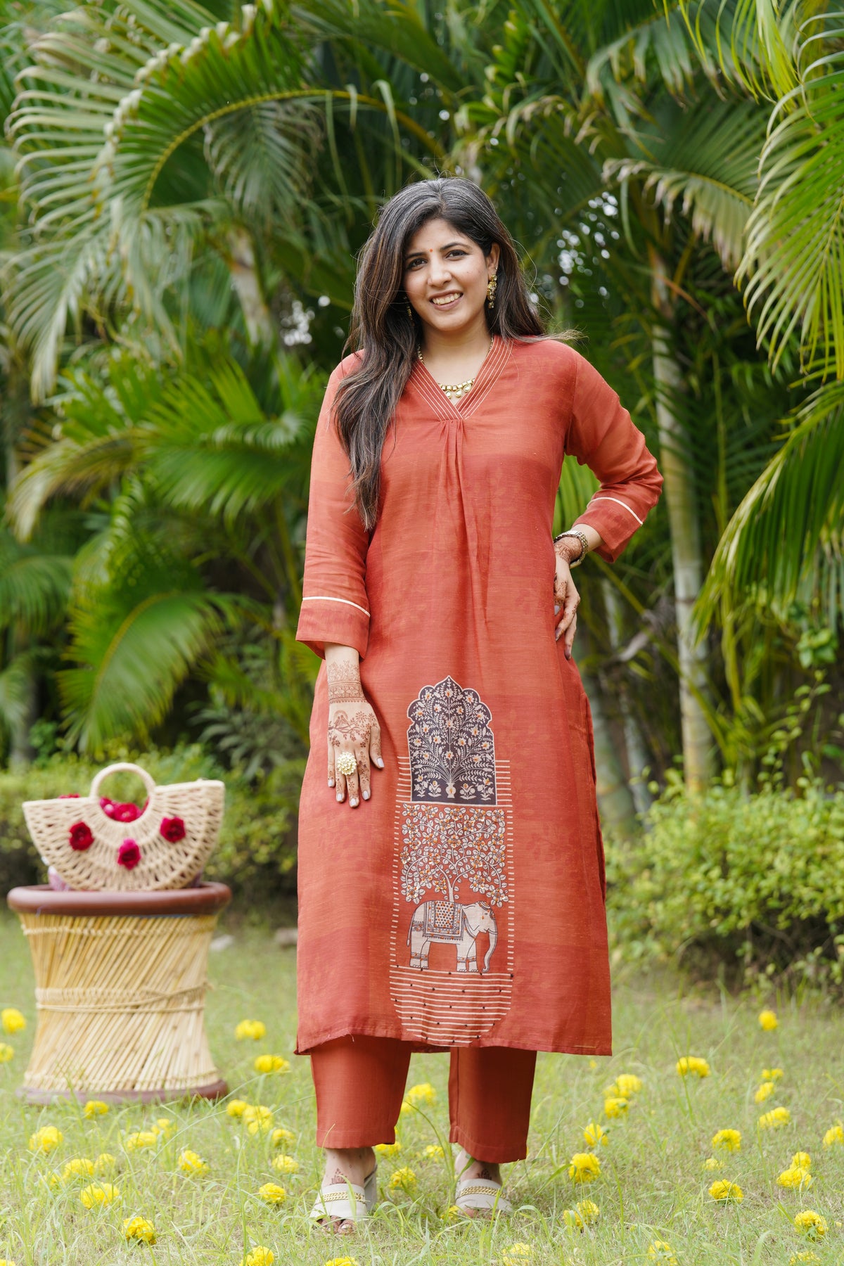 This rust-orange suit set is adorned with intricate handwork and captivating traditional prints. The kurta features a majestic tree and elephant motif, symbolizing heritage and strength, while the matching dupatta showcases a patchwork of detailed folk-inspired designs. Crafted in soft, breathable fabric, it blends comfort with timeless charm. A perfect pick for cultural gatherings and festive occasions.