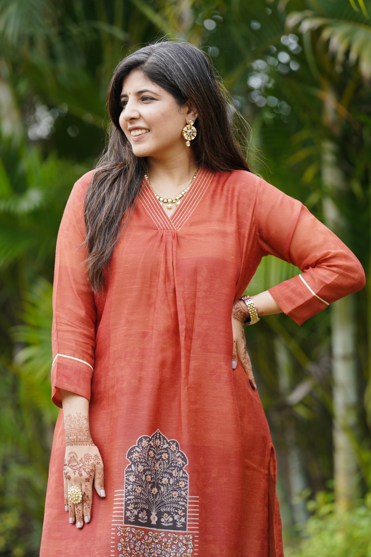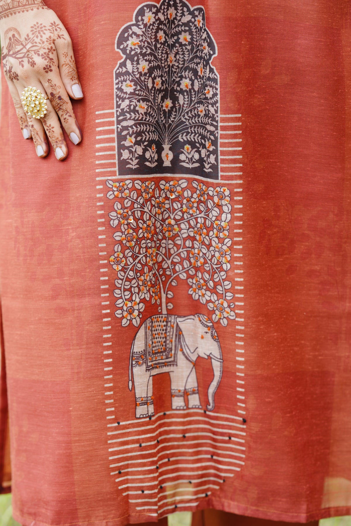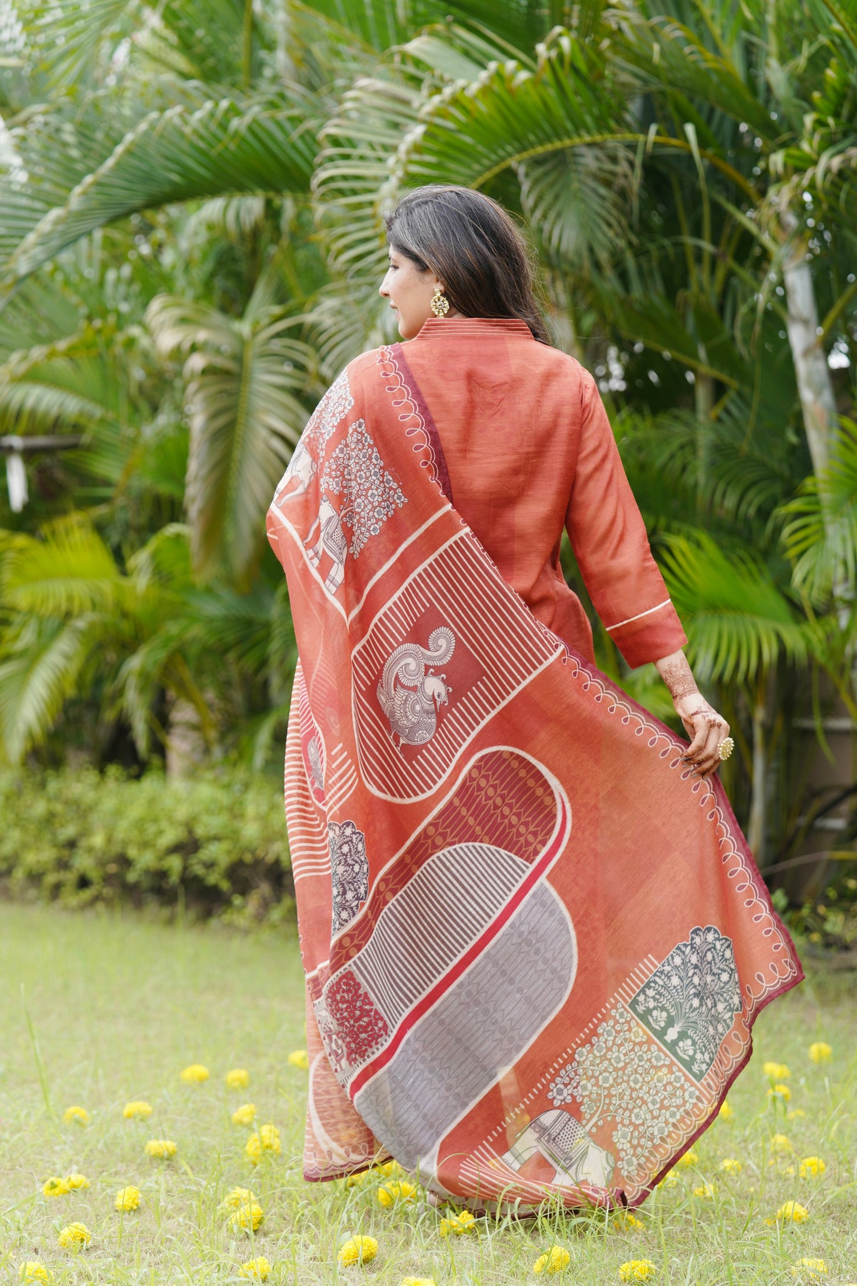 This rust-orange suit set is adorned with intricate handwork and captivating traditional prints. The kurta features a majestic tree and elephant motif, symbolizing heritage and strength, while the matching dupatta showcases a patchwork of detailed folk-inspired designs. Crafted in soft, breathable fabric, it blends comfort with timeless charm. A perfect pick for cultural gatherings and festive occasions.