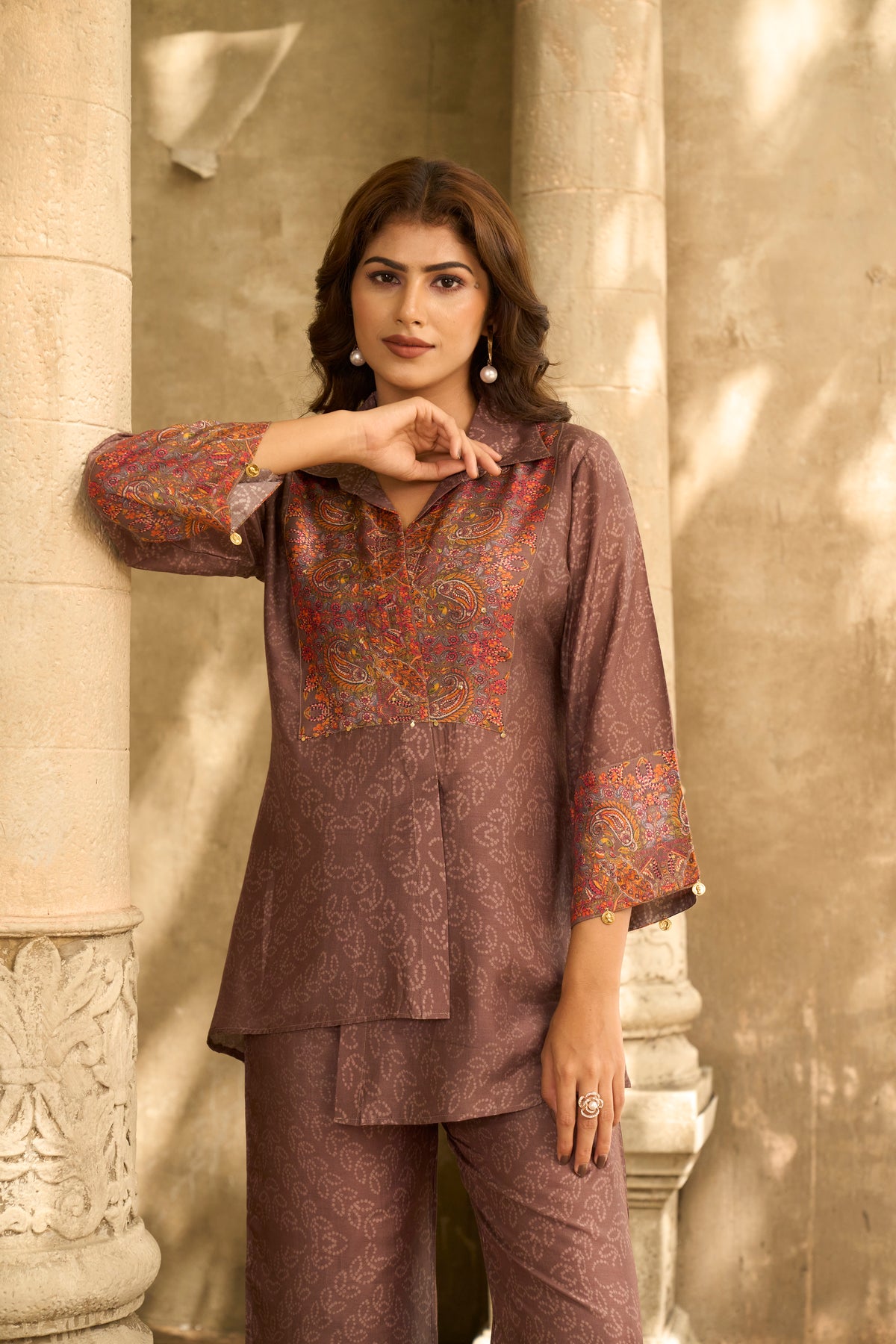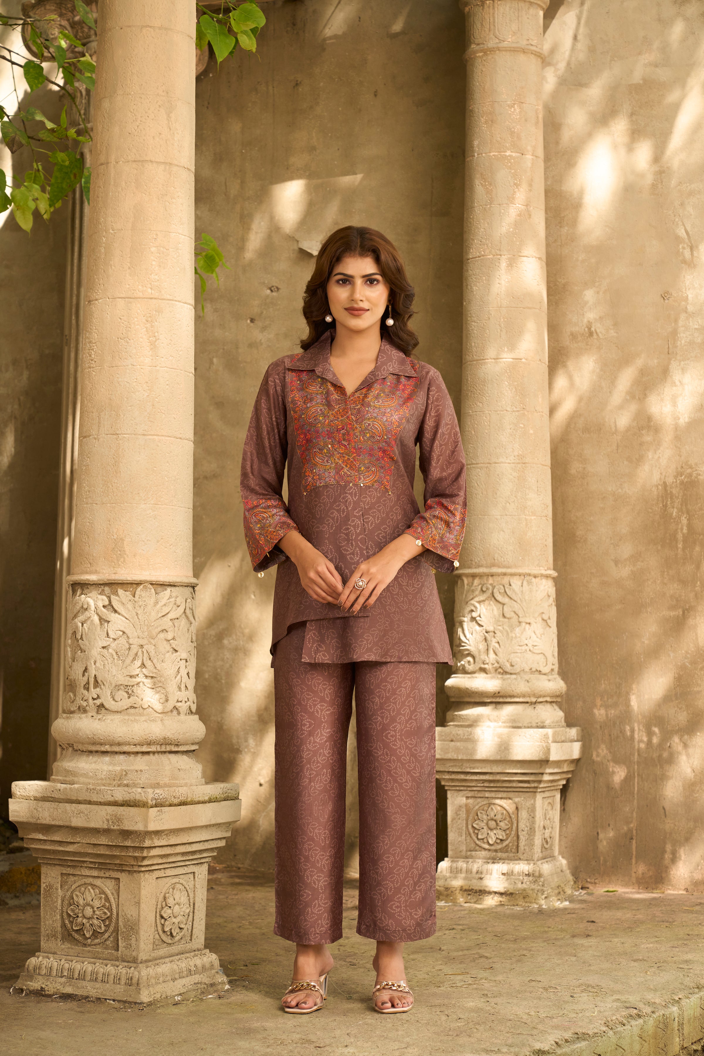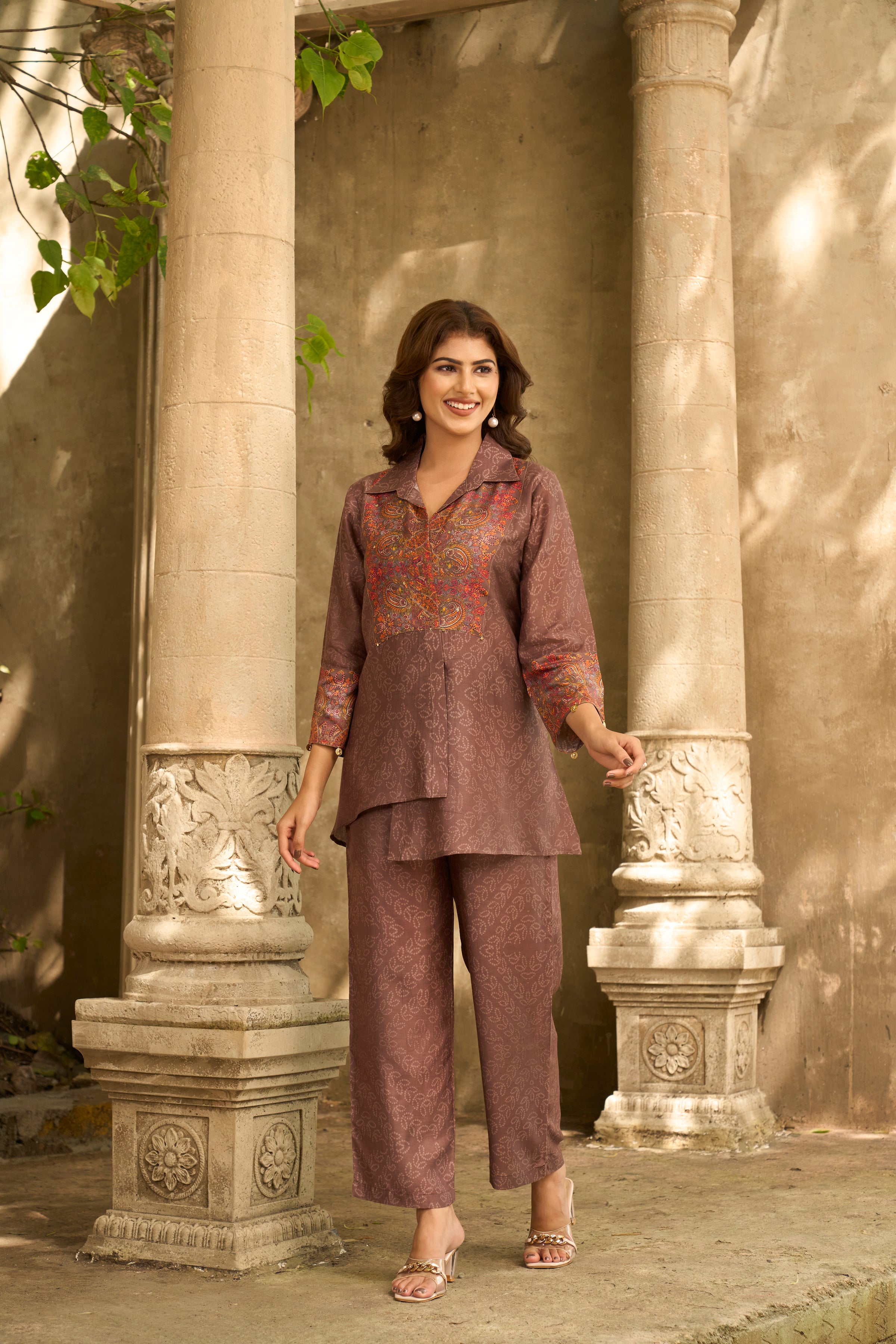 A chic pure fine silk co-ord set in earthy brown featuring exquisite multicolour embroidery on the bodice and sleeves. The top has a smart collared neckline and paired sleeves, creating a refined look for any occasion. It is matched with straight-fit pants adorned with subtle printed motifs, offering both comfort and sophistication.