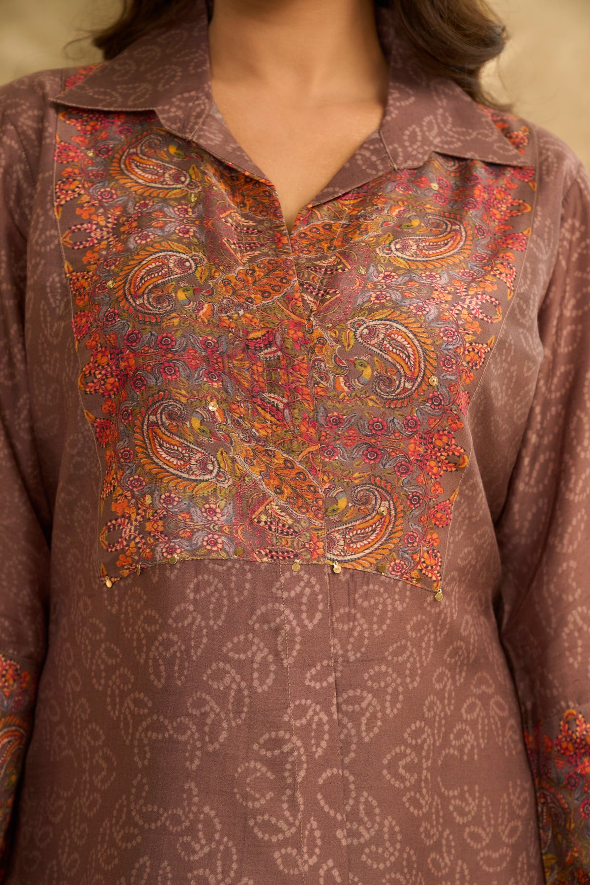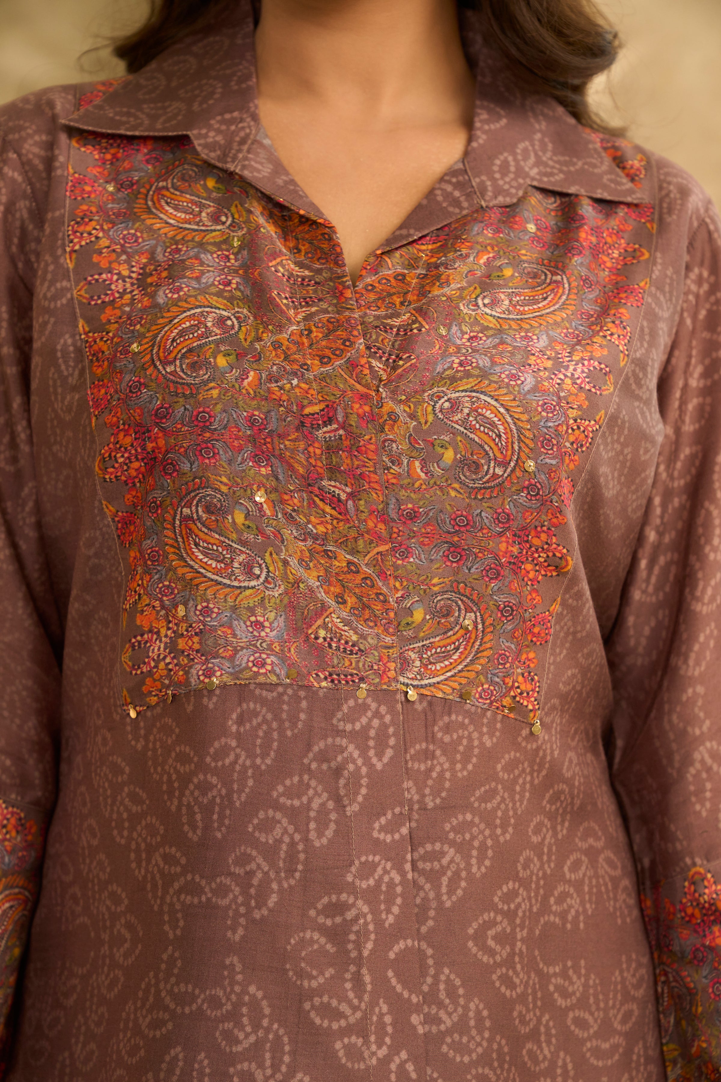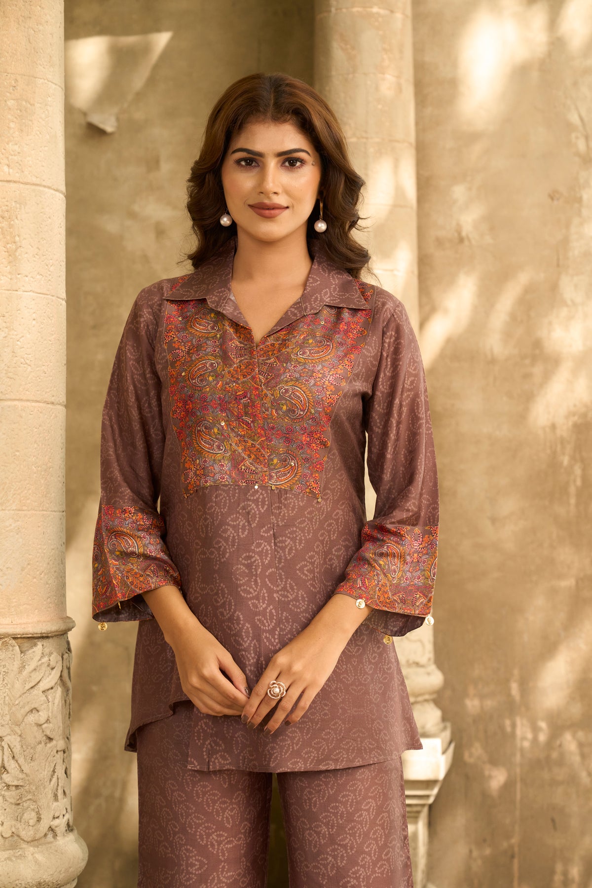 A chic pure fine silk co-ord set in earthy brown featuring exquisite multicolour embroidery on the bodice and sleeves. The top has a smart collared neckline and paired sleeves, creating a refined look for any occasion. It is matched with straight-fit pants adorned with subtle printed motifs, offering both comfort and sophistication.