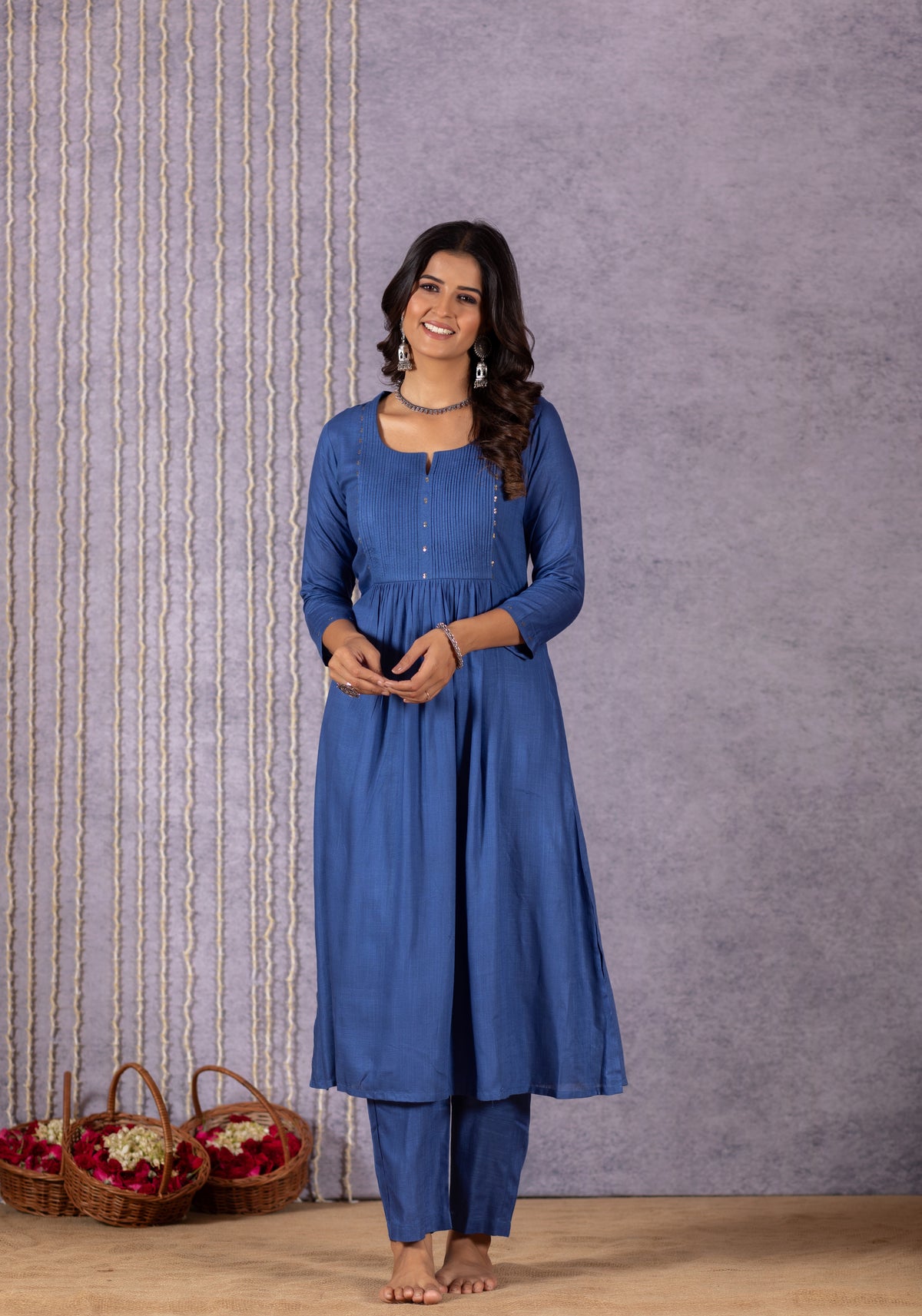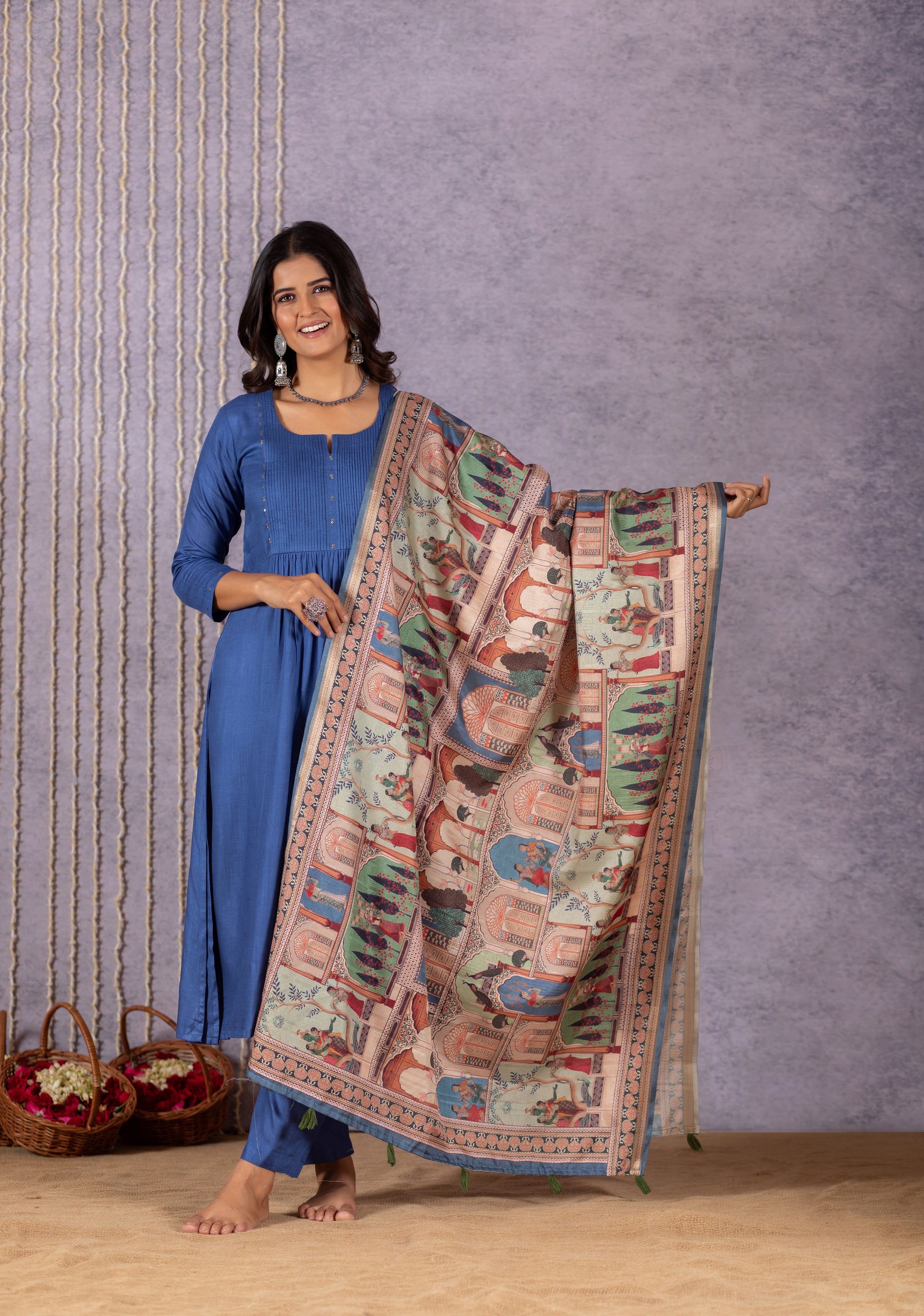 A beautiful blue suit set paired with a stunning printed dupatta. The soft fabric flows beautifully and feels super comfortable. Perfect for festive days or a graceful everyday look.