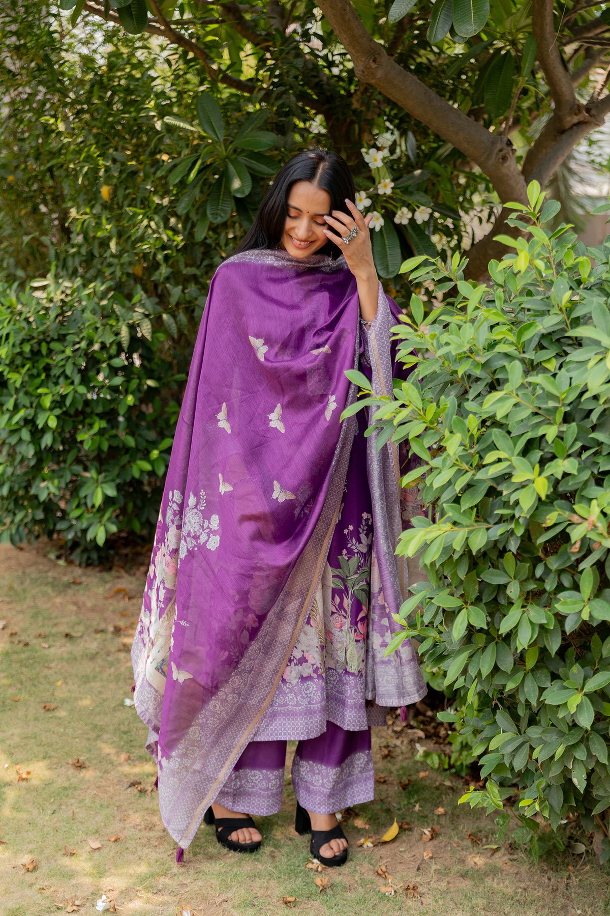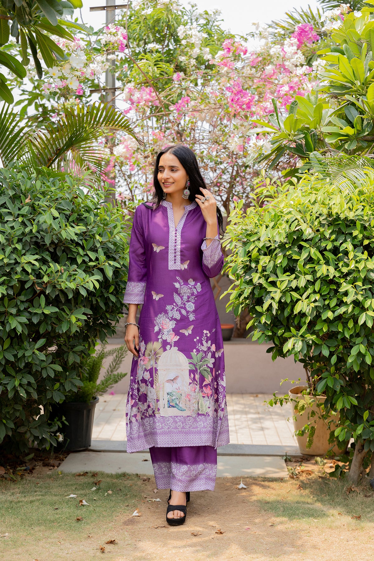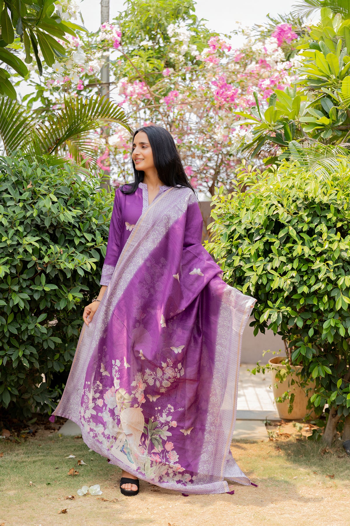 Step into effortless elegance with this beautifully crafted purple suit set, designed to blend comfort with timeless charm. The kurta features delicate floral and butterfly prints with a refined neckline, adding a soft feminine touch. Paired with matching bottoms and a lightweight printed dupatta adorned with intricate motifs and a graceful border, this set is perfect for day outings, festive gatherings, or casual celebrations.