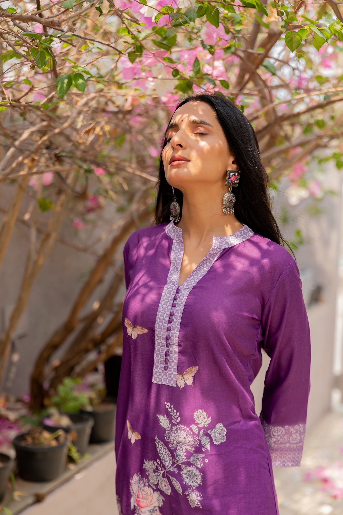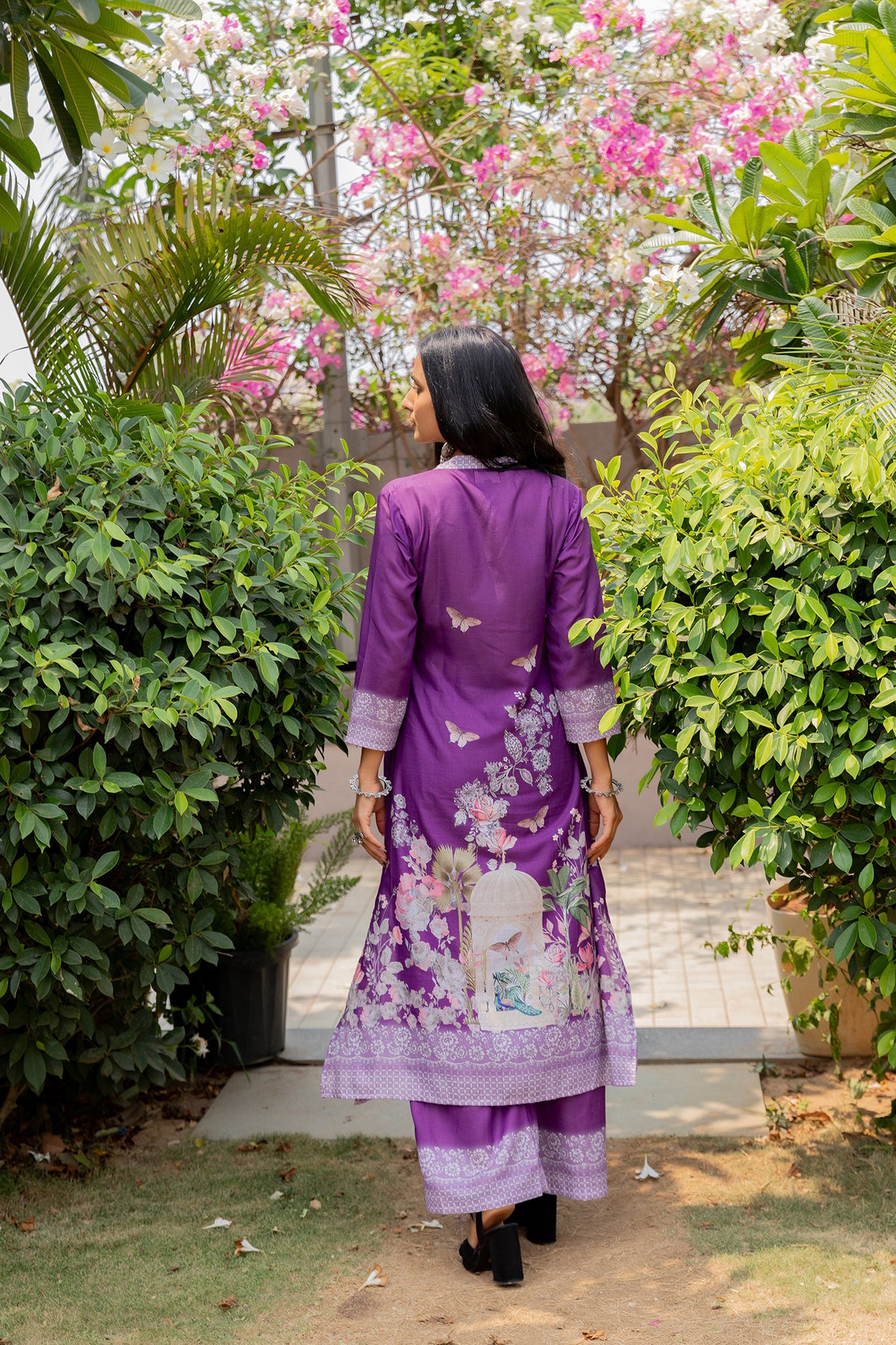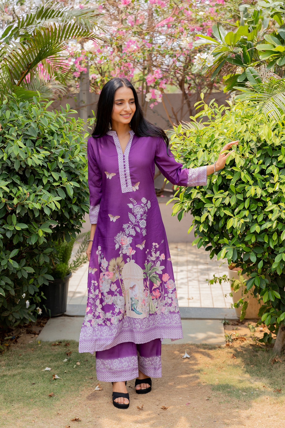 Step into effortless elegance with this beautifully crafted purple suit set, designed to blend comfort with timeless charm. The kurta features delicate floral and butterfly prints with a refined neckline, adding a soft feminine touch. Paired with matching bottoms and a lightweight printed dupatta adorned with intricate motifs and a graceful border, this set is perfect for day outings, festive gatherings, or casual celebrations.