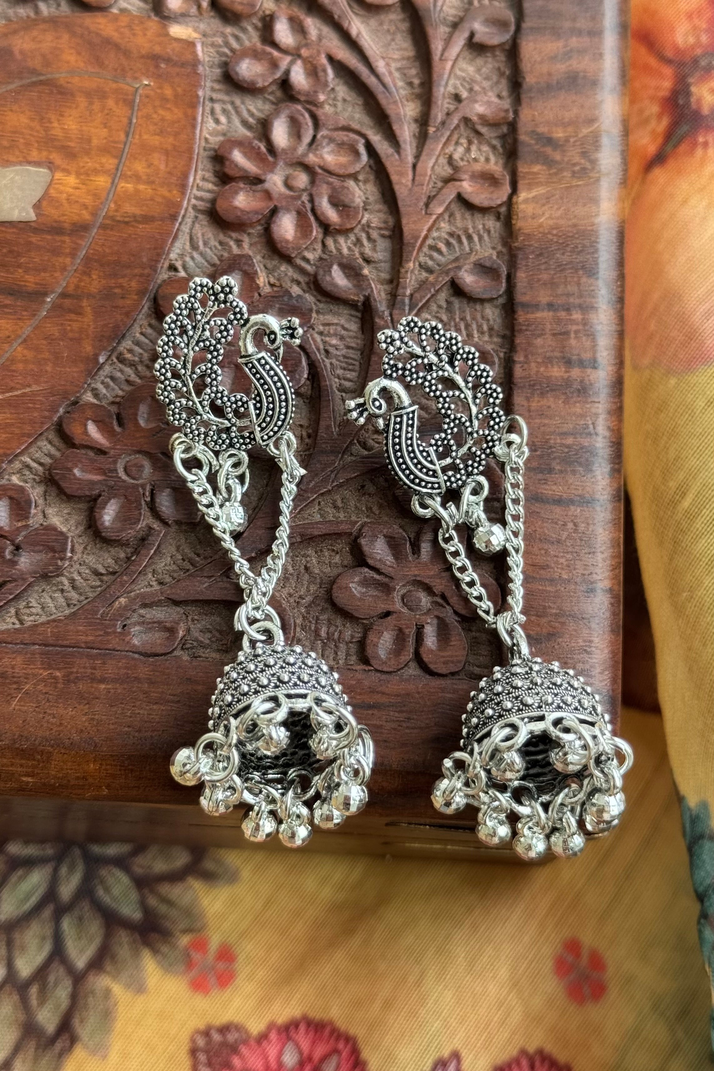 Peacock-inspired oxidised earrings with fine beaded textures. Chain-linked jhumkas and ghungroo details add depth and charm. Perfect for elevating traditional and festive looks.