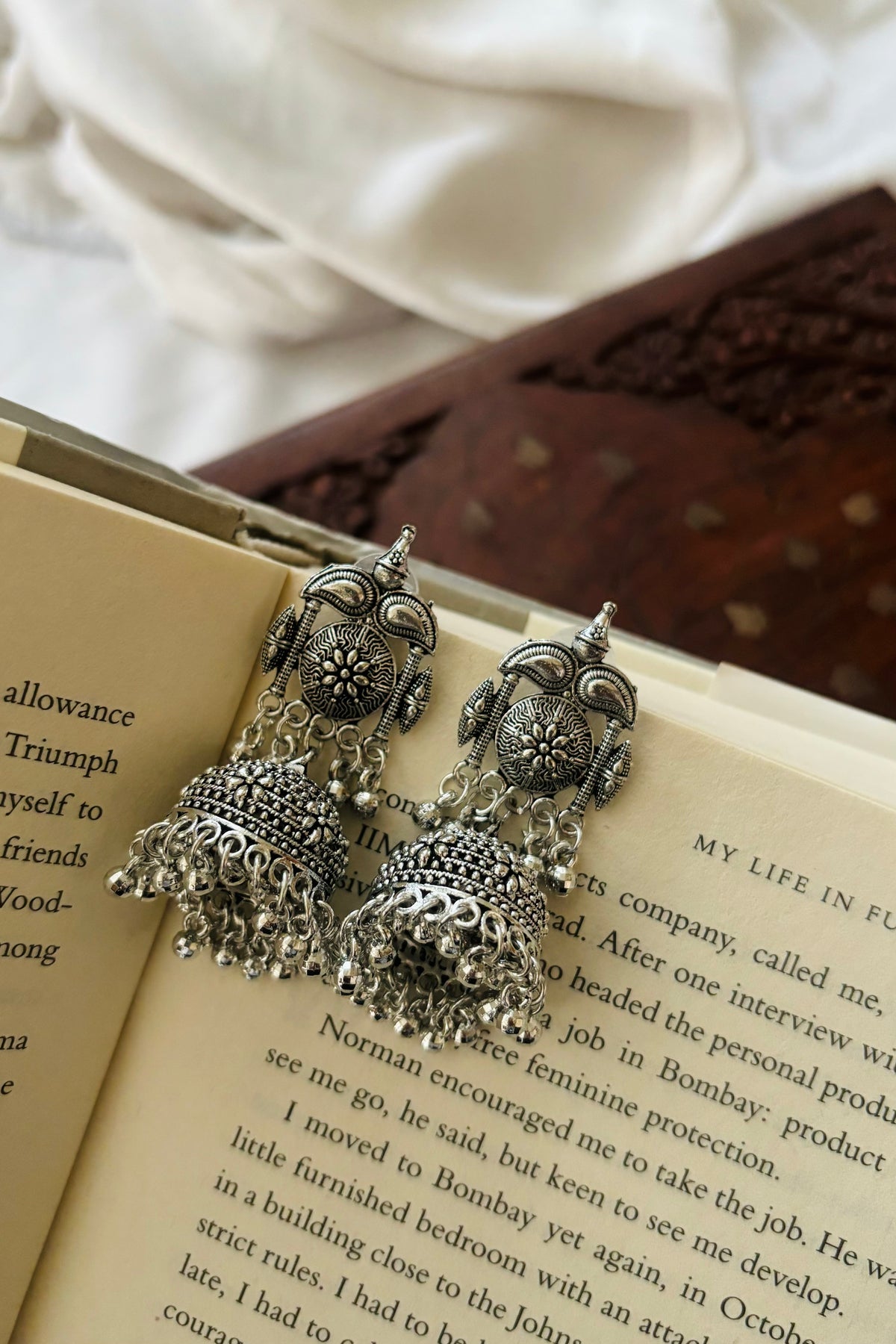 Made in oxidised silver tones, the jhumkas have detailed carvings, tiny ghungroo drops, and traditional patterns that give a vintage look. They’re lightweight, comfortable, and perfect to wear all day.